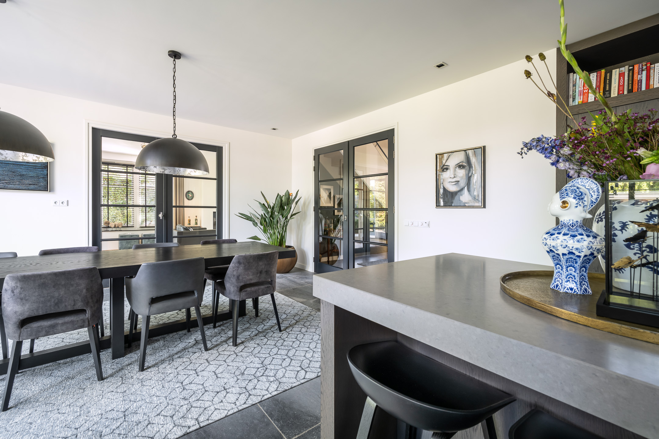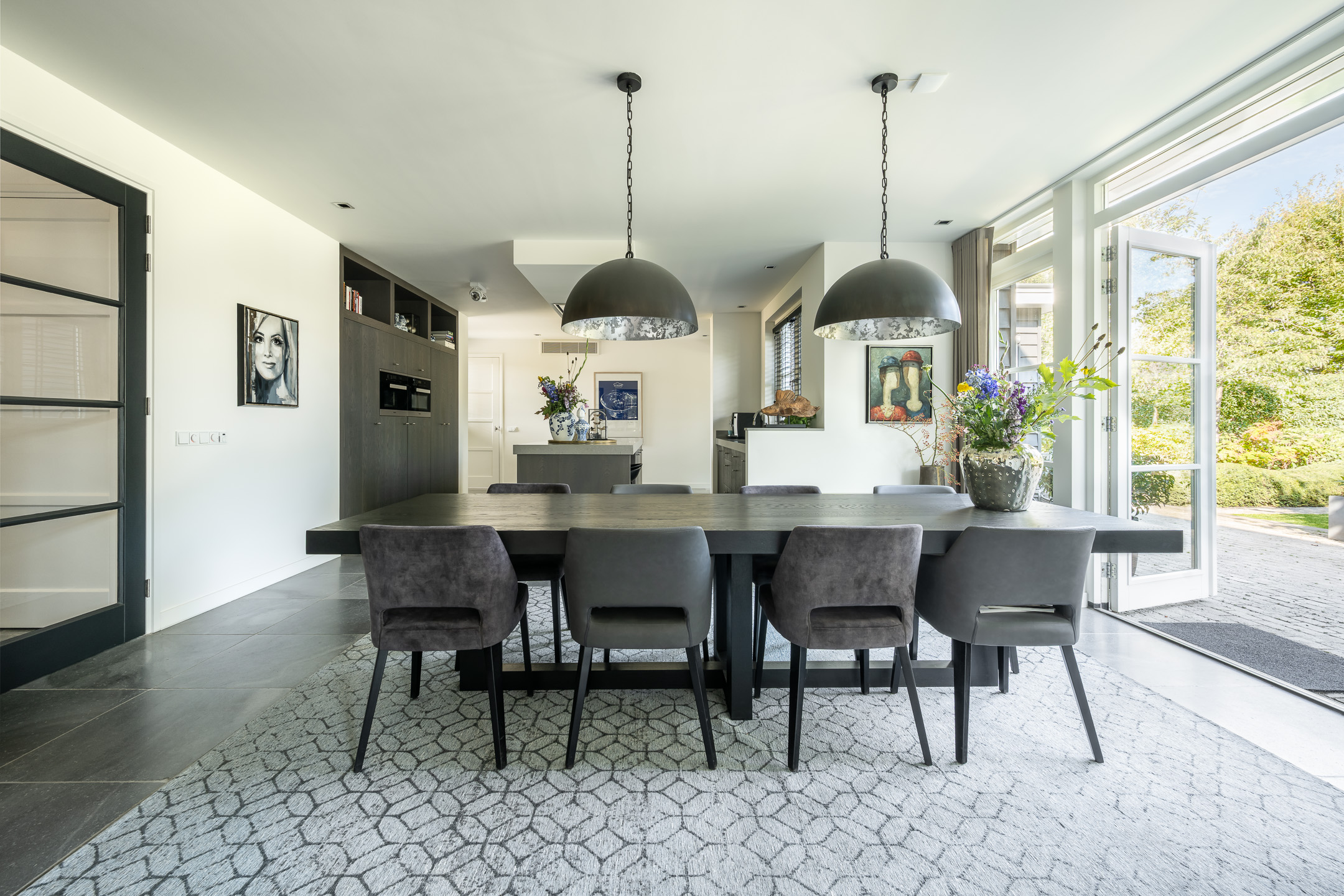 De begane grond biedt verder een ruime woonkamer met en-suite deuren, dubbele tuindeuren en een sfeervolle verbinding met het eetgedeelte en de keuken. De keuken vormt het kloppend hart van de woning en combineert stijl met functionaliteit. Het royale kookeiland met natuurstenen blad is voorzien van een elegante bar, perfect voor een informeel ontbijt of een goed glas wijn tijdens het koken. De keuken beschikt over hoogwaardige Miele-inbouwapparatuur en twee aparte wasbakken: een ruime spoelbak voor dagelijks gebruik en een tweede met Quooker voor direct kokend water. Een aparte koffiehoek en dubbele tuindeuren naar de tuin maken deze luxe leefkeuken compleet. Vanuit de keuken is toegang tot een speelse extra woonruimte, ideaal als familiekamer of kinderkamer, en tot de bijkeuken/garage met veel kastruimte en wasbak. De overkapping met buitenberging sluit perfect aan op het buitenleven.