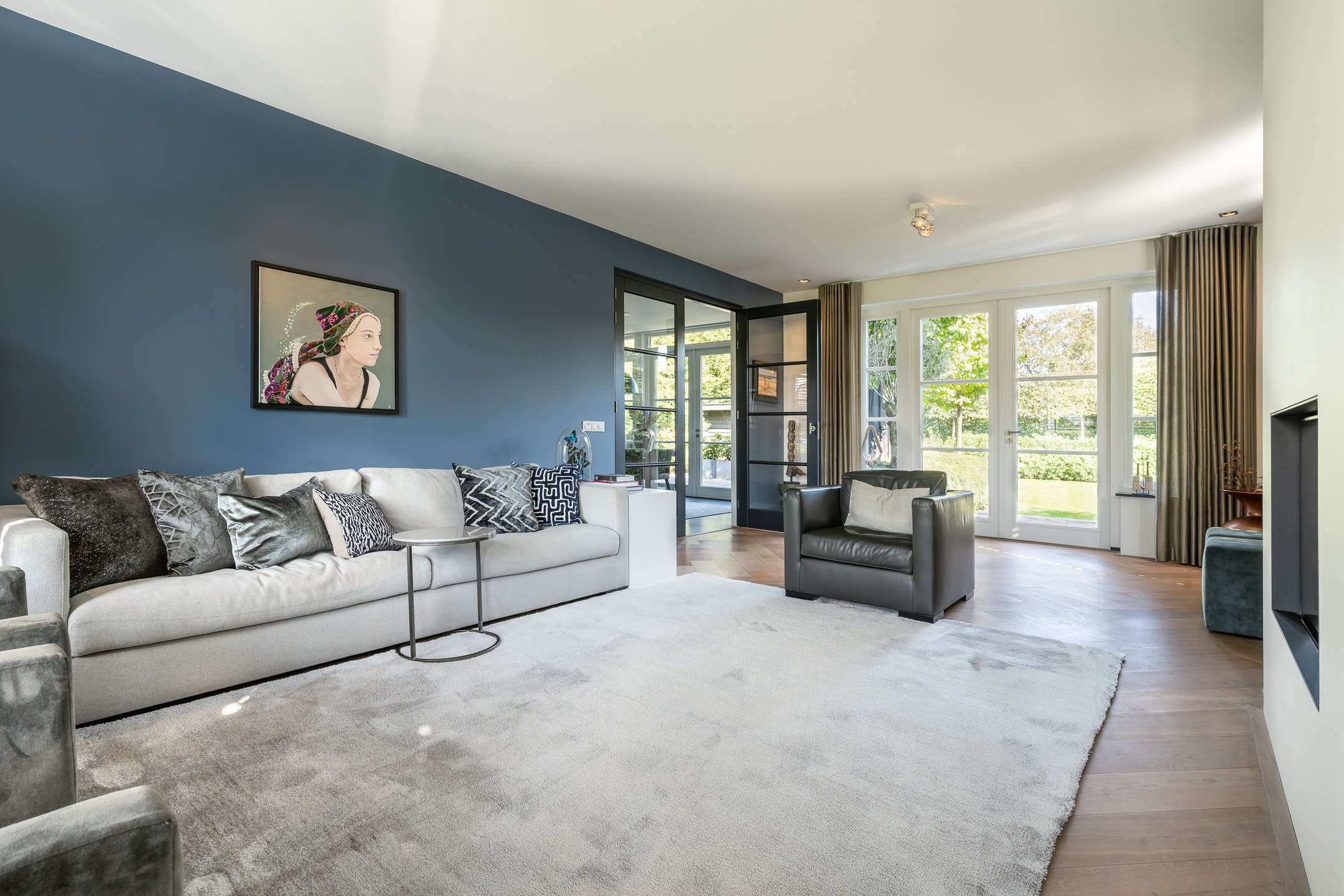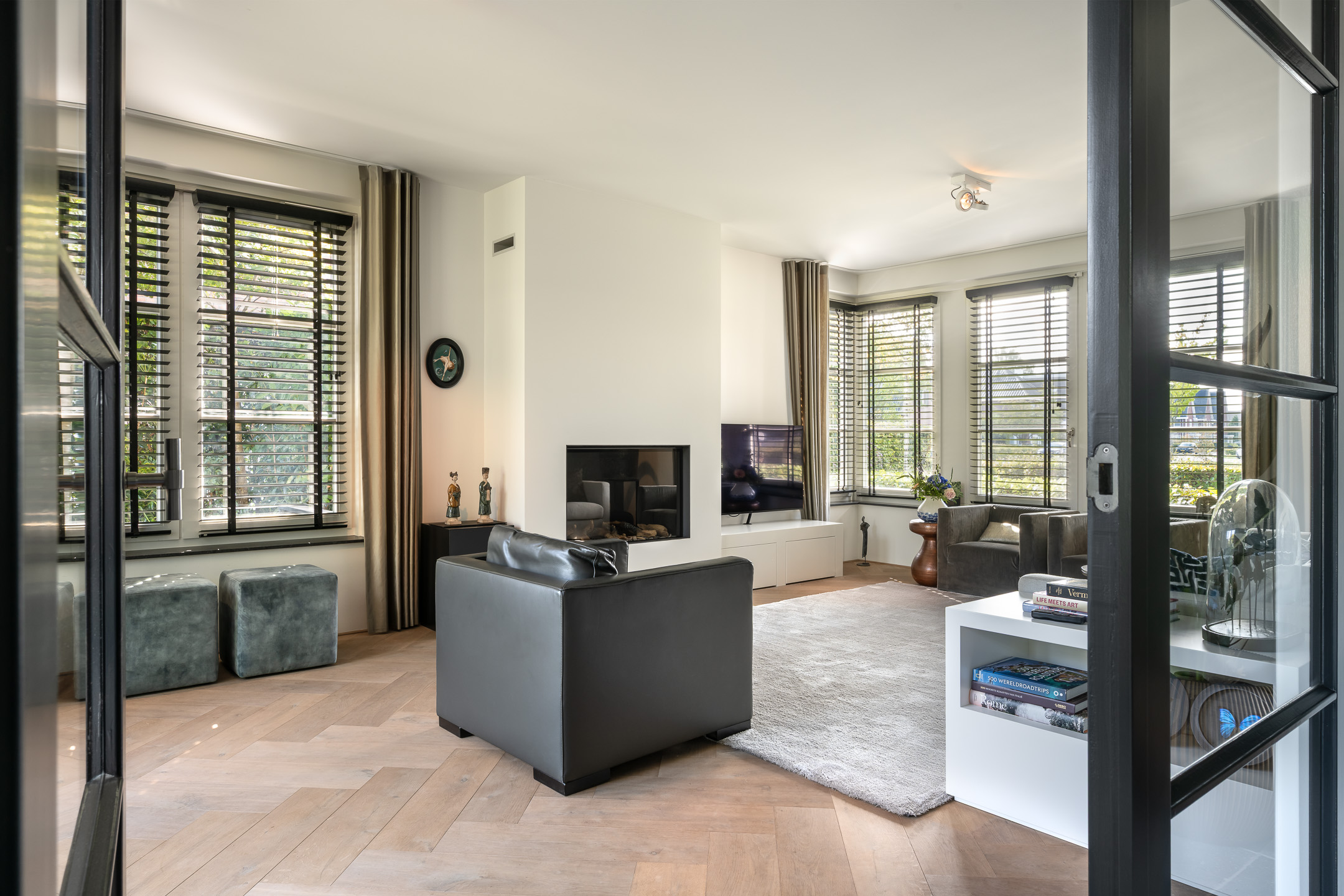 - Royale woonkamer met veel lichtinval, sfeervolle gashaard en dubbele tuindeuren;