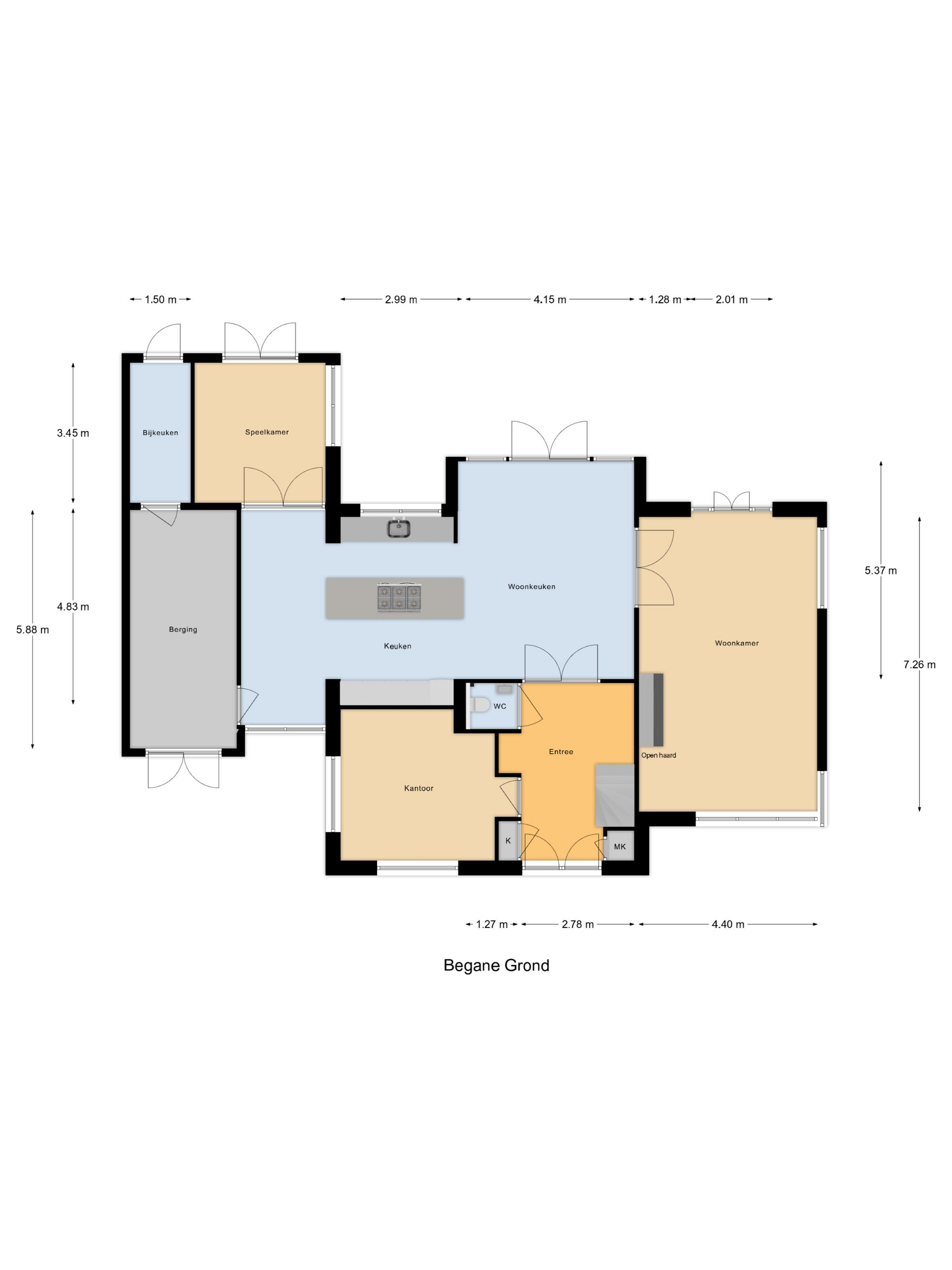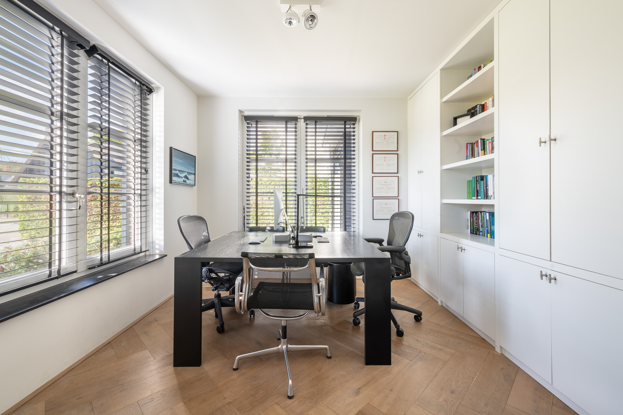 - Begane grond: luxe kantoorruimte met op maat gemaakte kasten, bijkeuken/garage met vaste kastenwanden;