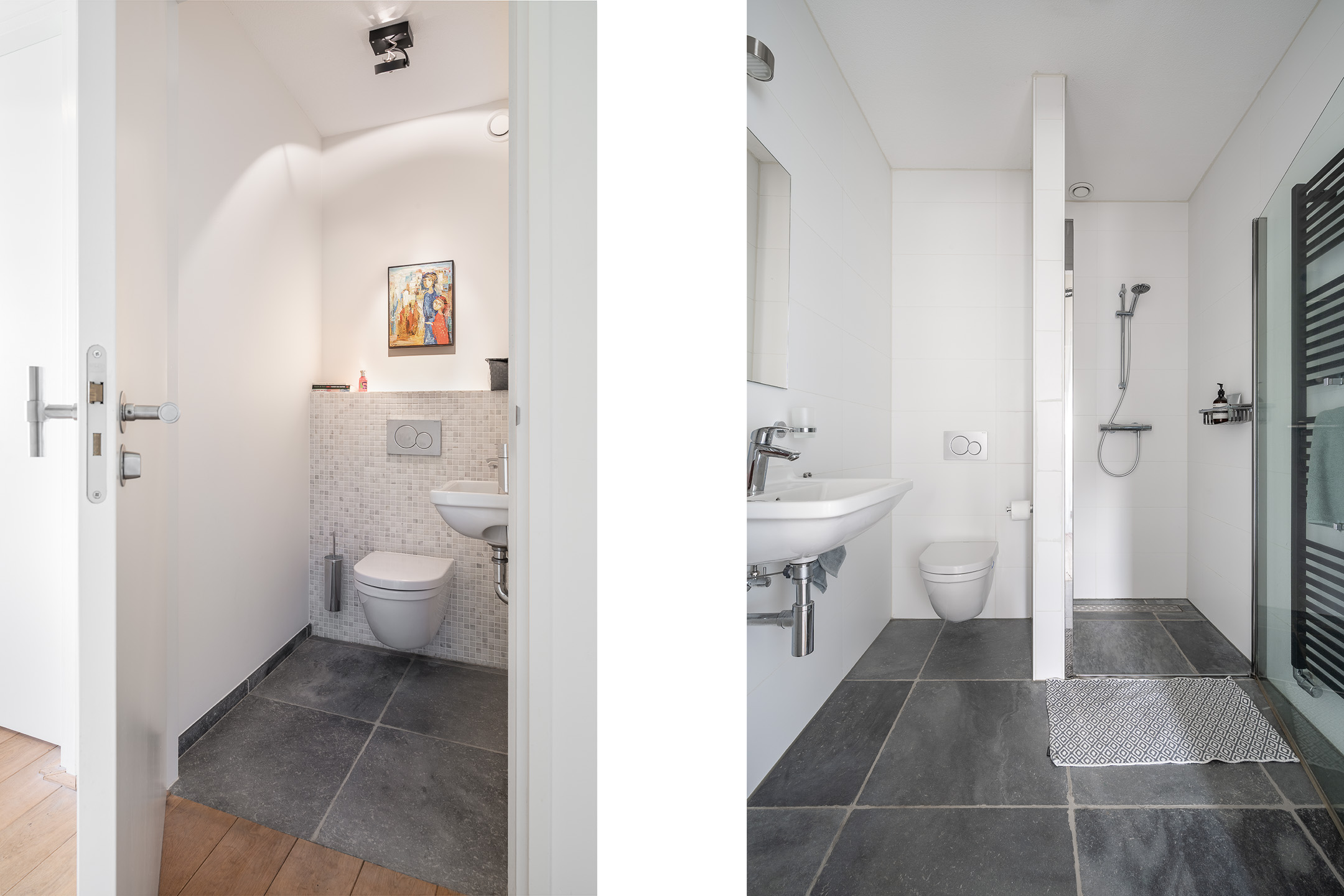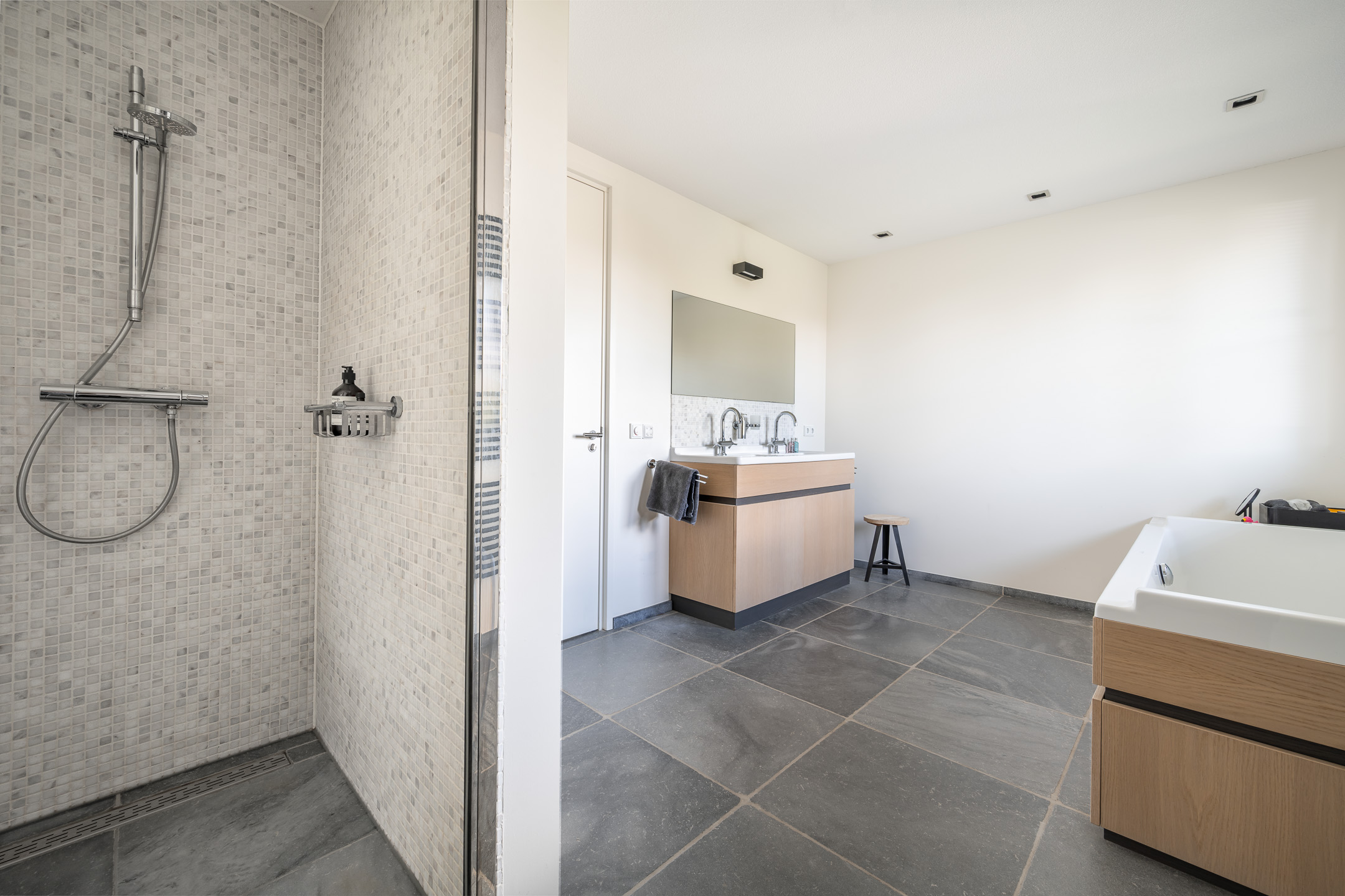 - Ligbad, dubbele wastafel, wastafelmeubel, inloopdouche, vloerverwarming, toilet en wastafel