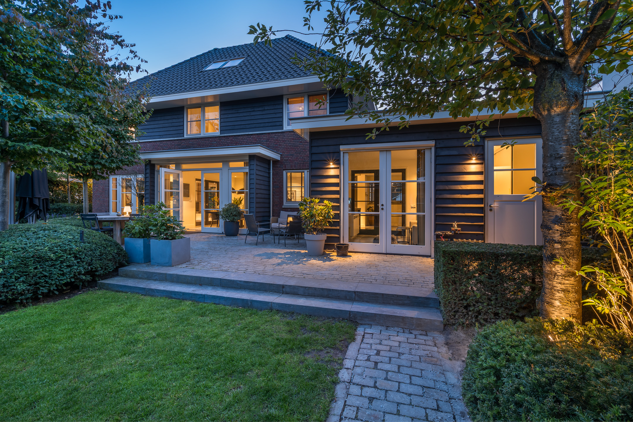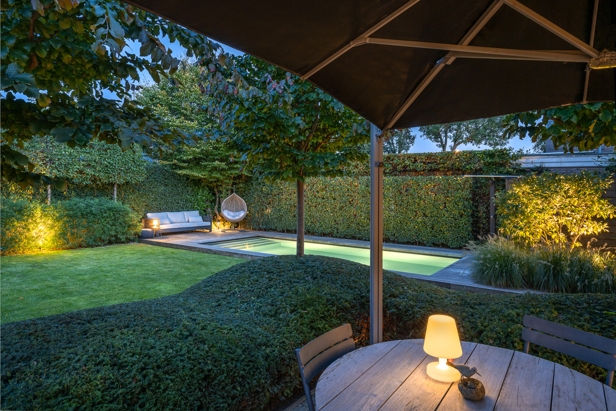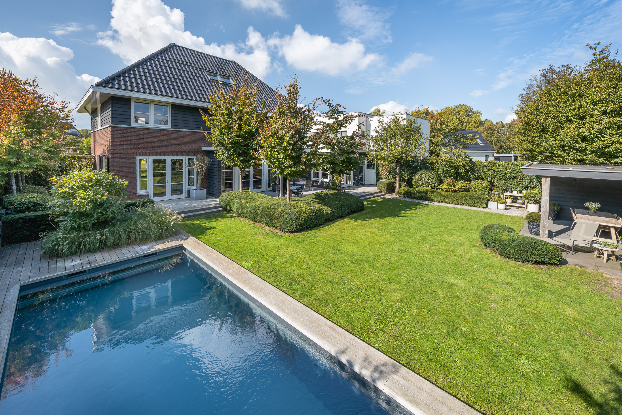 De tuin is een ware oase van rust en privacy met een fraai gazon, meerdere terrassen en borders met volwassen beplanting. Alles is met zorg vormgegeven om een harmonieus geheel te creëren waarin groen, comfort en stijl samenkomen. Dankzij de gunstige ligging geniet u de hele dag door van zon én schaduw, met altijd een plek die past bij het moment. Het verwarmde buitenzwembad vormt een echte blikvanger in deze schitterende tuin. Omringd door een stijlvol houten zonnedek straalt het geheel rust en luxe uit. Het solardek en de warmtepomp zorgen voor een aangename watertemperatuur, zodat u van vroeg in het voorjaar tot laat in het najaar kunt genieten van een verfrissende duik. De overkapping met berging biedt extra comfort en veelzijdigheid. Hier creëert u moeiteloos een sfeervolle loungehoek of een beschutte eetplek waar u tot in de late uurtjes buiten kunt zitten. De subtiele verlichting en het uitzicht op de tuin versterken de serene sfeer en maken dit een plek waar binnen en buiten naadloos in elkaar overlopen.