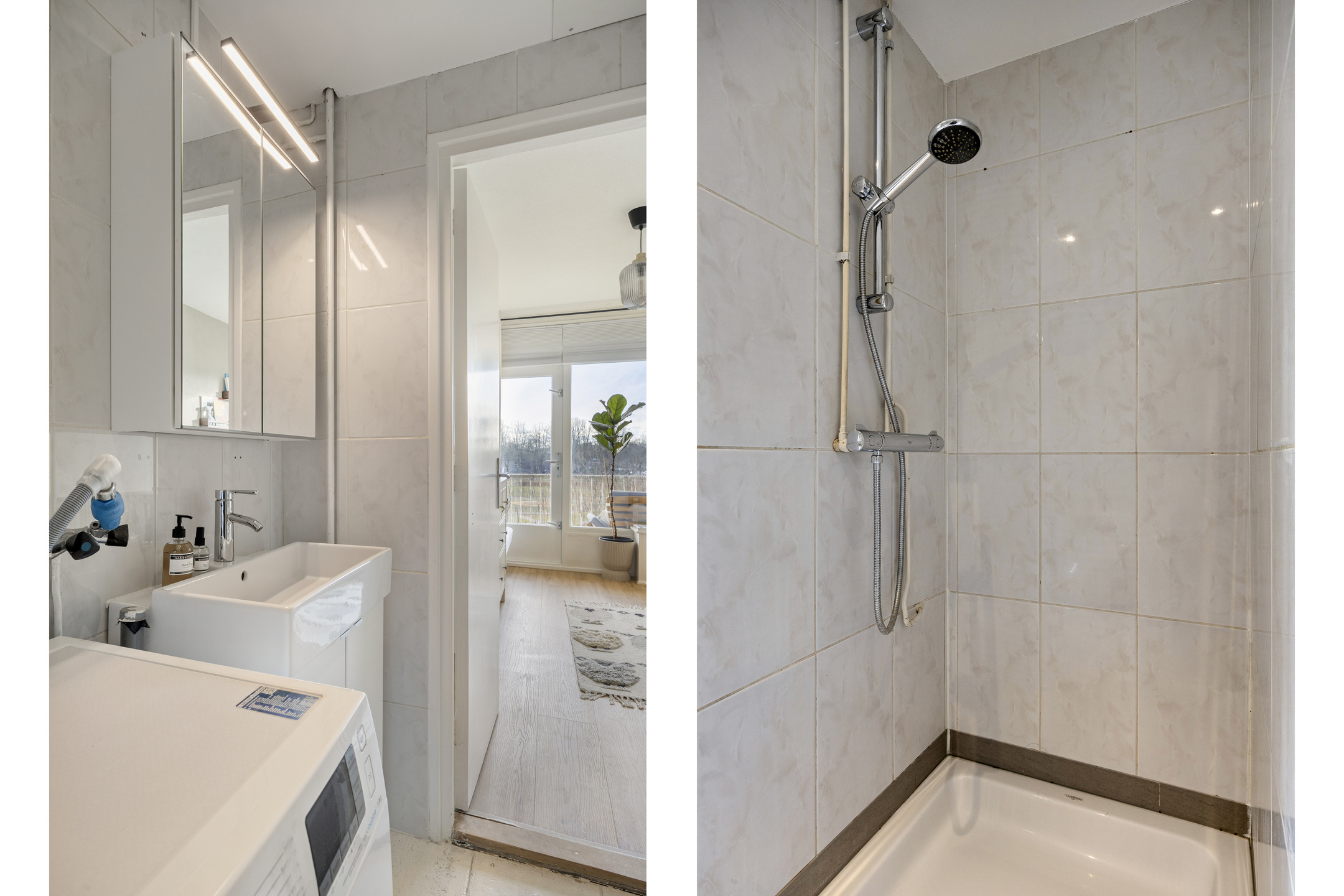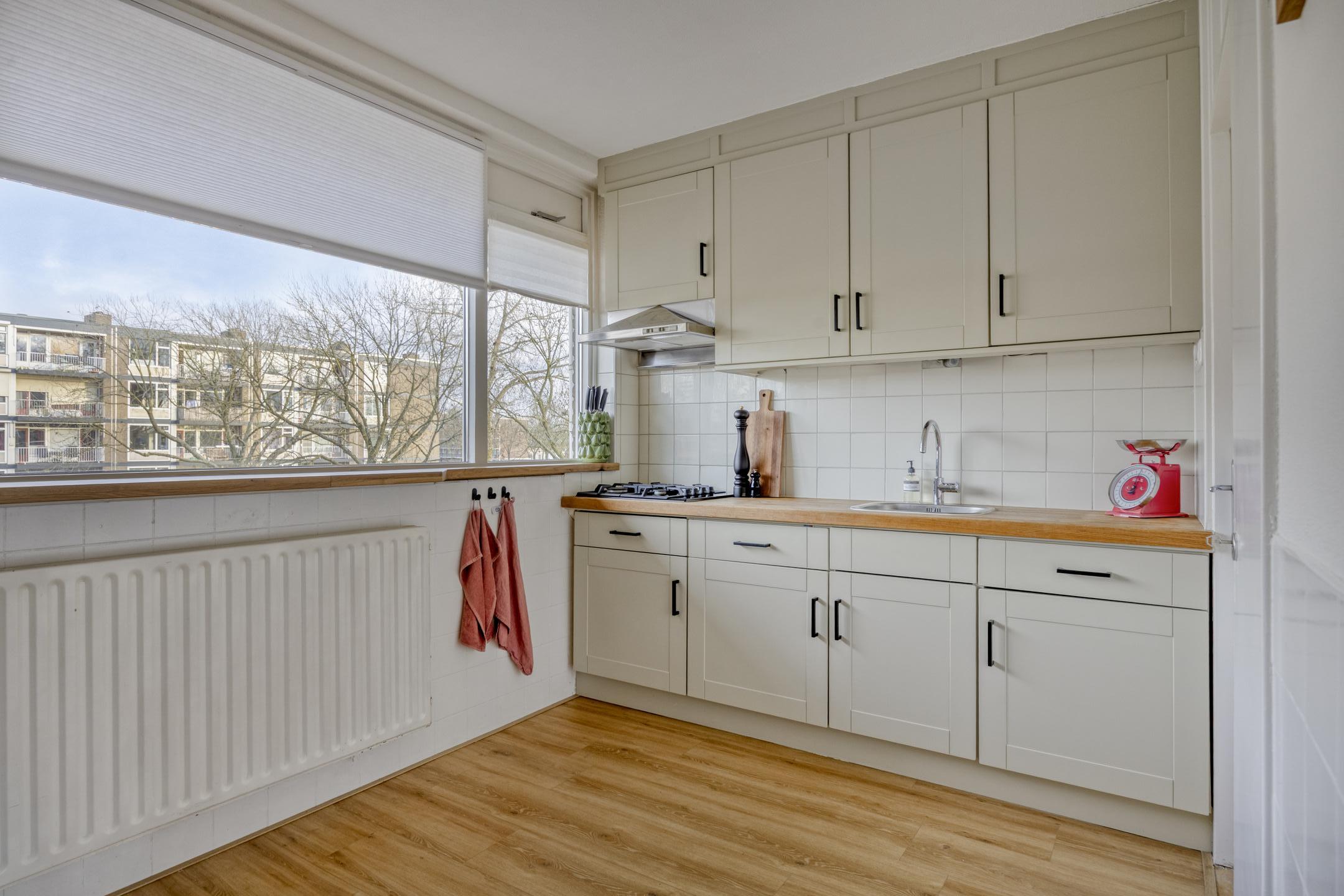 De recent gemoderniseerde keuken beschikt over een functionele opstelling met voldoende werk- en kastruimte. Vanuit de keuken is er toegang tot de badkamer. De badkamer is netjes afgewerkt en voorzien van een douche, wastafelmeubel en aansluiting voor de wasapparatuur.