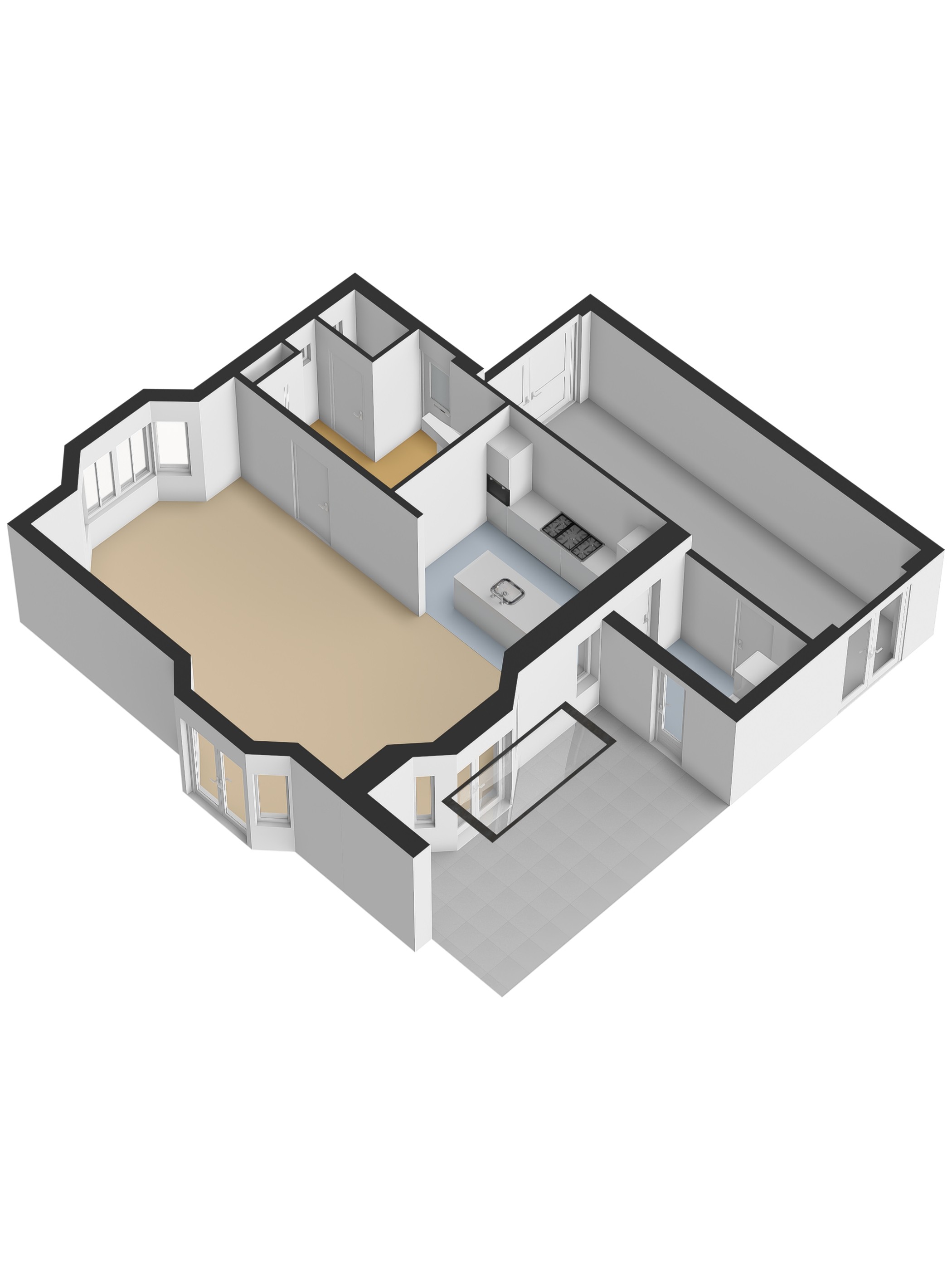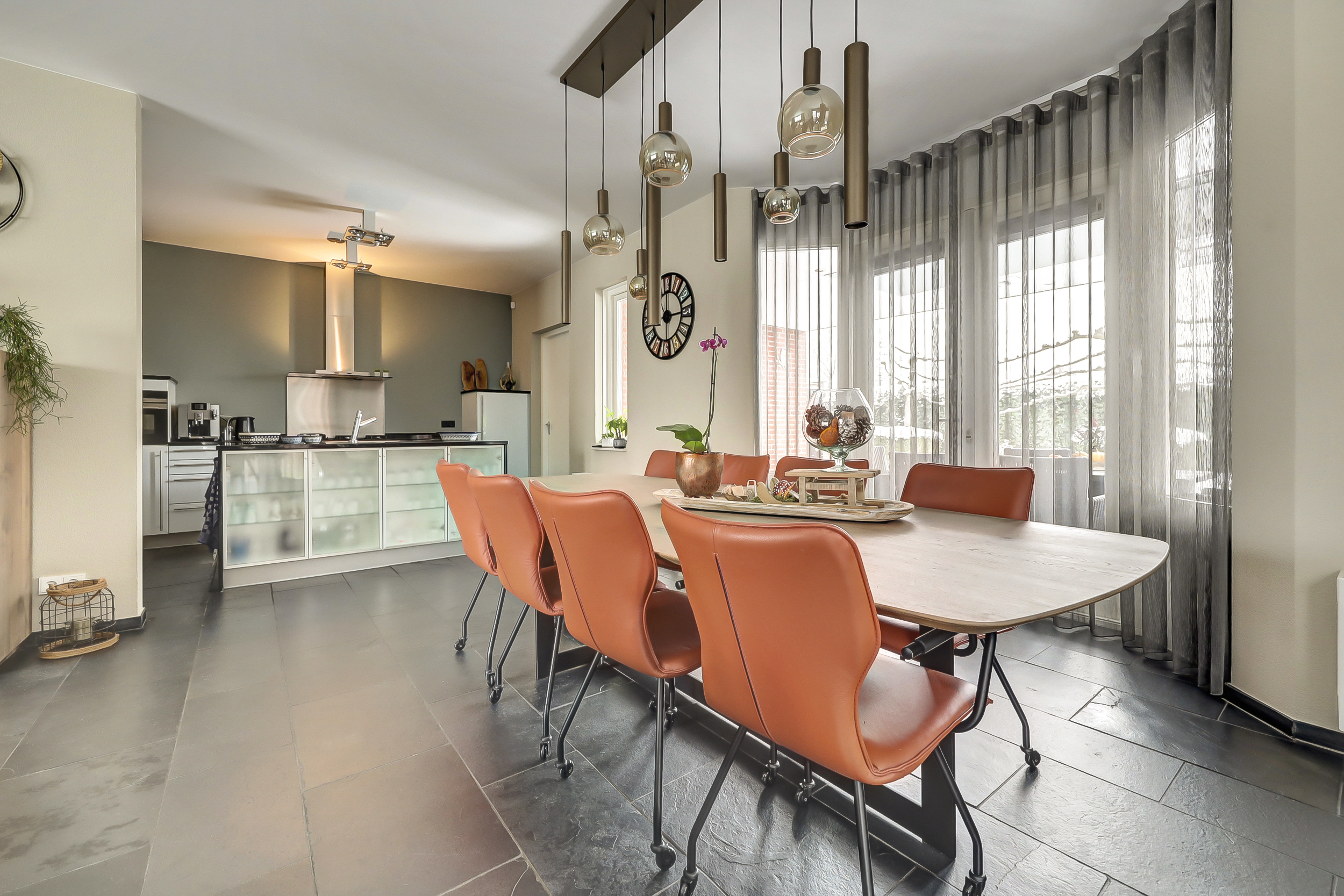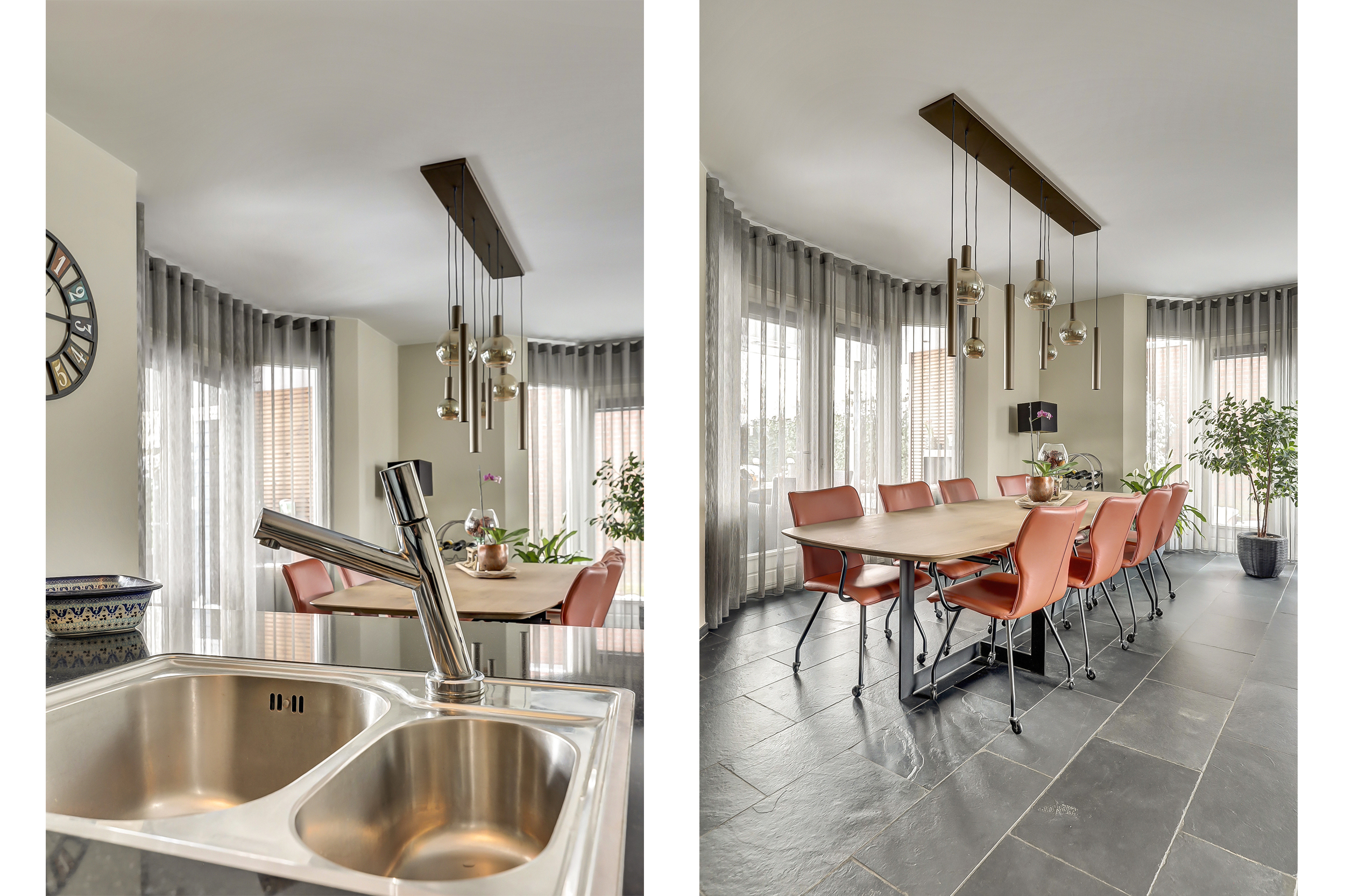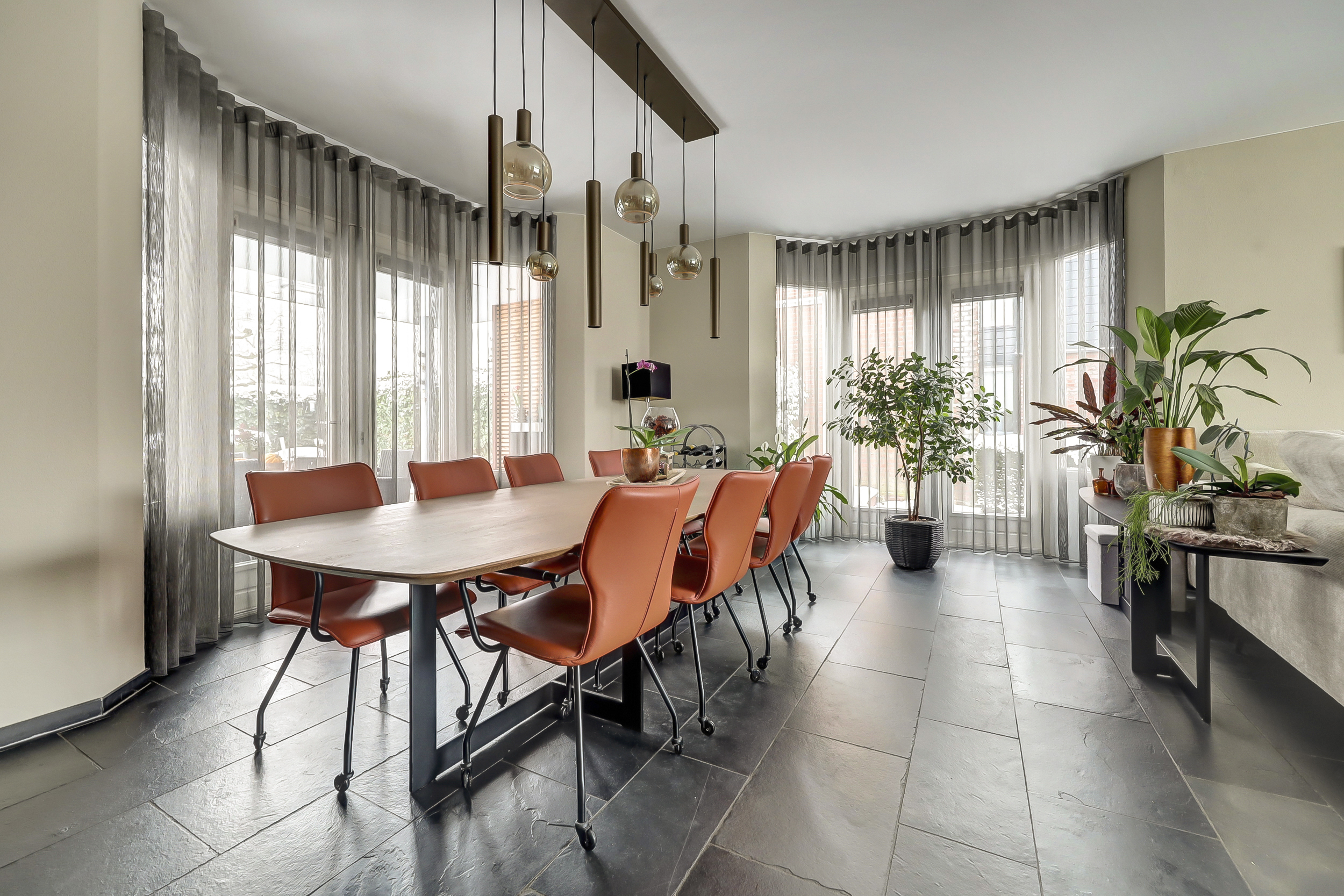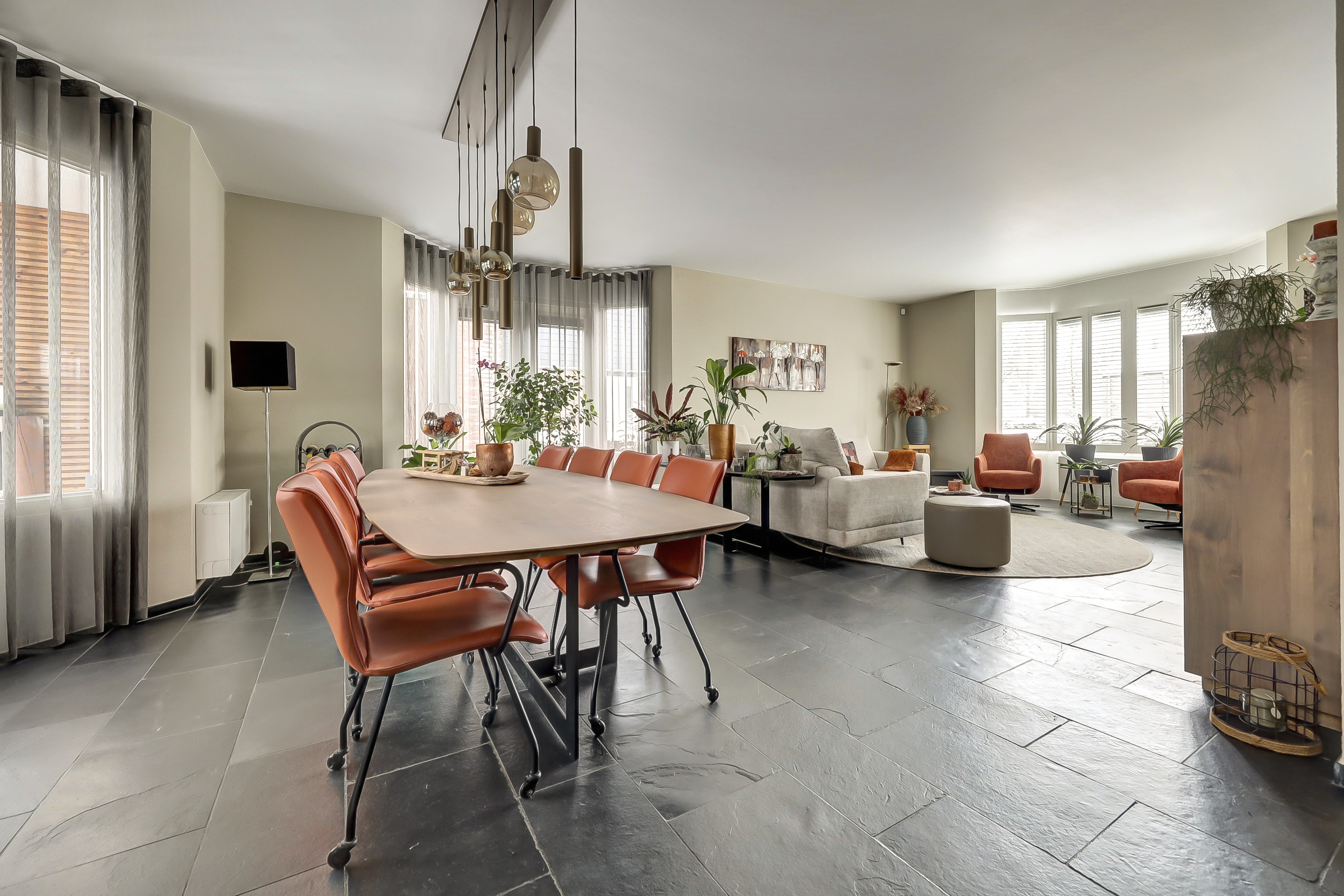 De living is opvallend licht dankzij de grote raampartijen en drie karakteristieke erkers, die zorgen voor een speels en ruimtelijk effect. Twee erkers zijn voorzien van openslaande tuindeuren, waardoor binnen en buiten naadloos in elkaar overlopen. De donkere leistenen vloer met vloerverwarming geeft de ruimte een luxe en comfortabele uitstraling.