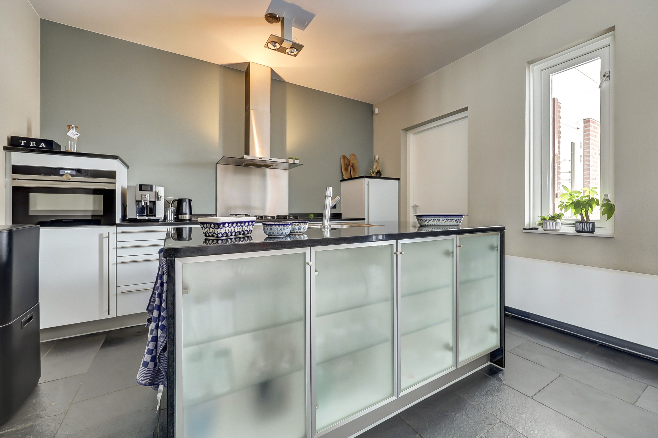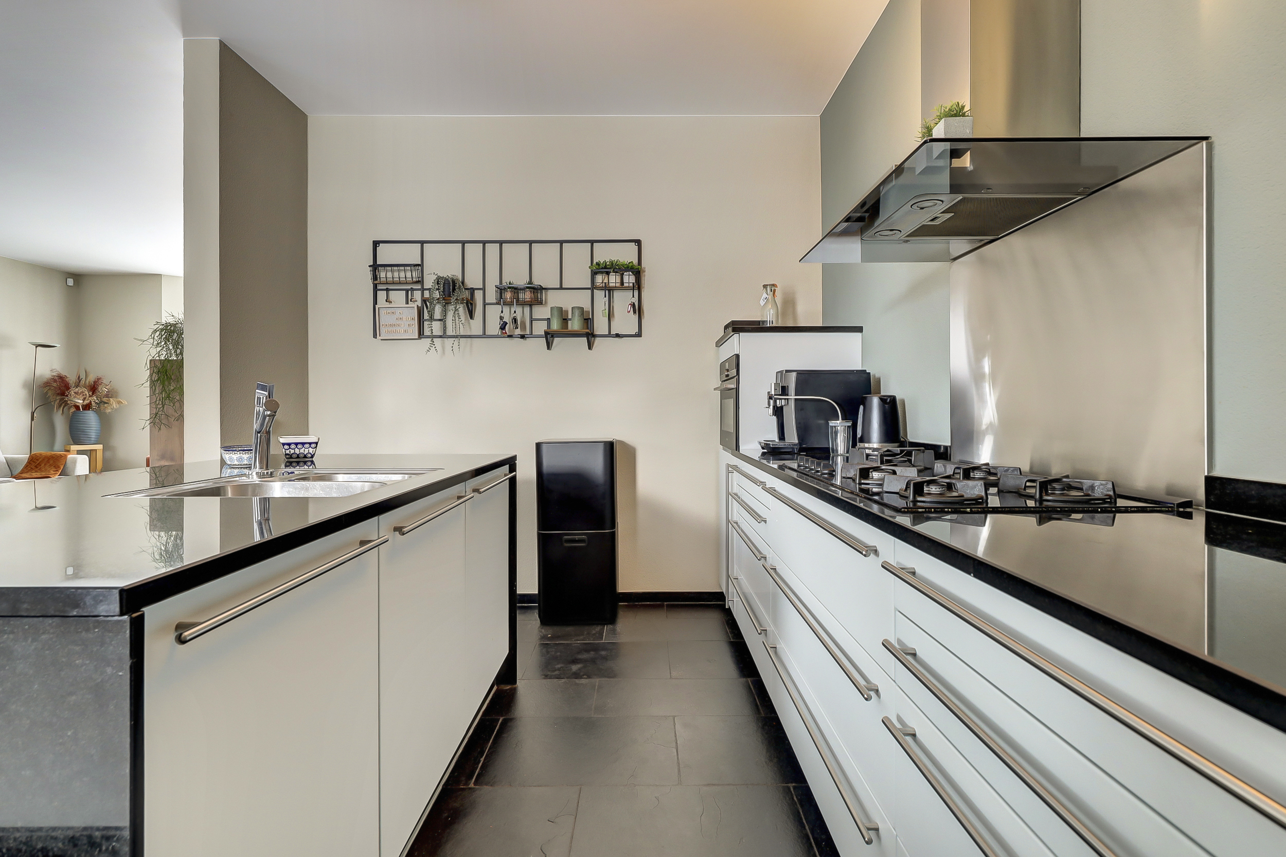 Aan de achterzijde bevindt zich de open woonkeuken, uitgevoerd met een wandopstelling en een spoeleiland met extra werkruimte. De keuken is voorzien van een granieten werkblad en complete inbouwapparatuur, waaronder een vaatwasser, combimagnetron, koelkast en een 5-pits gaskookplaat met afzuigkap. Aansluitend ligt de praktische bijkeuken met aansluitingen voor wasapparatuur en de opstelling van de cv-ketel (2023). De inpandig bereikbare garage is keurig afgewerkt met een tegelvloer en beschikt over openslaande deuren naar de tuin. Deze ruimte is multifunctioneel en kan, indien gewenst, worden omgebouwd tot slaap- en badkamer op de begane grond.