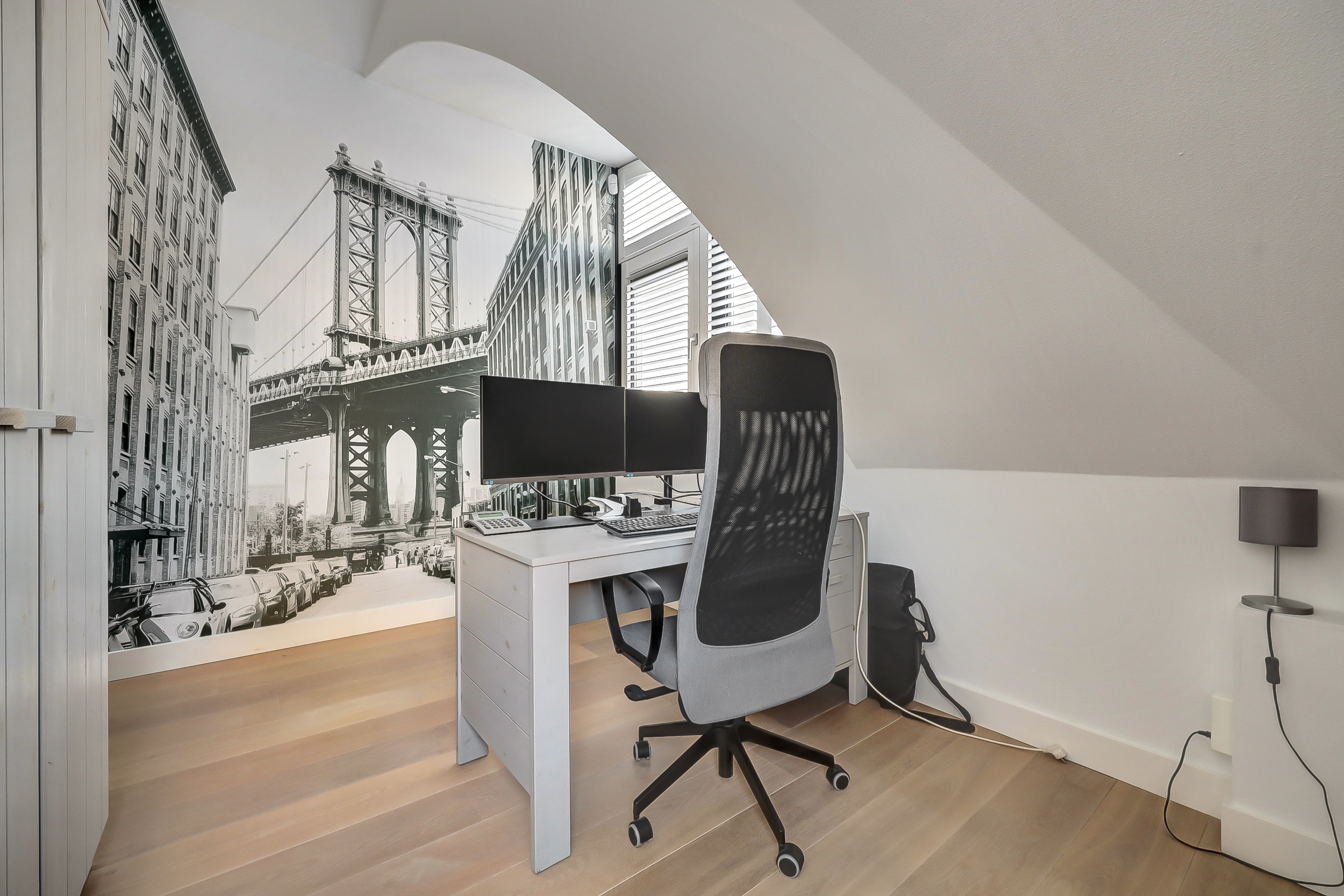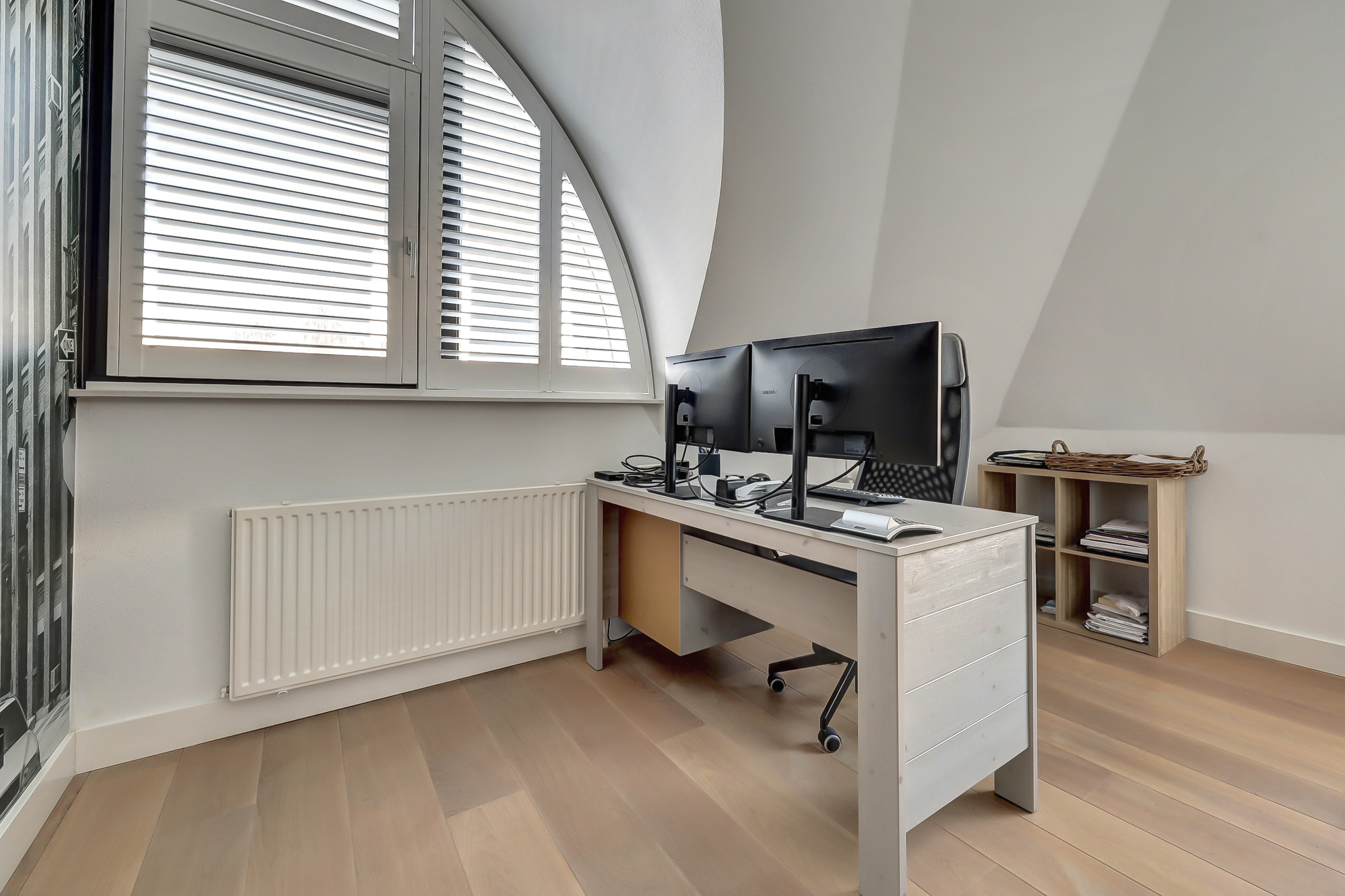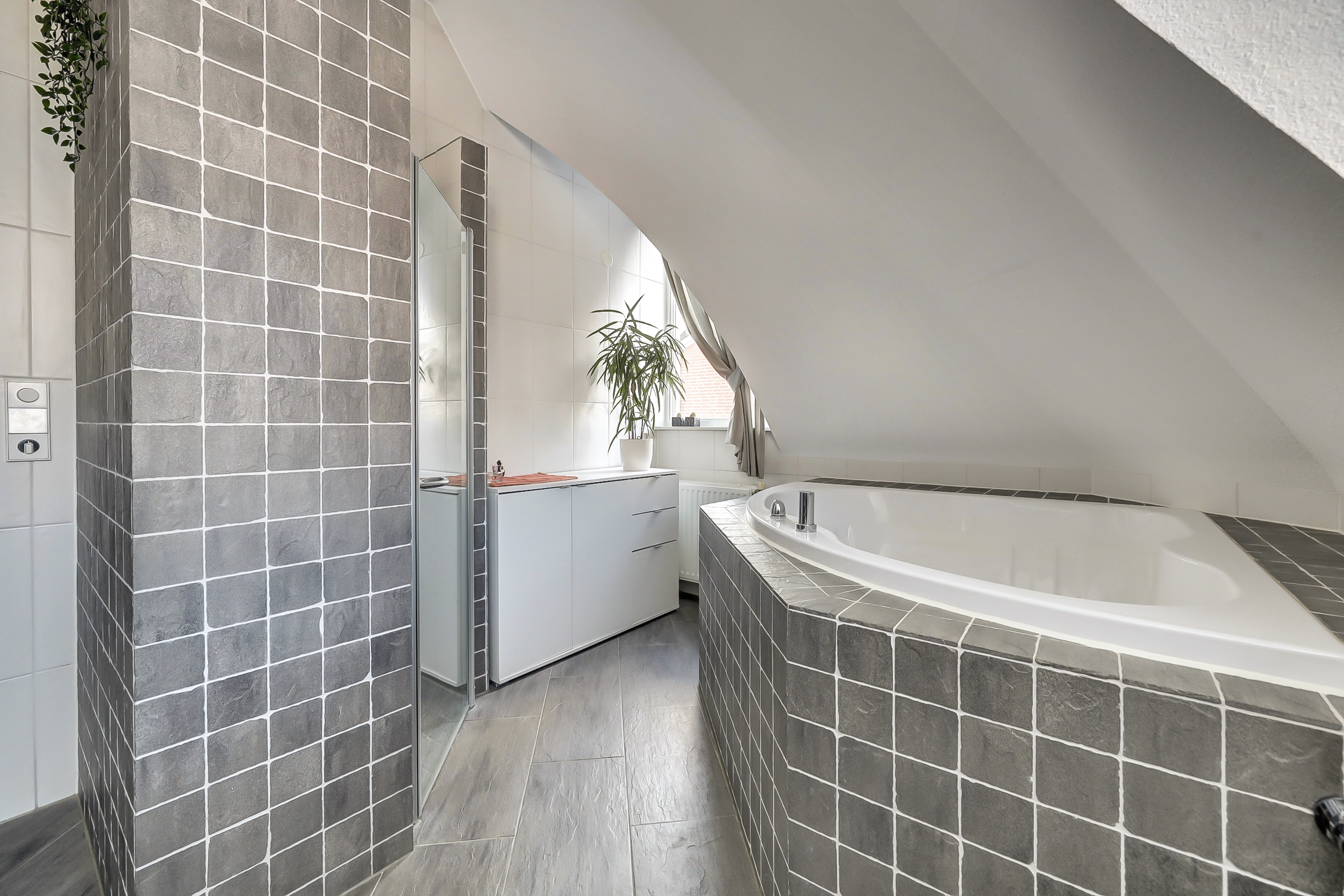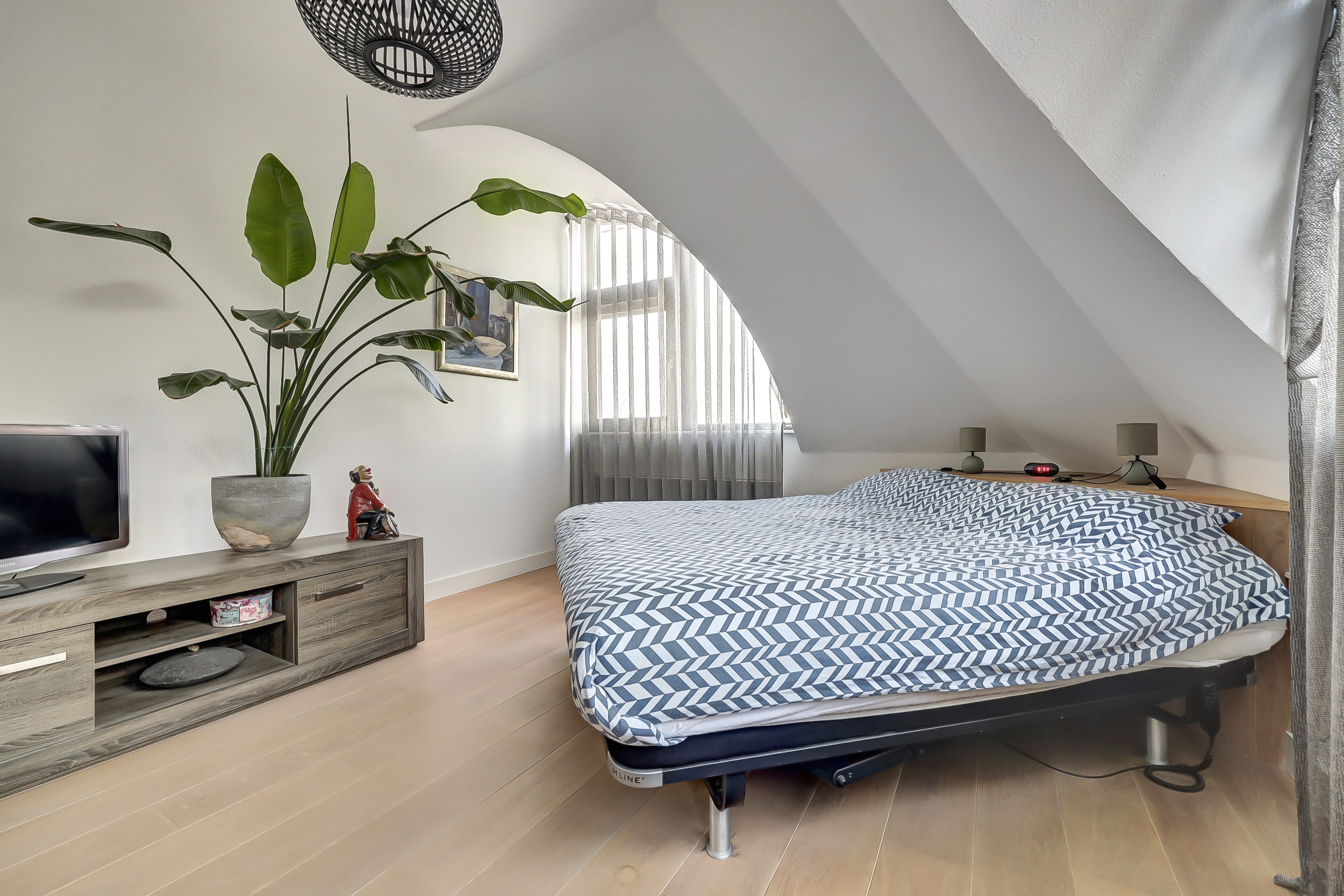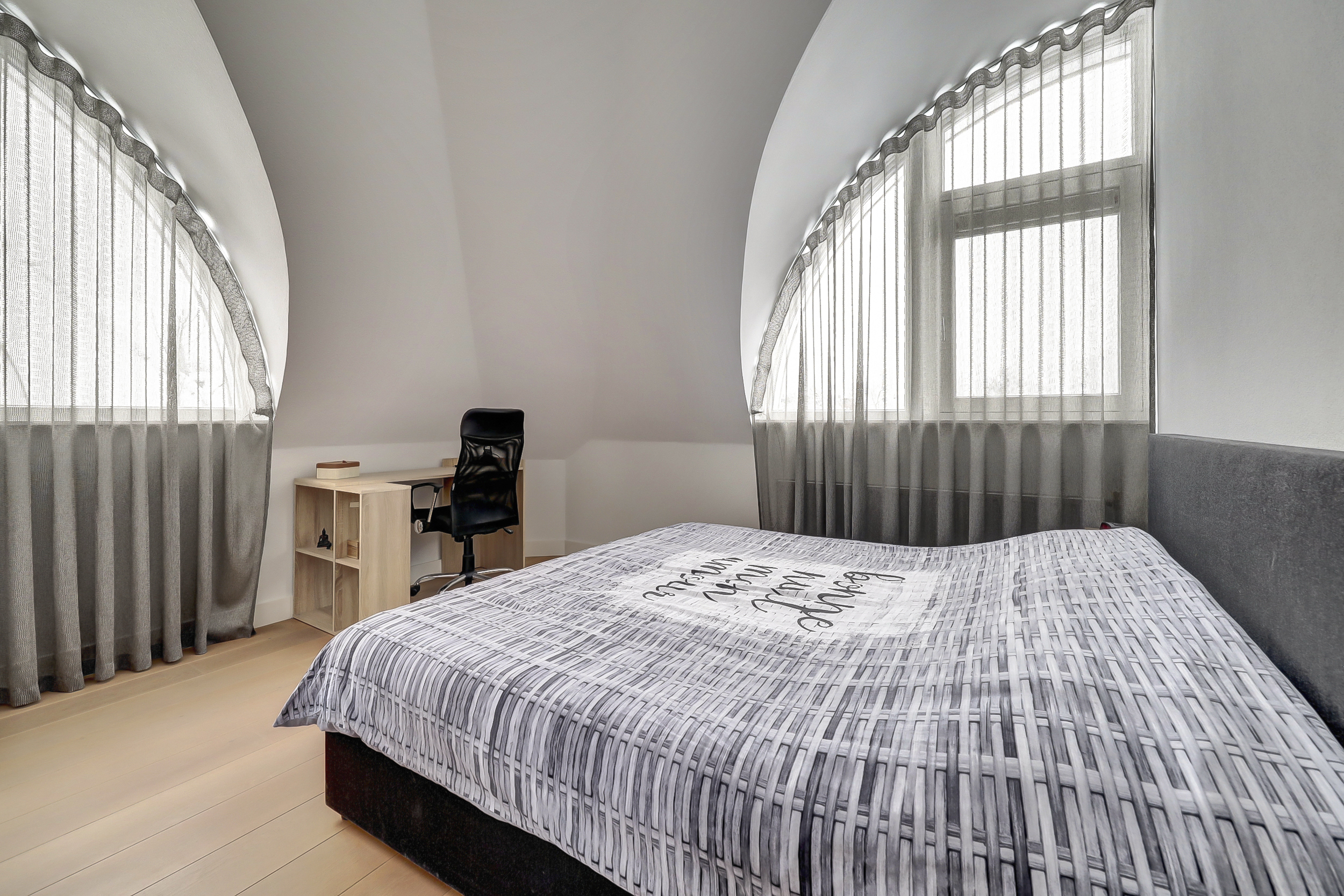 De overloop geeft toegang tot drie zeer ruime slaapkamers en de complete badkamer. Alle slaapkamers profiteren van grote raampartijen dankzij de halfronde dakkapellen. De combinatie van hoge plafonds, ronde raamvormen en rechte kamers zorgt voor een speelse en lichte verdieping. De vloer is afgewerkt met een eiken parketvloer. De badkamer is royaal en compleet ingericht met een bubbelbad, douche, wastafel en een zwevend wandtoilet. Via een vlizotrap is de praktische bergzolder bereikbaar, ideaal voor het opslaan van seizoensgebonden spullen.