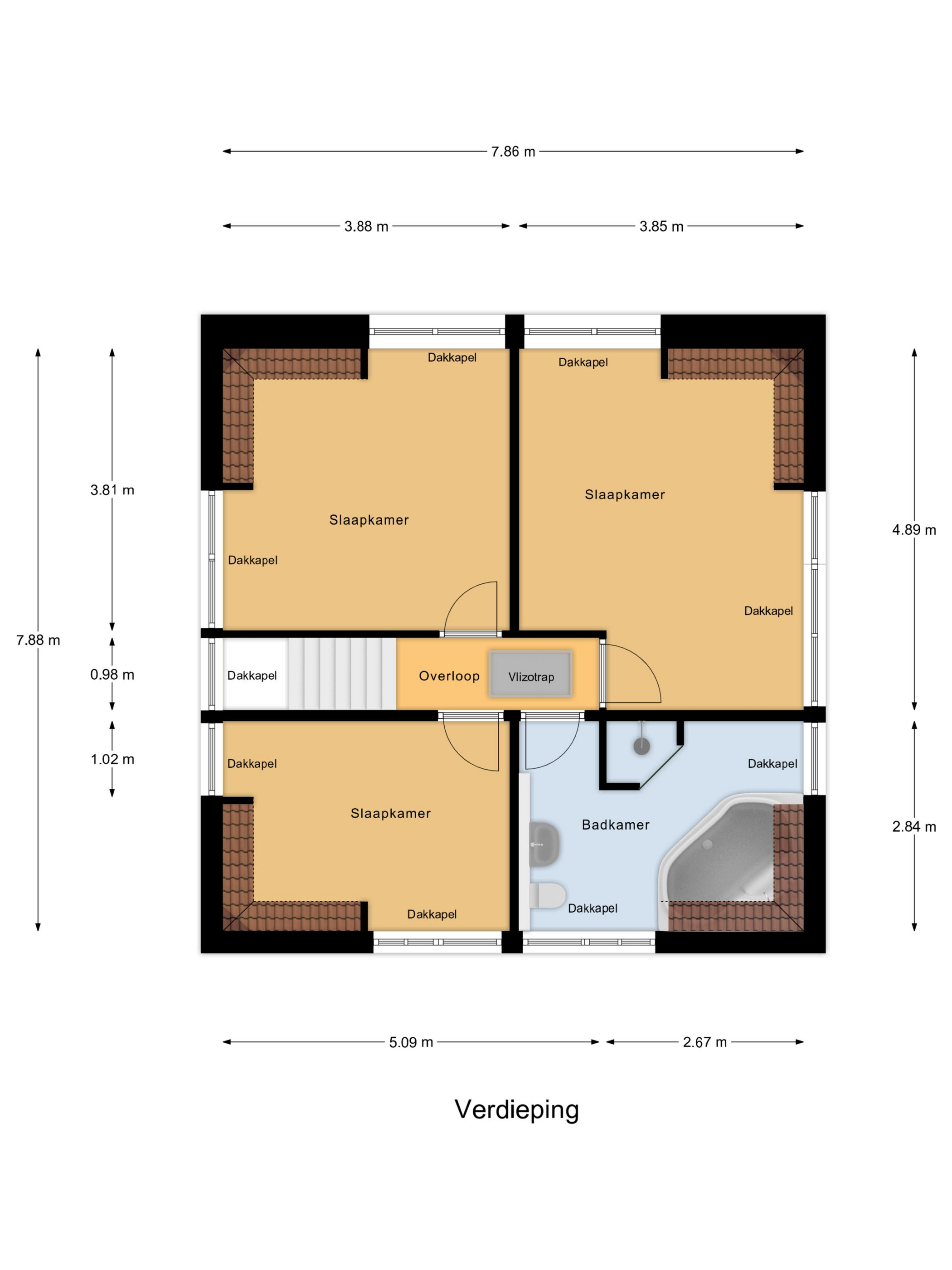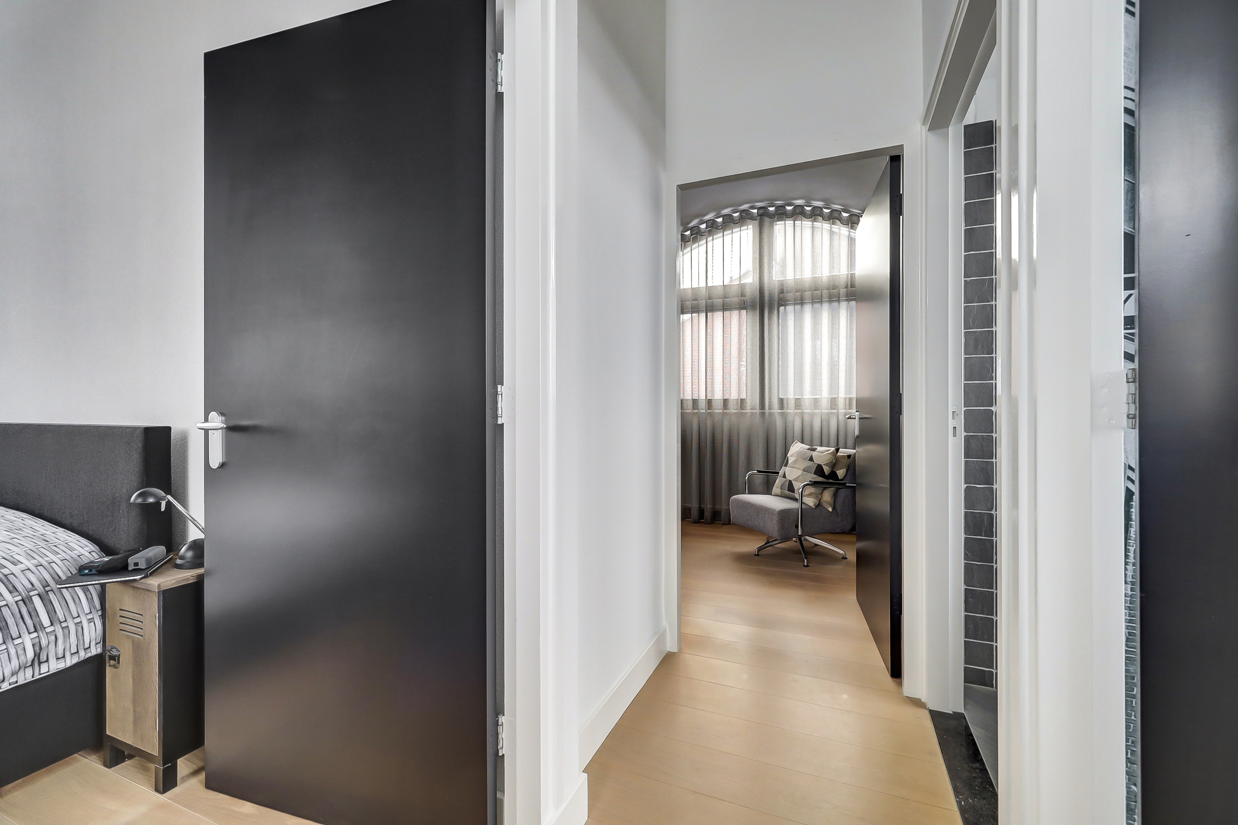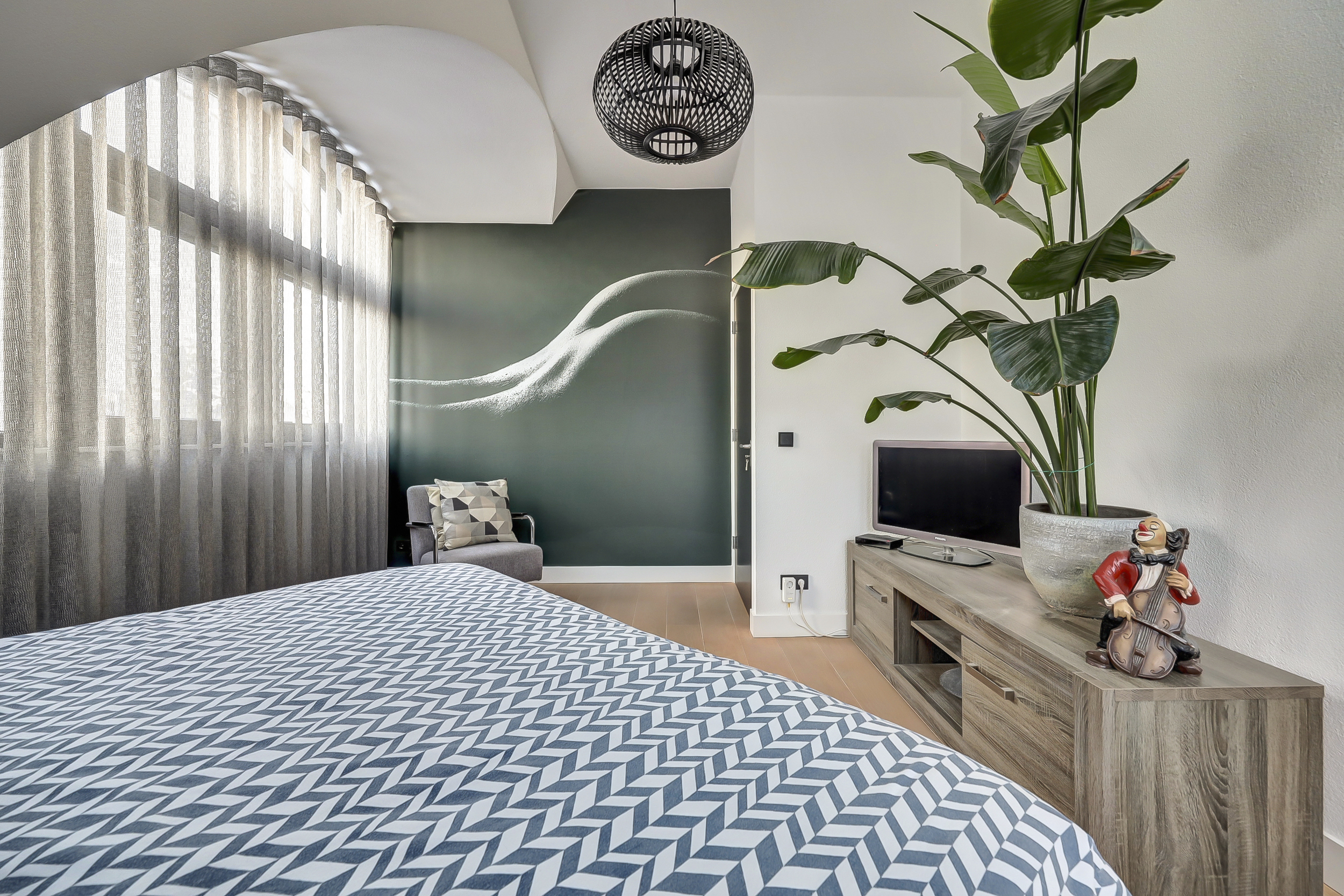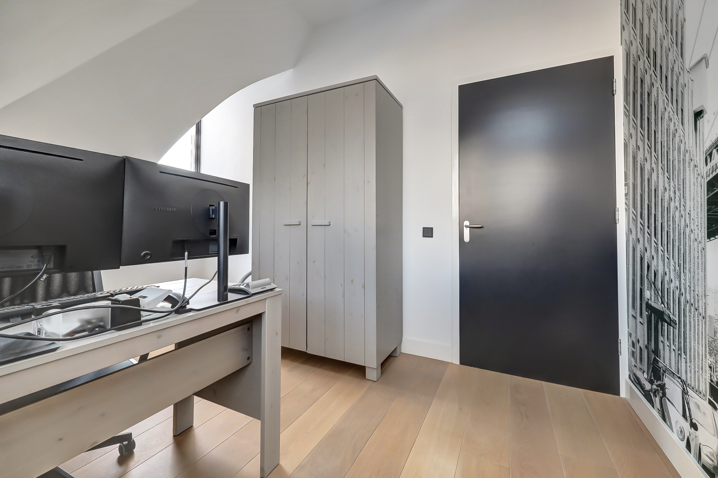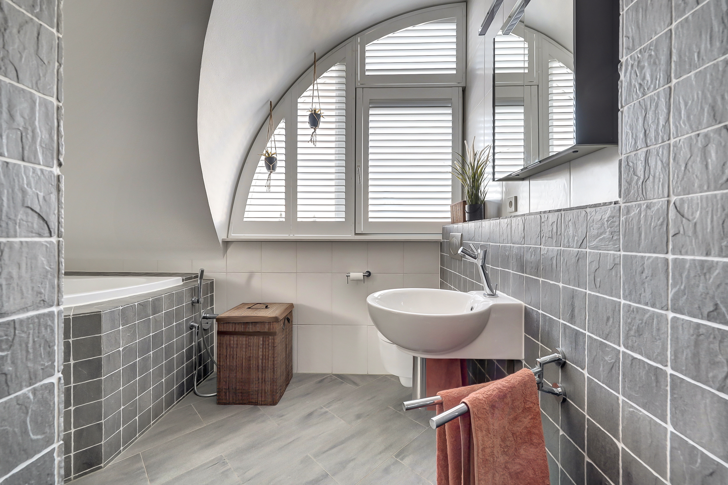 De overloop geeft toegang tot drie zeer ruime slaapkamers en de complete badkamer. Alle slaapkamers profiteren van grote raampartijen dankzij de halfronde dakkapellen. De combinatie van hoge plafonds, ronde raamvormen en rechte kamers zorgt voor een speelse en lichte verdieping. De vloer is afgewerkt met een eiken parketvloer. De badkamer is royaal en compleet ingericht met een bubbelbad, douche, wastafel en een zwevend wandtoilet. Via een vlizotrap is de praktische bergzolder bereikbaar, ideaal voor het opslaan van seizoensgebonden spullen.