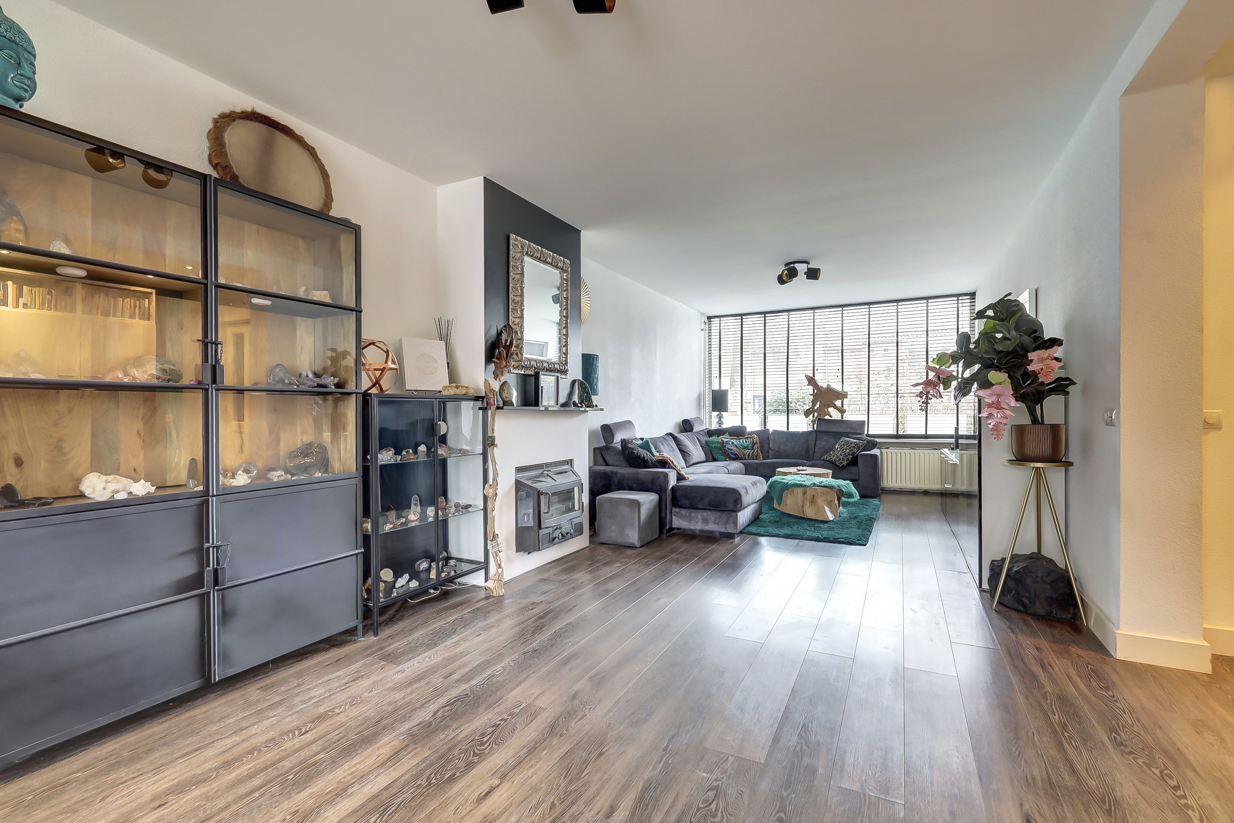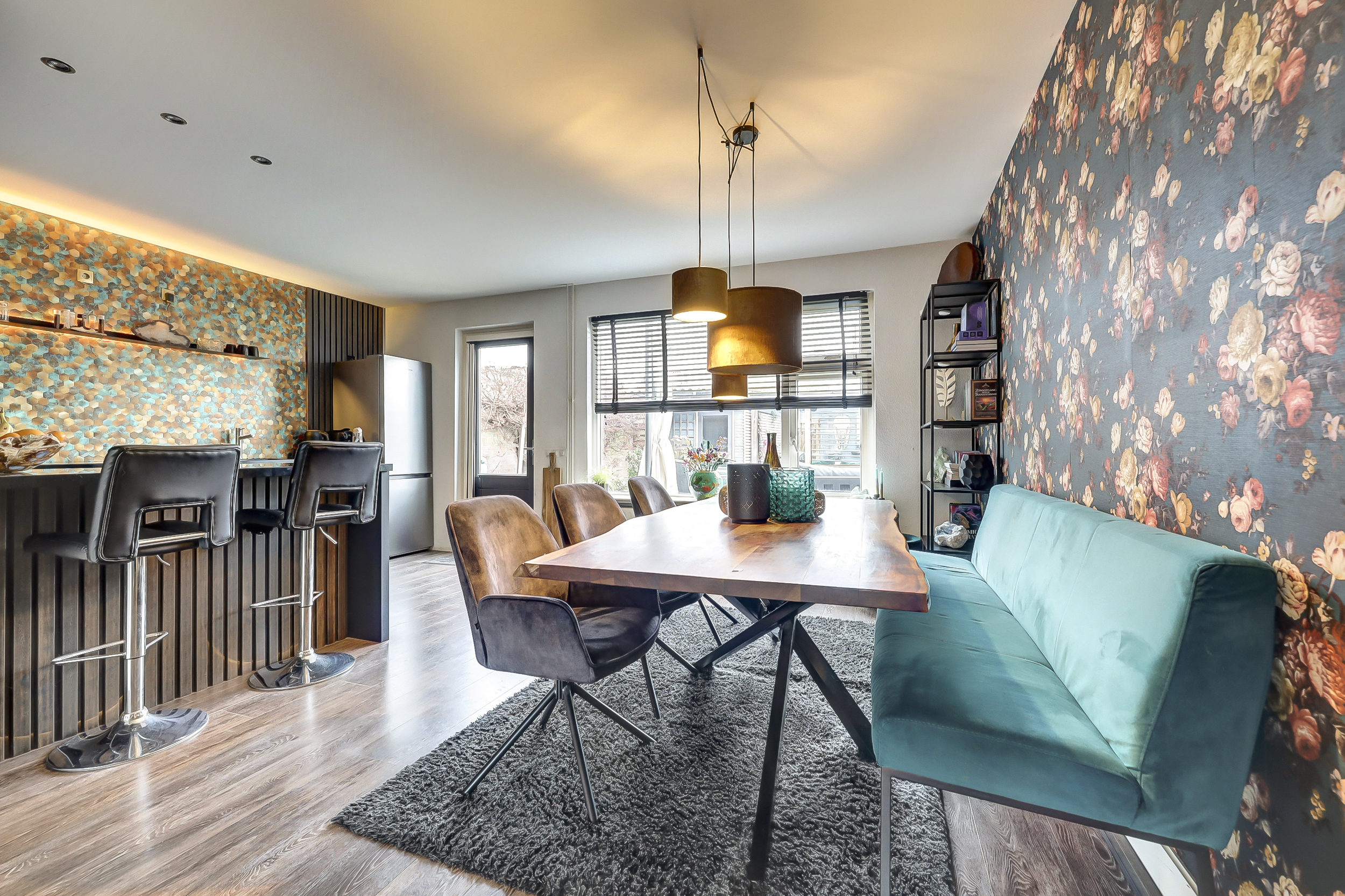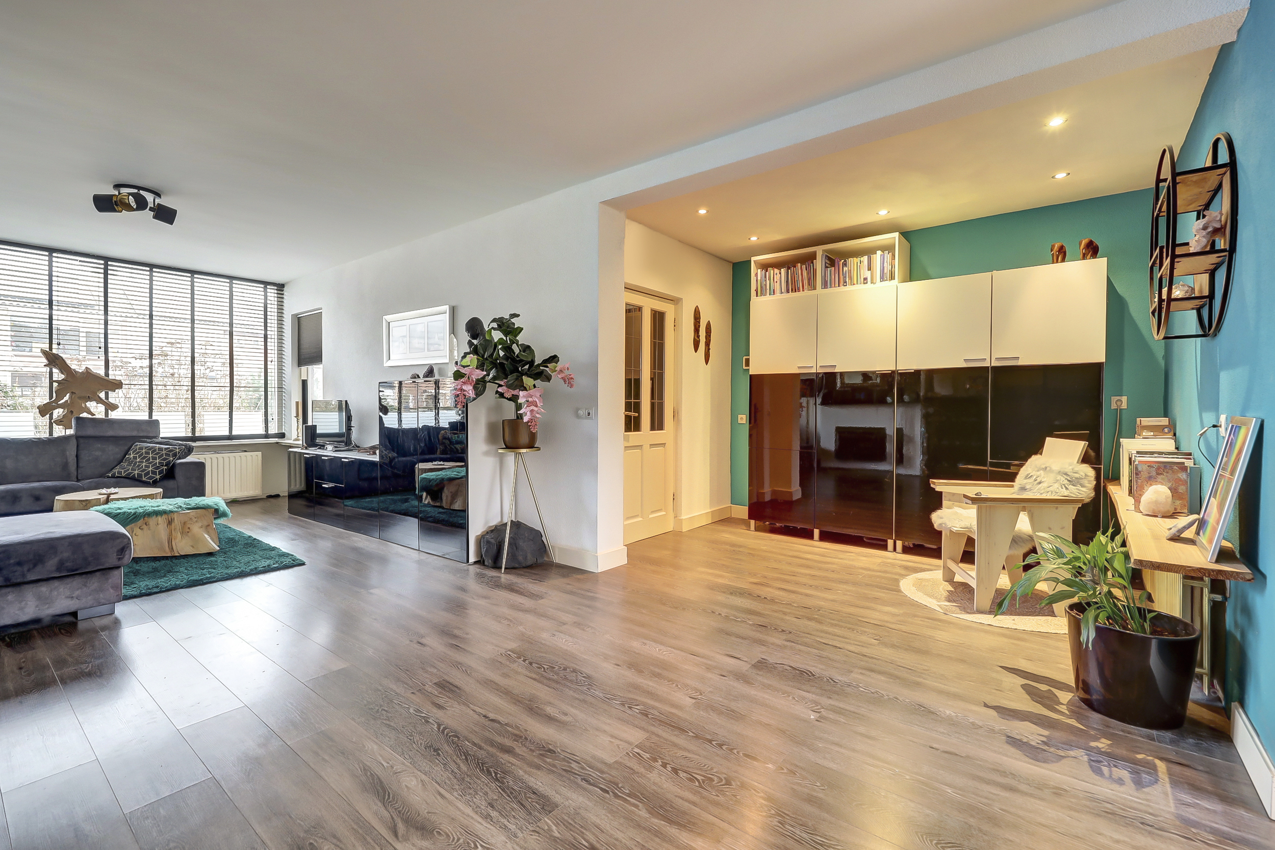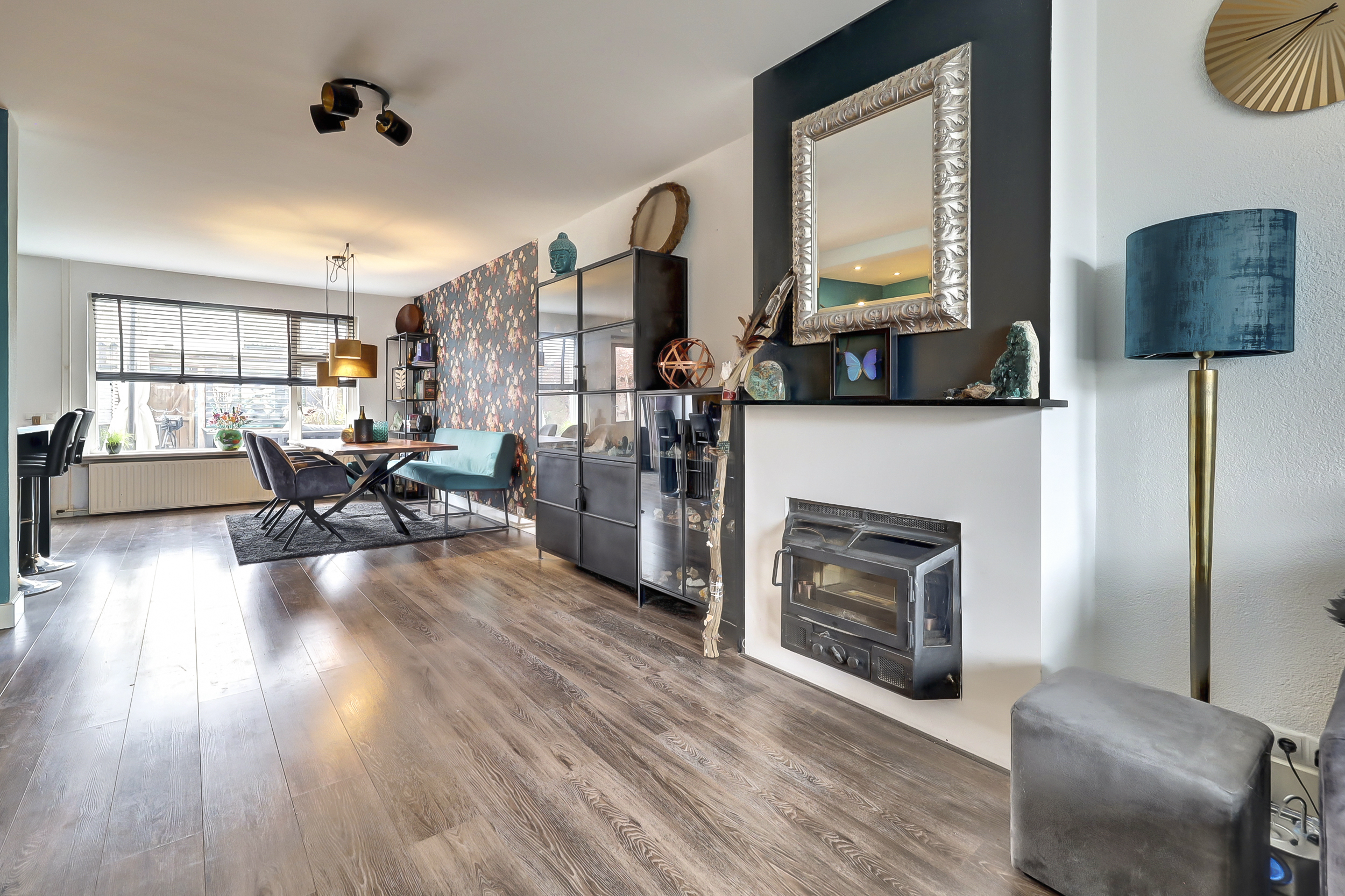 Via de entree kom je in de hal, waar zich het toilet, de meterkast, de trapopgang naar de eerste verdieping en praktische kastruimte bevinden. Vanuit hier betreed je de woonkamer, waar direct de ruimtelijkheid en de verzorgde afwerking opvallen. Aan de voorzijde van de woning bevindt zich het zitgedeelte, waar de grote raampartij zorgt voor een prettige lichtinval. De ruimte is sfeervol ingericht en kenmerkt zich door een rustige basis, gecombineerd met doorlopende blauwe accenten die in verschillende elementen van de woning terugkomen. Aansluitend is een extra zithoek gecreëerd, een fijne plek om te ontspannen of even tot rust te komen. Aan de achterzijde van de woning ligt het eetgedeelte, dat in open verbinding staat met de keuken. De keuken, vernieuwd in 2018, heeft een moderne en eigentijdse uitstraling met zwarte fronten. De opvallende, blauwgetinte tegelwand vormt samen met de houten wandpanelen een echte blikvanger en sluit perfect aan bij de kleuraccenten die in de rest van de woning zijn doorgevoerd. De keukenopstelling biedt volop bergruimte en is uitgerust met een gasfornuis met oven en afzuigkap. Vanuit de keuken is er directe toegang tot de achtertuin, wat de ruimte praktisch maakt voor dagelijks gebruik.