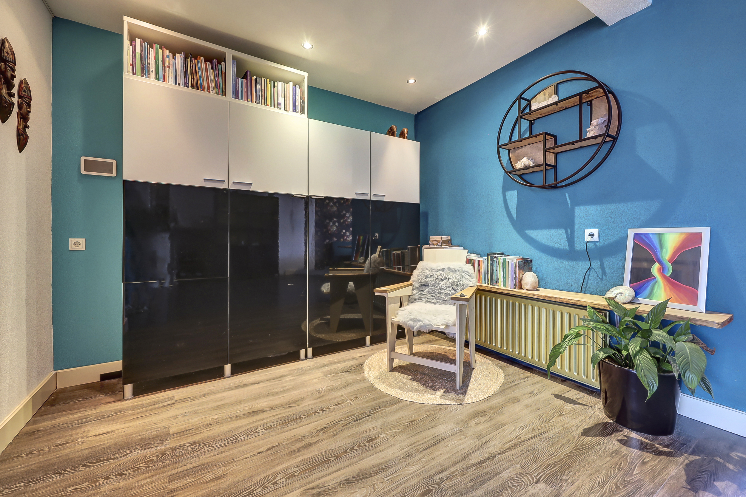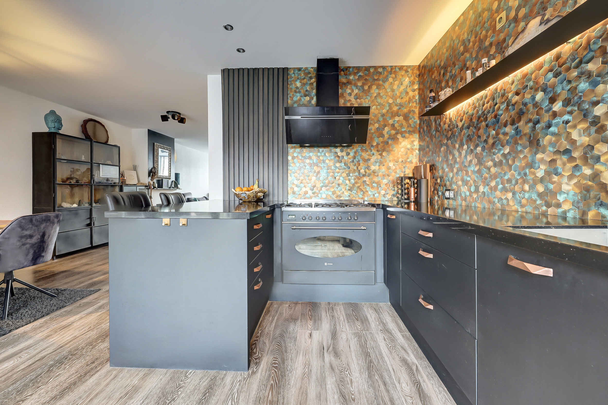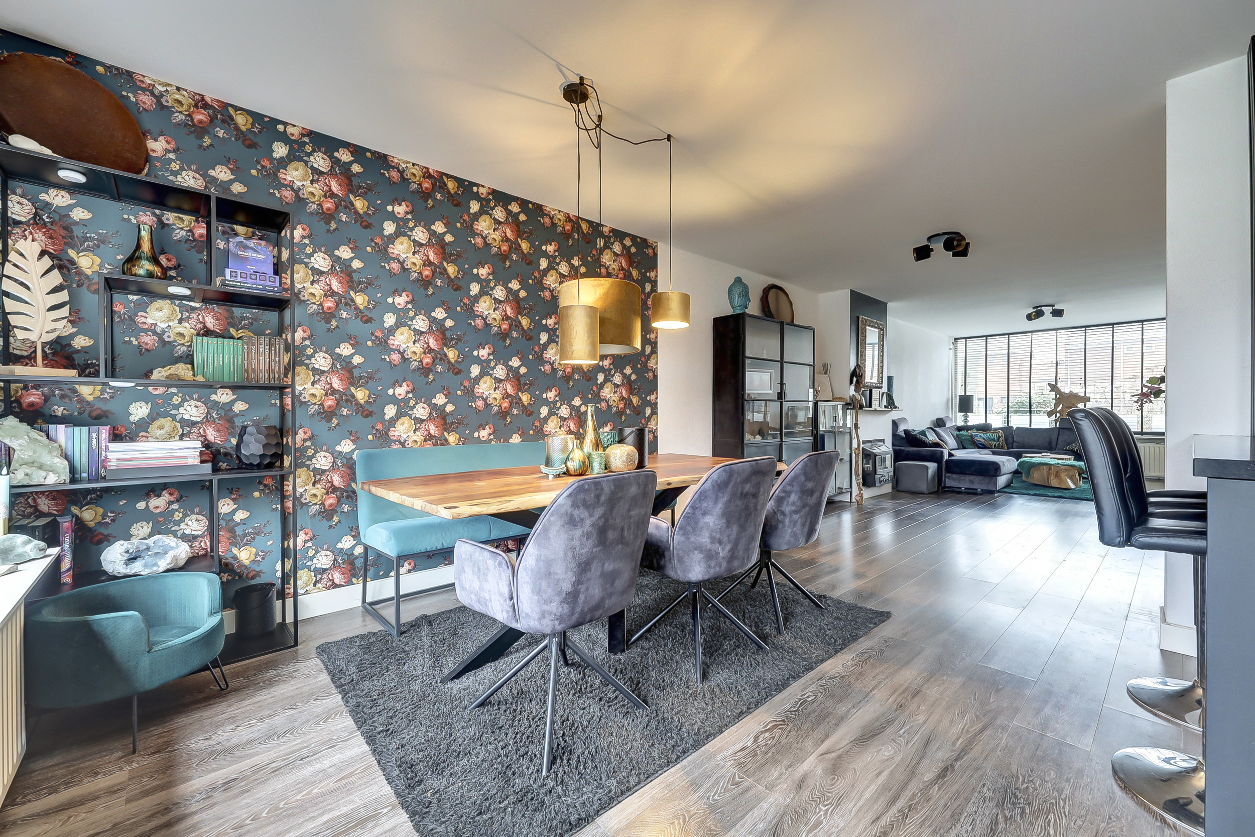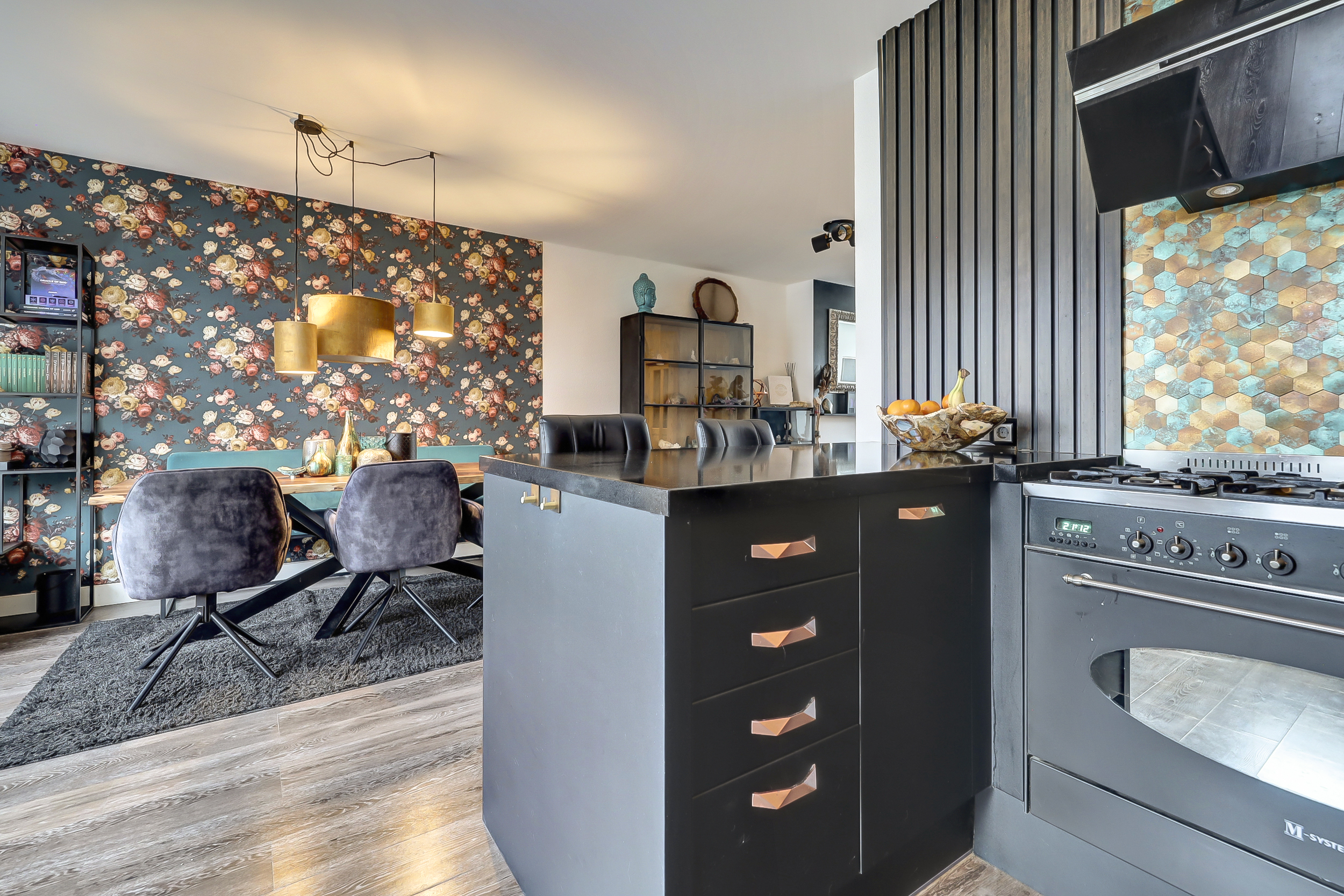 Via de entree kom je in de hal, waar zich het toilet, de meterkast, de trapopgang naar de eerste verdieping en praktische kastruimte bevinden. Vanuit hier betreed je de woonkamer, waar direct de ruimtelijkheid en de verzorgde afwerking opvallen. Aan de voorzijde van de woning bevindt zich het zitgedeelte, waar de grote raampartij zorgt voor een prettige lichtinval. De ruimte is sfeervol ingericht en kenmerkt zich door een rustige basis, gecombineerd met doorlopende blauwe accenten die in verschillende elementen van de woning terugkomen. Aansluitend is een extra zithoek gecreëerd, een fijne plek om te ontspannen of even tot rust te komen. Aan de achterzijde van de woning ligt het eetgedeelte, dat in open verbinding staat met de keuken. De keuken, vernieuwd in 2018, heeft een moderne en eigentijdse uitstraling met zwarte fronten. De opvallende, blauwgetinte tegelwand vormt samen met de houten wandpanelen een echte blikvanger en sluit perfect aan bij de kleuraccenten die in de rest van de woning zijn doorgevoerd. De keukenopstelling biedt volop bergruimte en is uitgerust met een gasfornuis met oven en afzuigkap. Vanuit de keuken is er directe toegang tot de achtertuin, wat de ruimte praktisch maakt voor dagelijks gebruik.