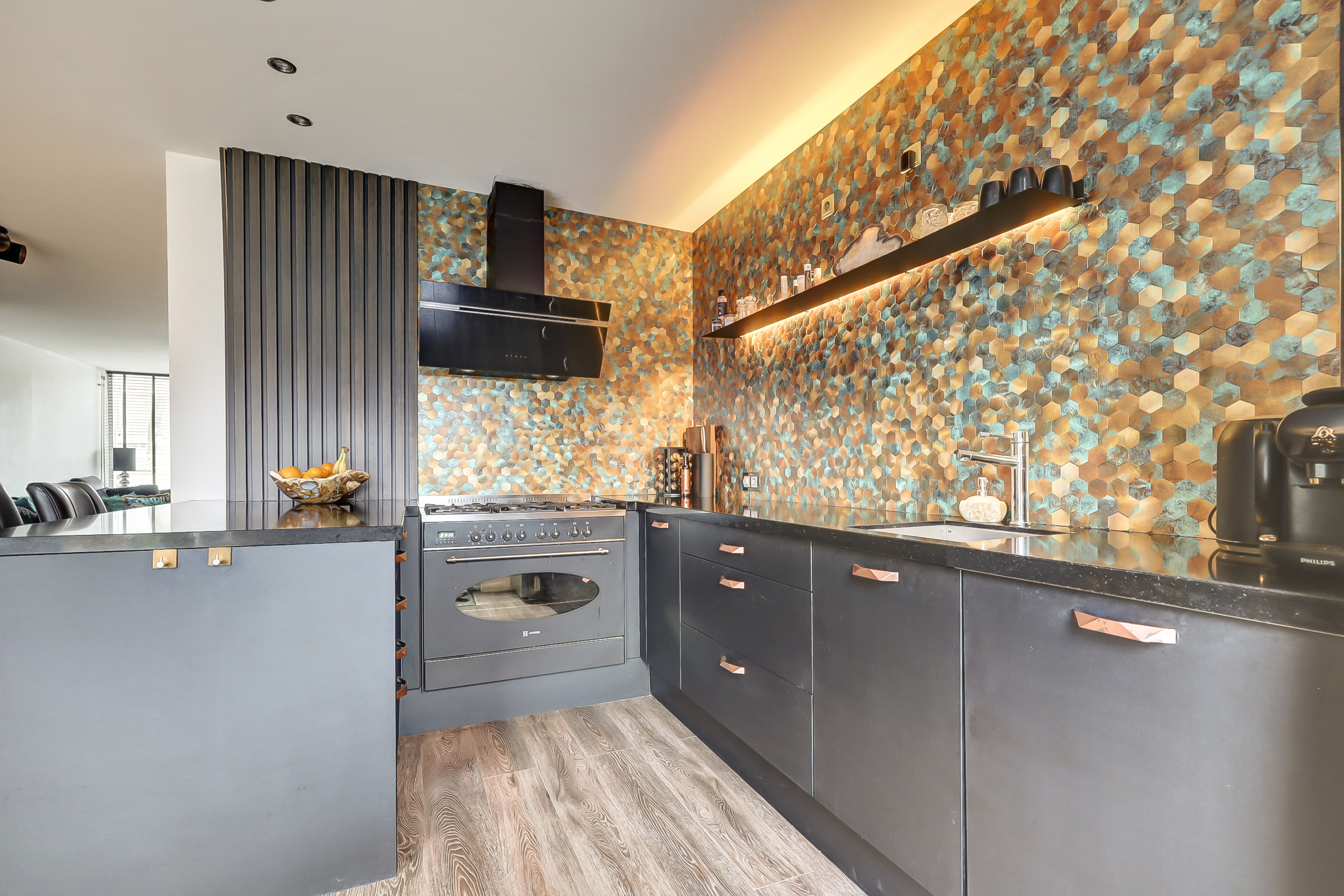 - Moderne keuken (2018) met sfeervolle wandafwerking;