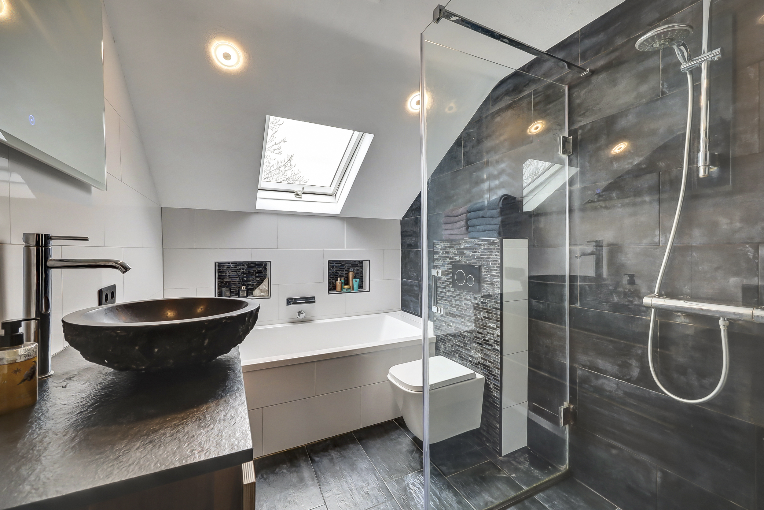 - Luxe badkamer (2023) met ligbad, sunshower en elektrische vloerverwarming;