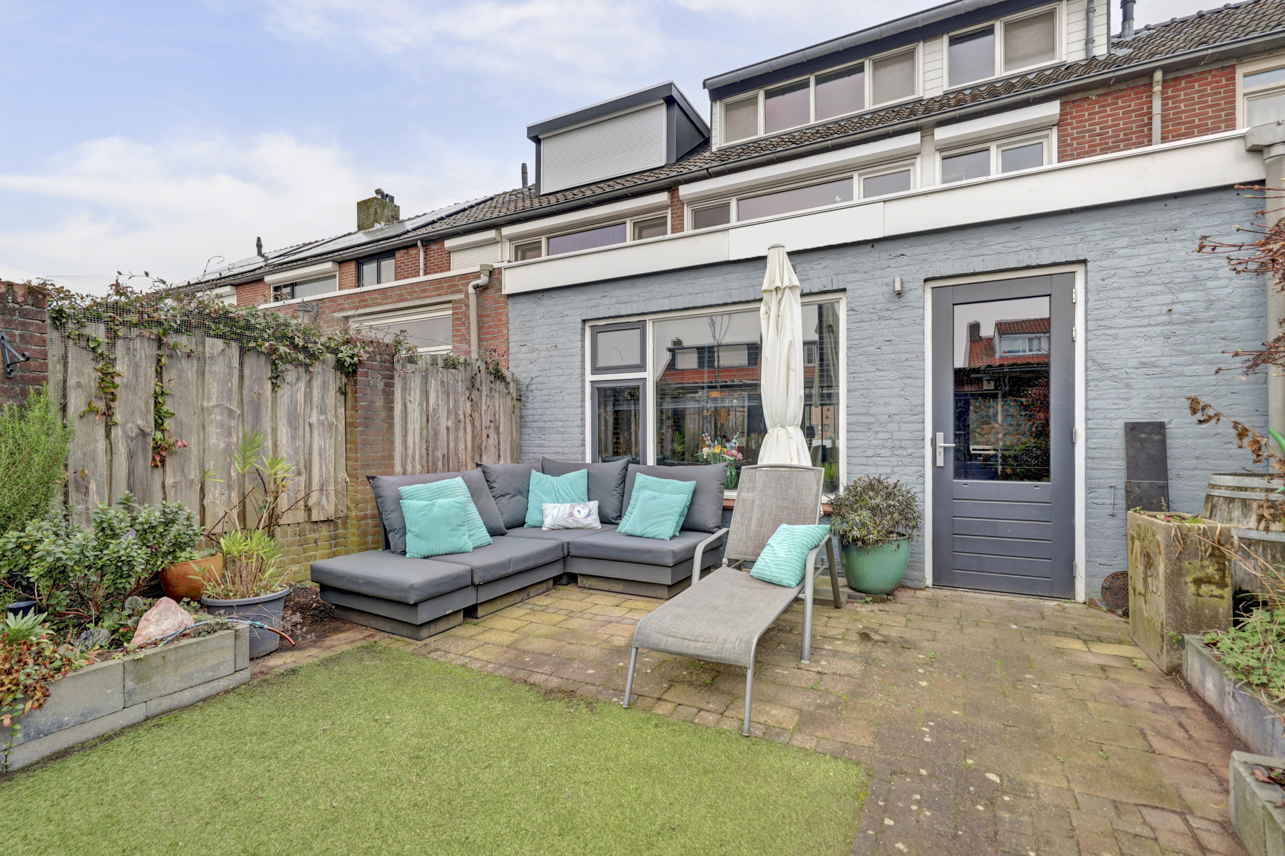 De achtertuin is verzorgd aangelegd en gunstig gelegen op het westen, waardoor je hier in de middag en avond optimaal van de zon kunt genieten. De tuin is ingericht met een combinatie van bestrating, kunstgras en diverse beplanting. Achter in de tuin bevindt zich een praktische berging met aansluitend een overdekte zitruimte. Deze overkapping is een sfeervolle en beschutte plek, ideaal om in alle rust te zitten en te genieten van extra privacy. De overkapping voelt aan als een verlengstuk van de woonruimte en biedt een comfortabele buitenplek. Daarnaast beschikt de tuin over een achterom, wat de bereikbaarheid extra praktisch maakt.