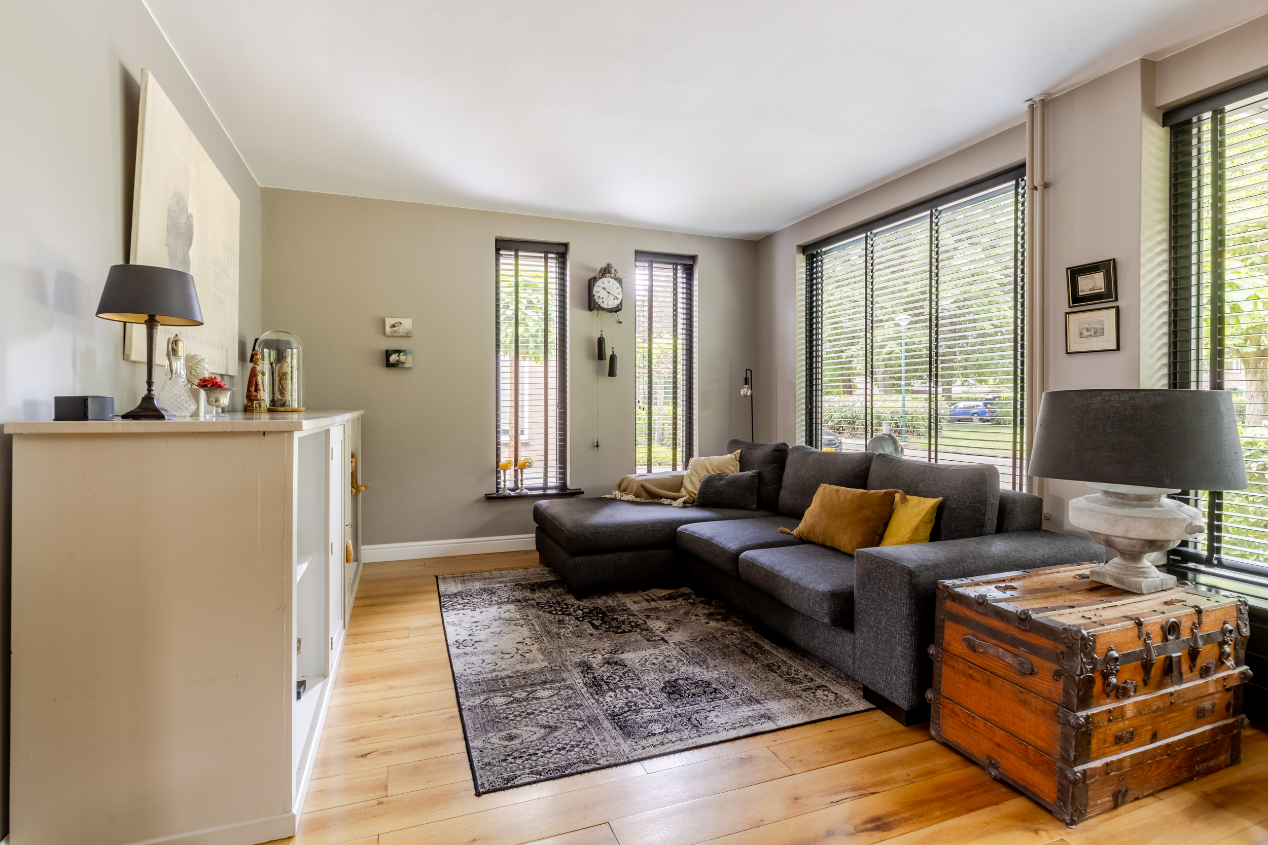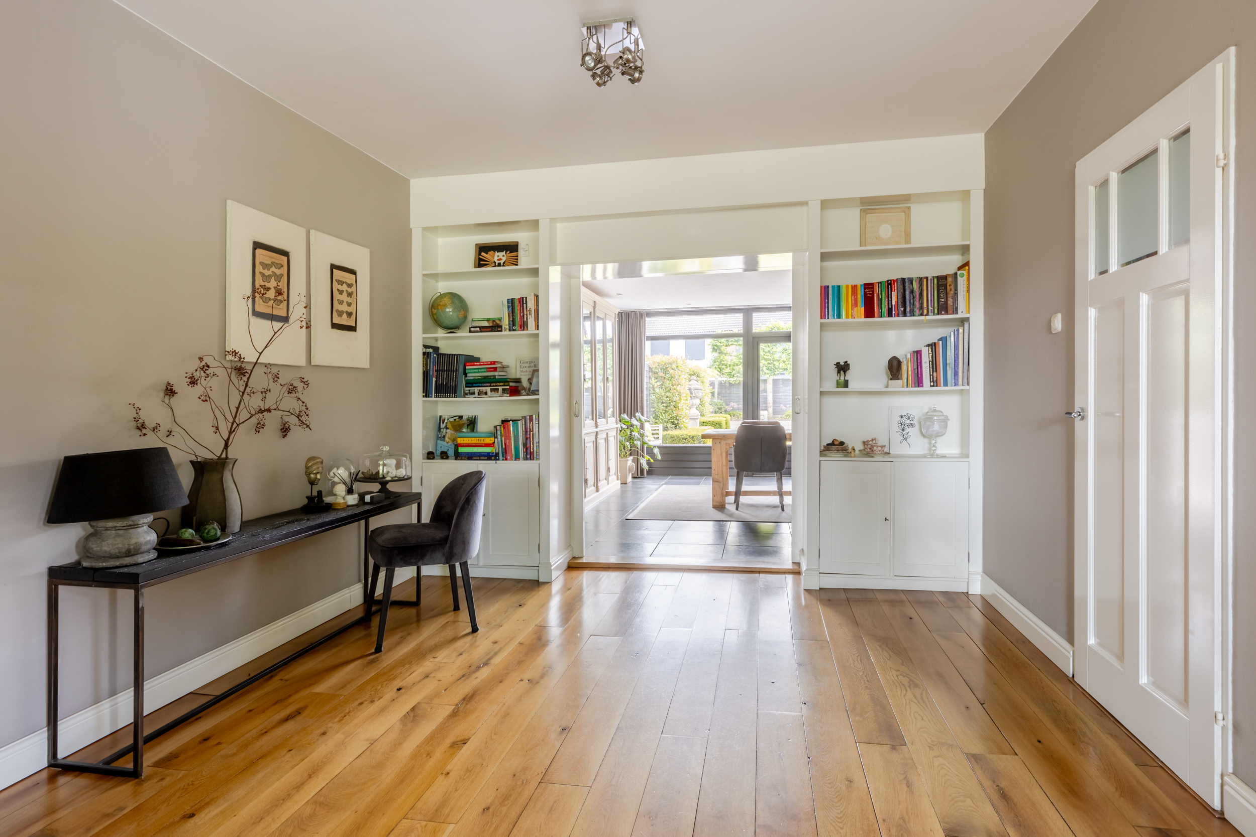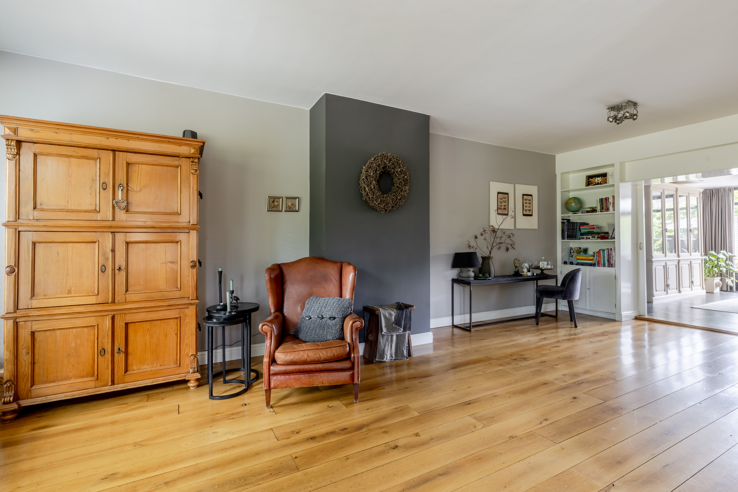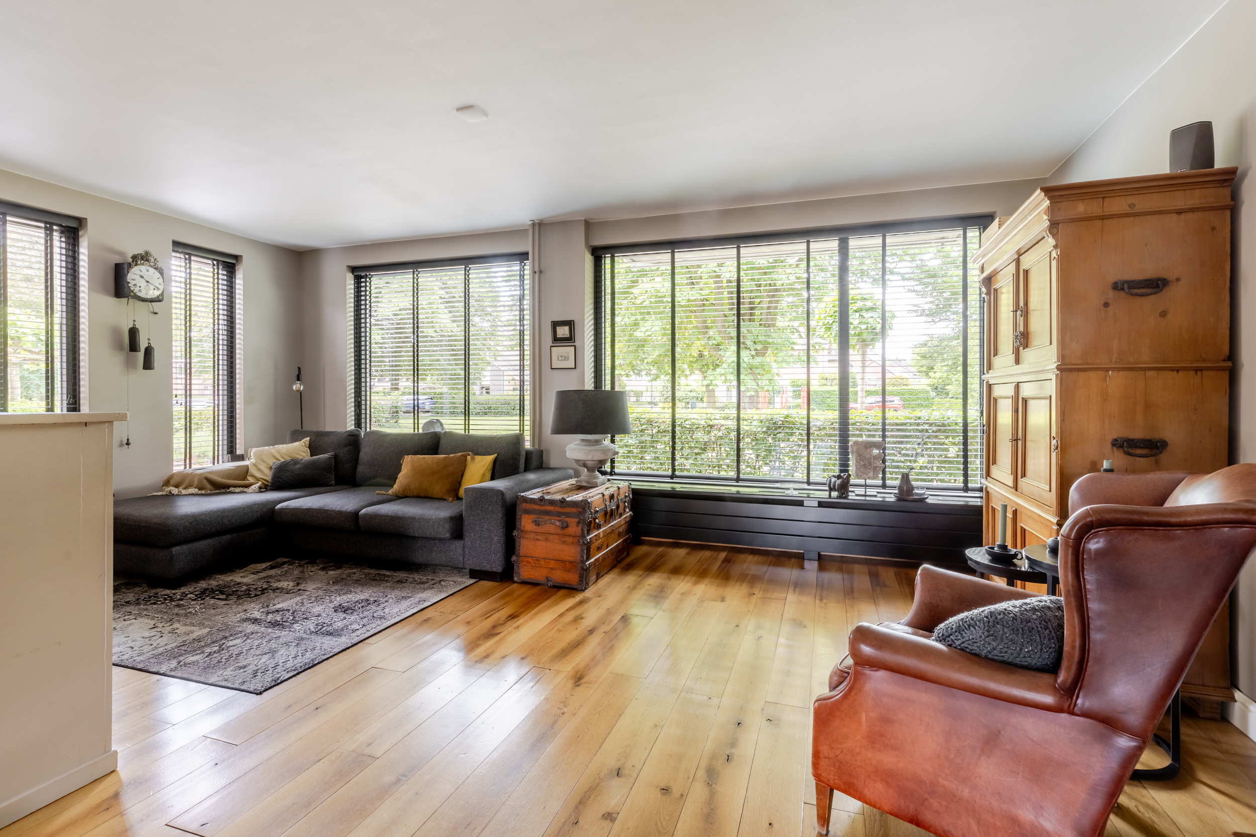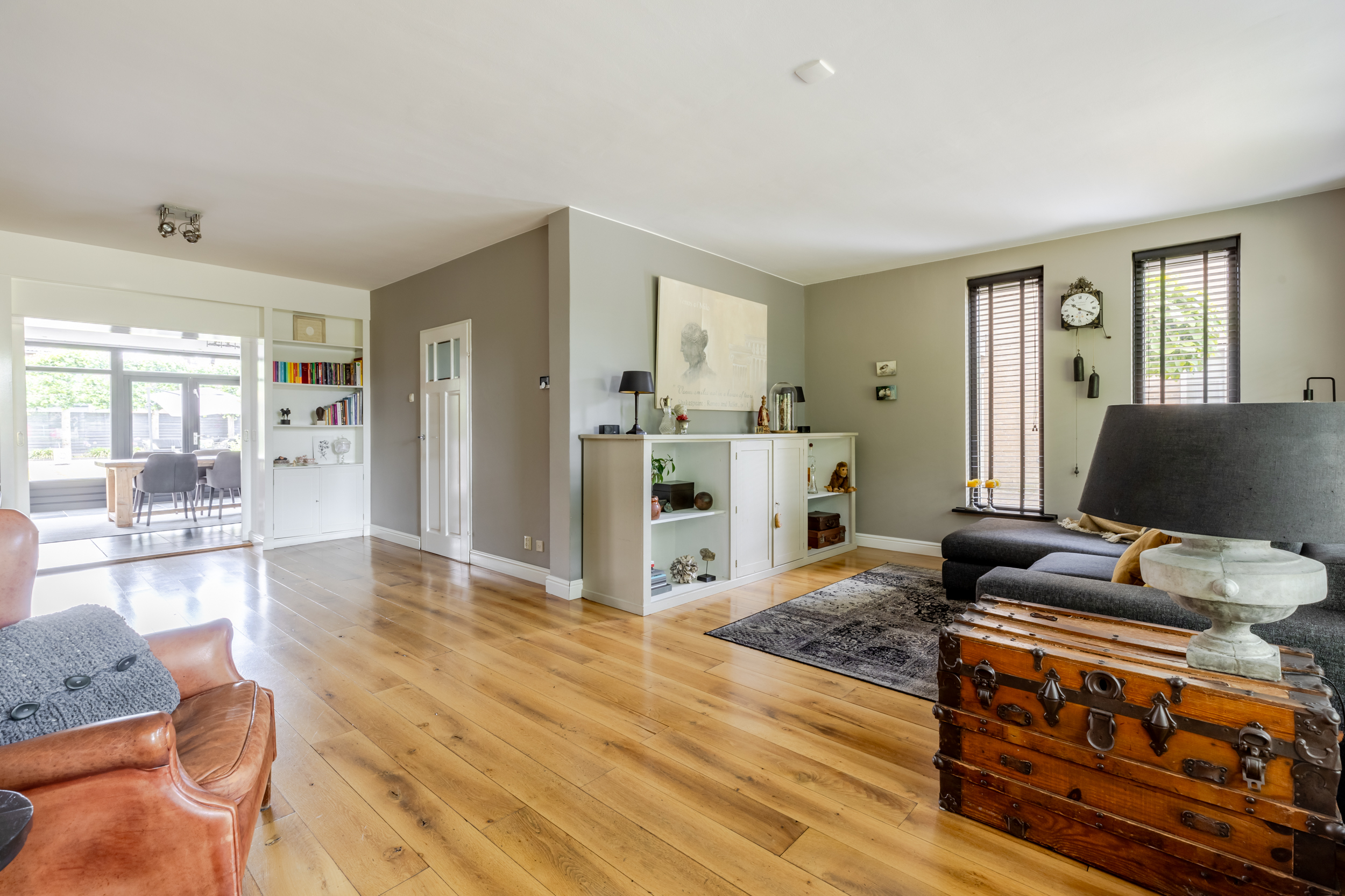 De woonkamer verrast direct met de prachtige houten vloer die meteen een gevoel van warmte brengt. De woonkamer wordt door middel van een kast met schuifdeuren (en-suite) op stijlvolle wijze gescheiden van de woonkeuken. De woonkamer is ruim genoeg voor een comfortabele zithoek en eventueel extra stoelen. Dankzij de grote raampartijen stroomt het daglicht rijkelijk naar binnen wat zorgt voor een open en lichte uitstraling.