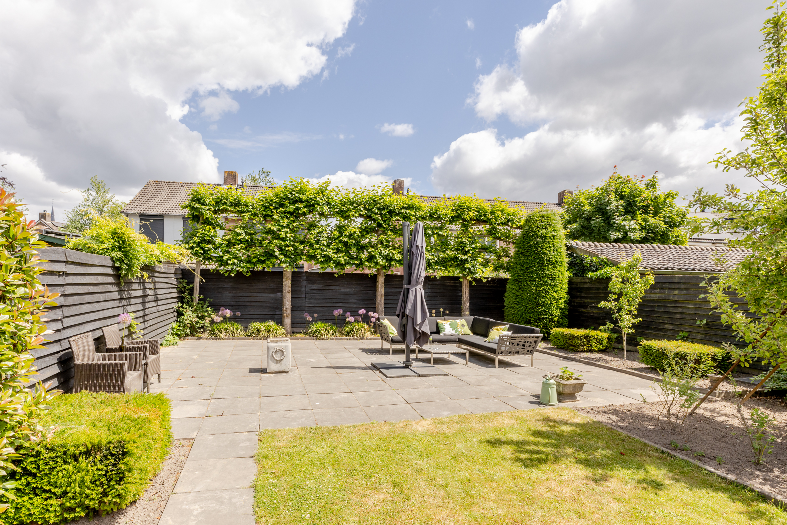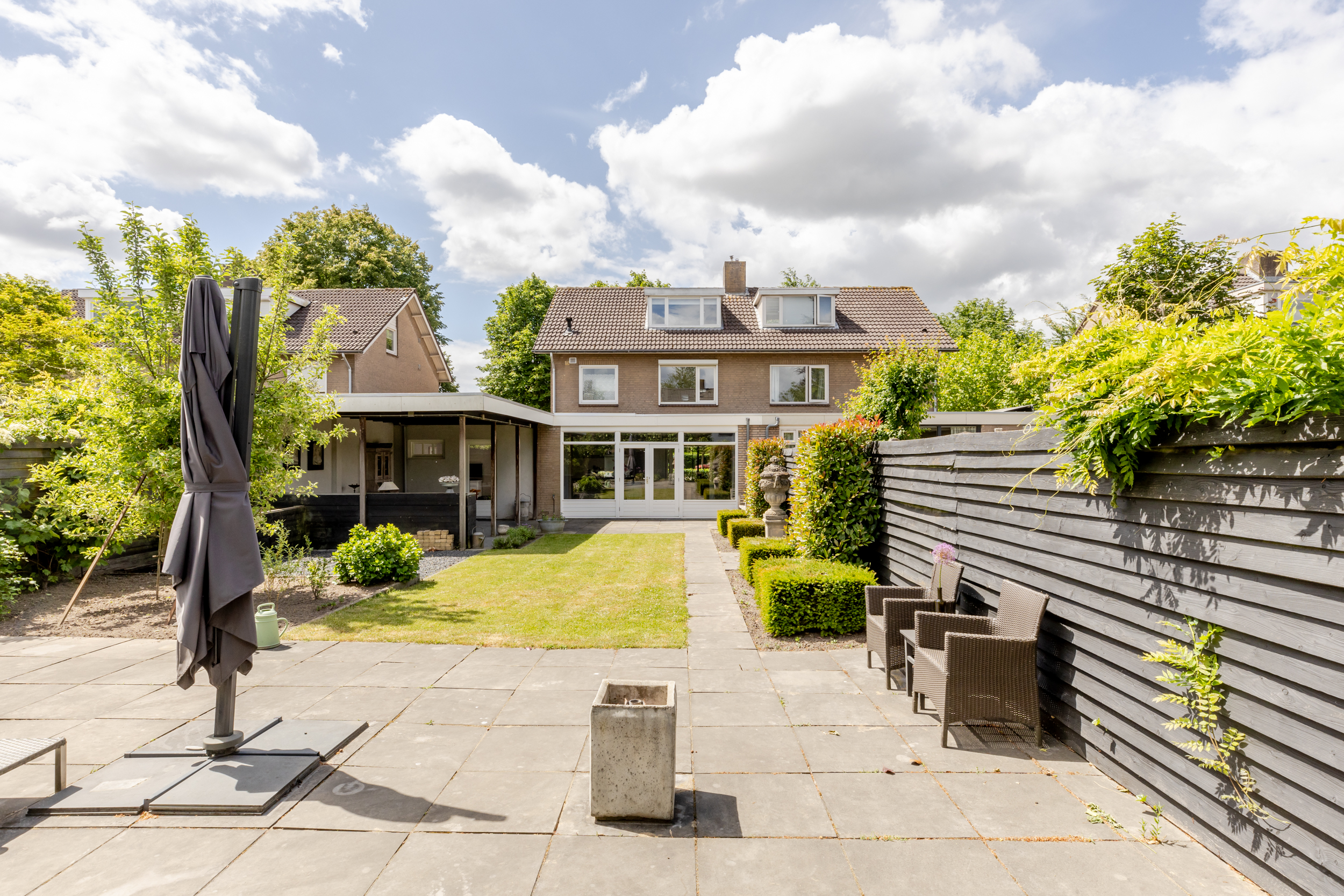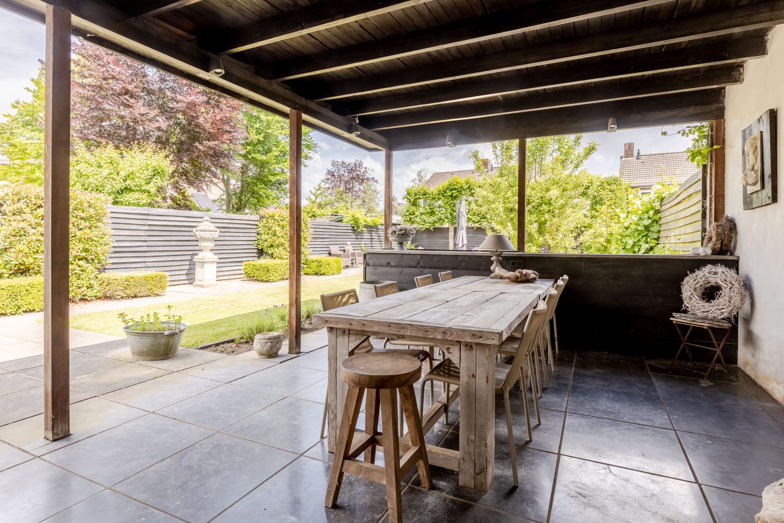 Zodra je de achterdeur opent sta je in een tuin waar ruimte en rust samenkomen. Deze diepe tuin die is gelegen op het noordoosten biedt volop mogelijkheden om op elk moment van de dag te genieten van het buitenleven. Dankzij de royale afmetingen is er plek voor meerdere zit- en loungeplekken en kun je desgewenst in de zon of schaduw zitten. De tuin is aangelegd met een combinatie van betegelde terrassen en groene borders. In de tuin is nog een ruime overkapping waar je het hele jaar door kunt genieten, zelfs bij minder weer. Of het nu zomer is of herfst, deze tuin nodigt het hele jaar door uit om naar buiten te gaan.