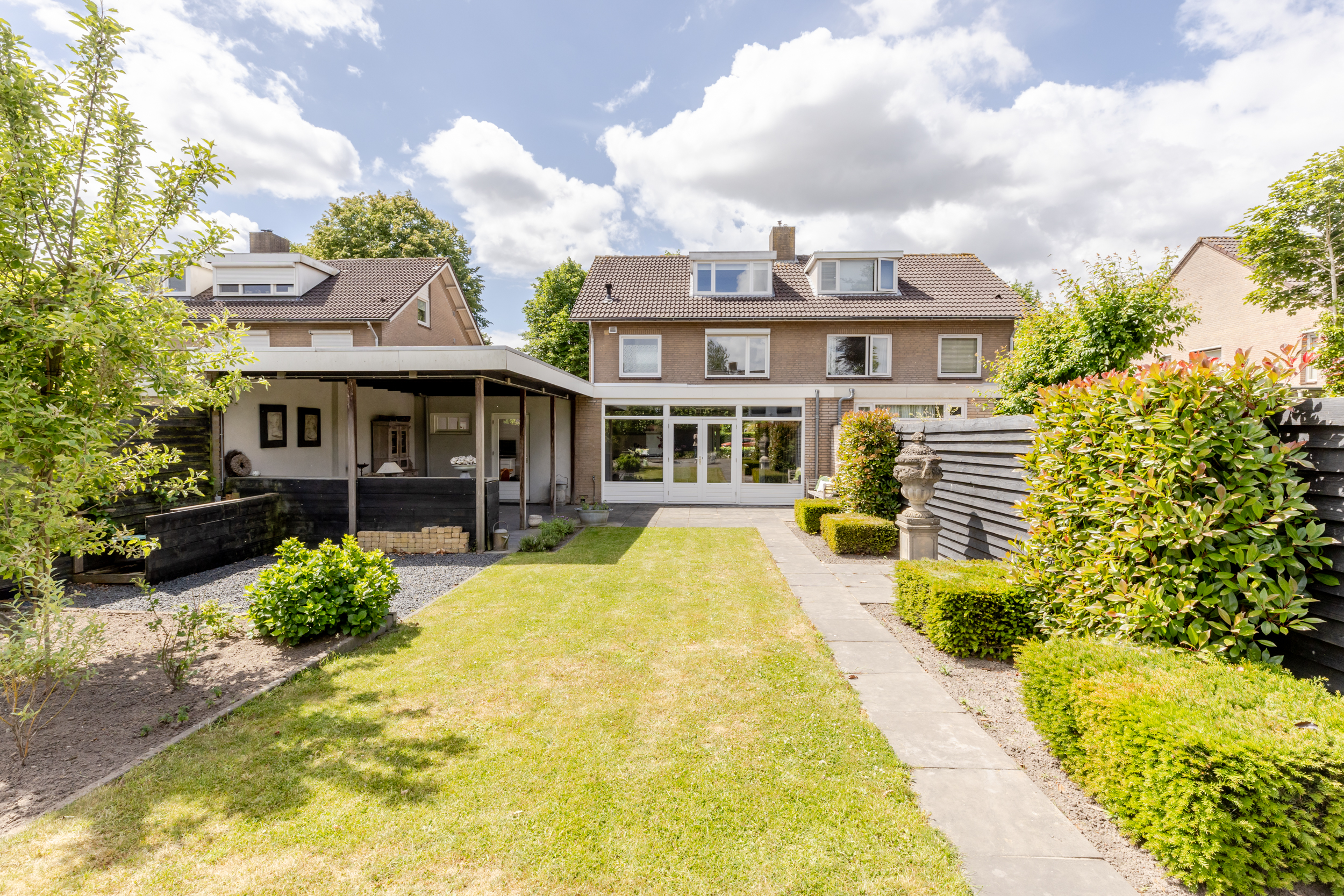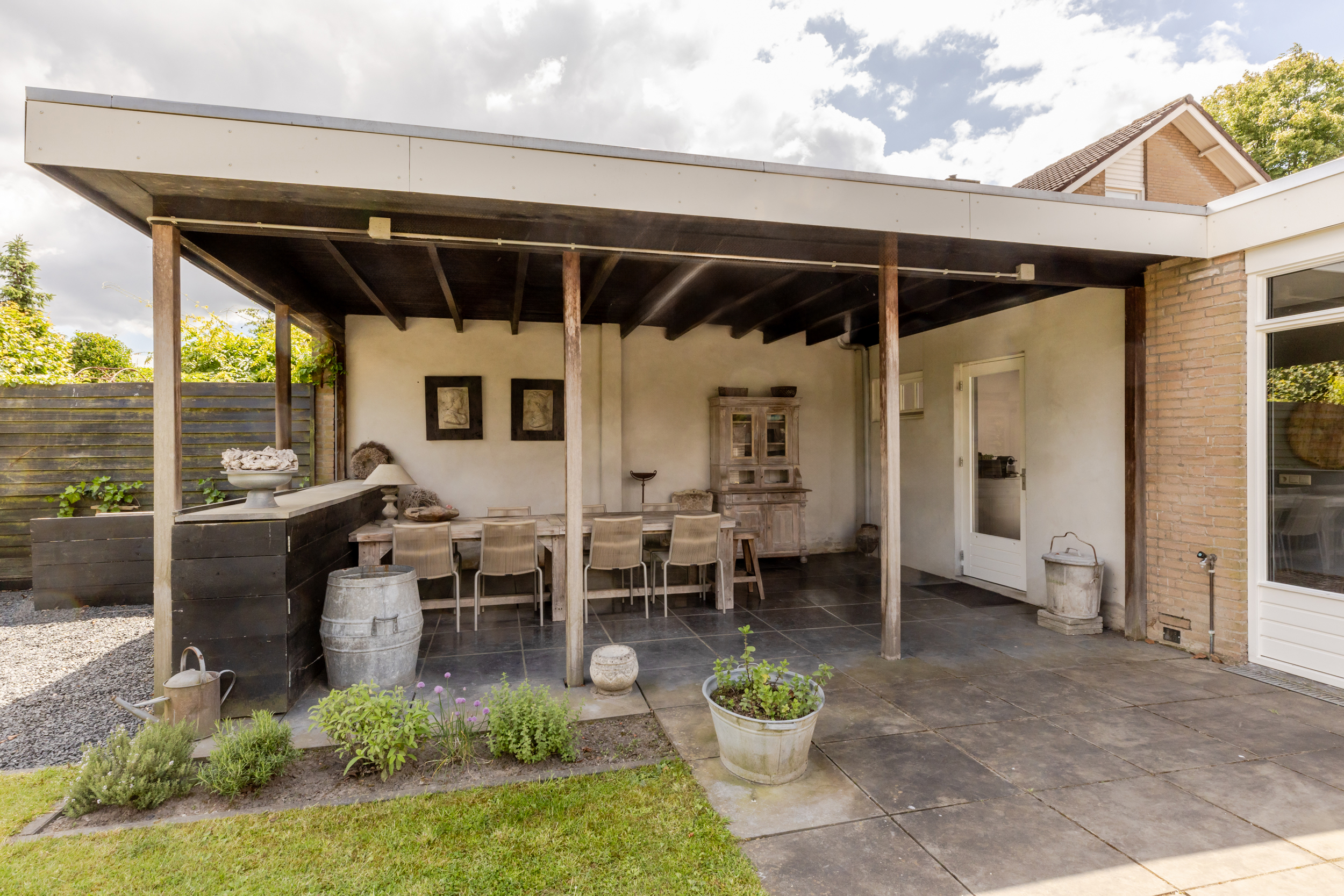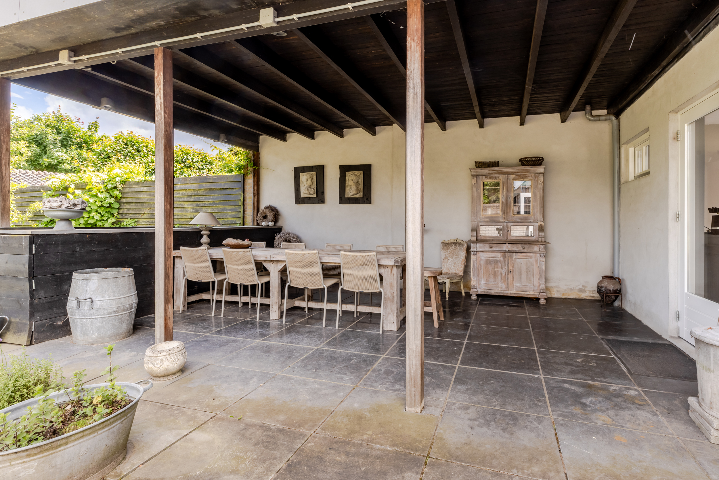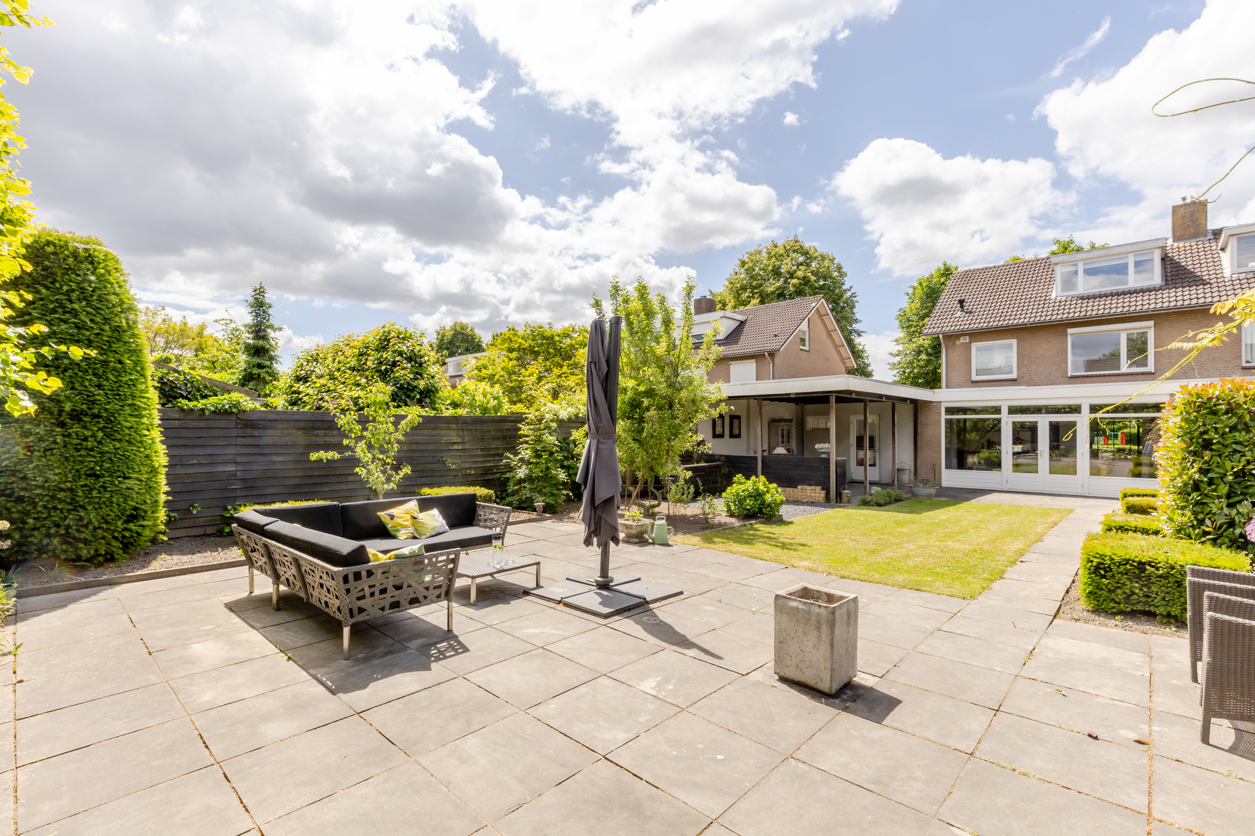 Zodra je de achterdeur opent sta je in een tuin waar ruimte en rust samenkomen. Deze diepe tuin die is gelegen op het noordoosten biedt volop mogelijkheden om op elk moment van de dag te genieten van het buitenleven. Dankzij de royale afmetingen is er plek voor meerdere zit- en loungeplekken en kun je desgewenst in de zon of schaduw zitten. De tuin is aangelegd met een combinatie van betegelde terrassen en groene borders. In de tuin is nog een ruime overkapping waar je het hele jaar door kunt genieten, zelfs bij minder weer. Of het nu zomer is of herfst, deze tuin nodigt het hele jaar door uit om naar buiten te gaan.