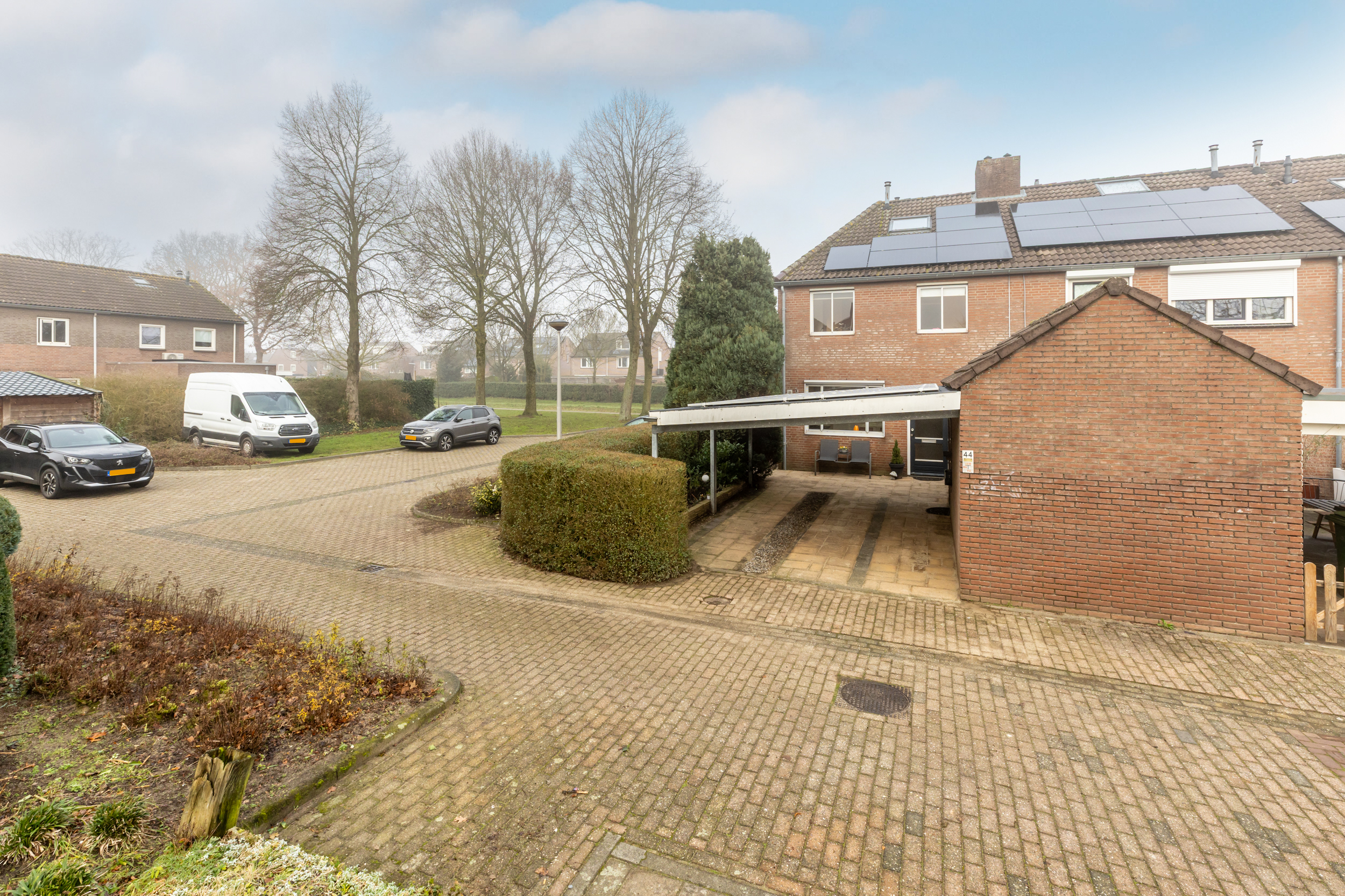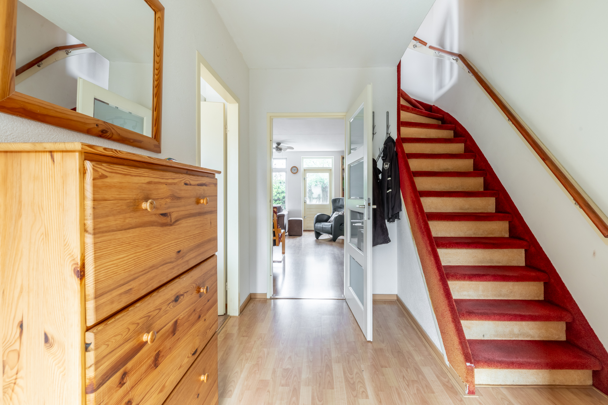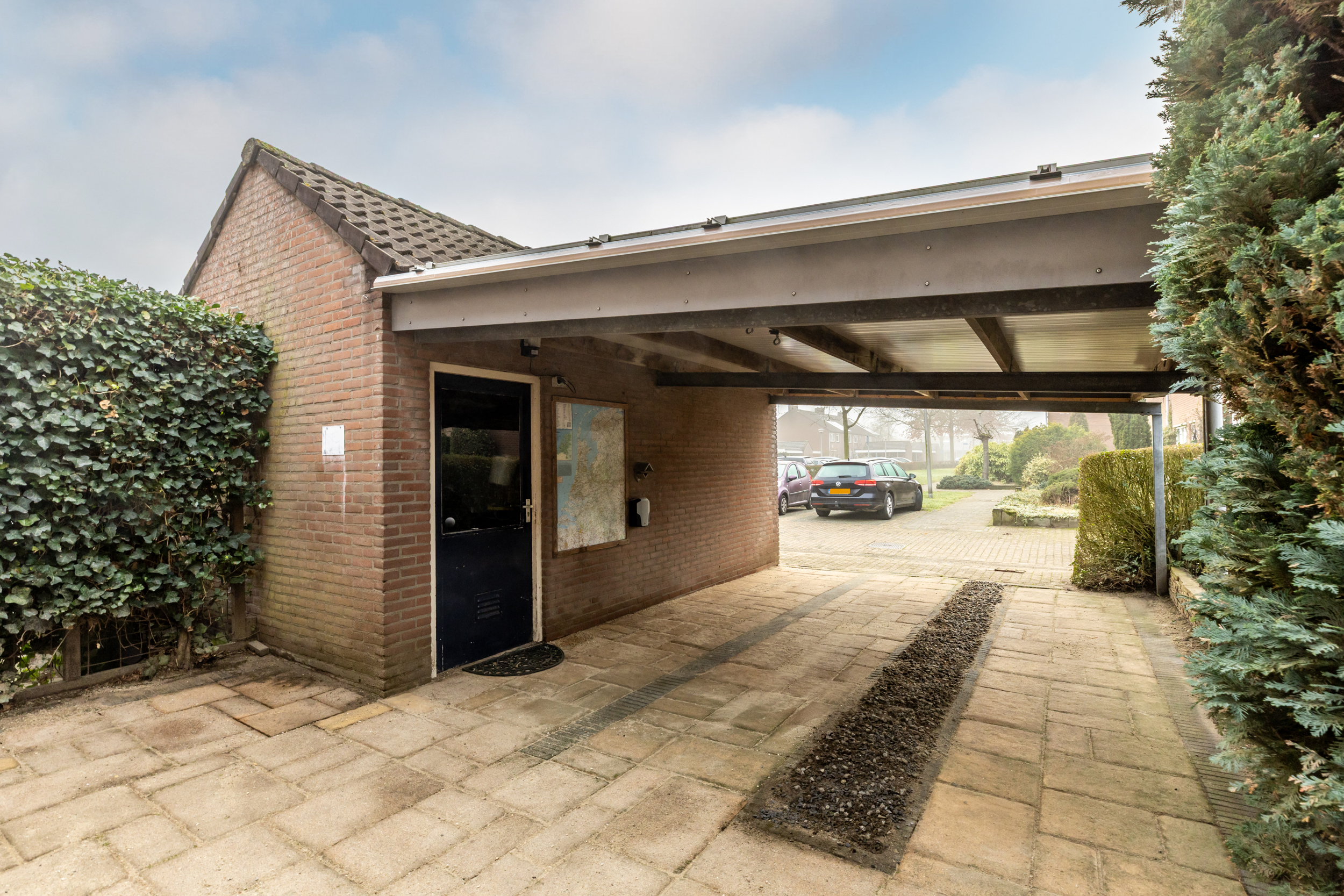 U parkeert de auto gemakkelijk onder de eigen carport, waarop de 17 zonnepanelen zijn geplaatst. Via de voordeur komt u in de entreehal, die toegang biedt tot het toilet, de meterkast, de trapopgang, de keuken en de woonkamer. De keuken aan de voorzijde is een fijne plek om in de middagzon te zitten en biedt voldoende ruimte voor een eettafel. De keuken is uitgerust met een gaskookplaat, oven, vaatwasser en koelkast. Aan de achterzijde bevindt zich de ruime woonkamer, waar door de vele raampartijen veel natuurlijk licht binnenvalt. Dit maakt de woonkamer tot een prettige en lichte leefruimte. Daarnaast is er een handige trapkast en een deur naar de achtertuin, waardoor binnen en buiten mooi met elkaar verbonden zijn.