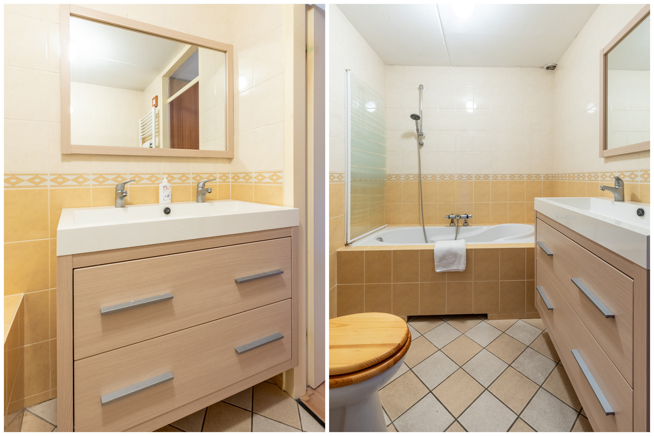 - Ligbad, toilet, dubbele wastafel en wastafelmeubel
