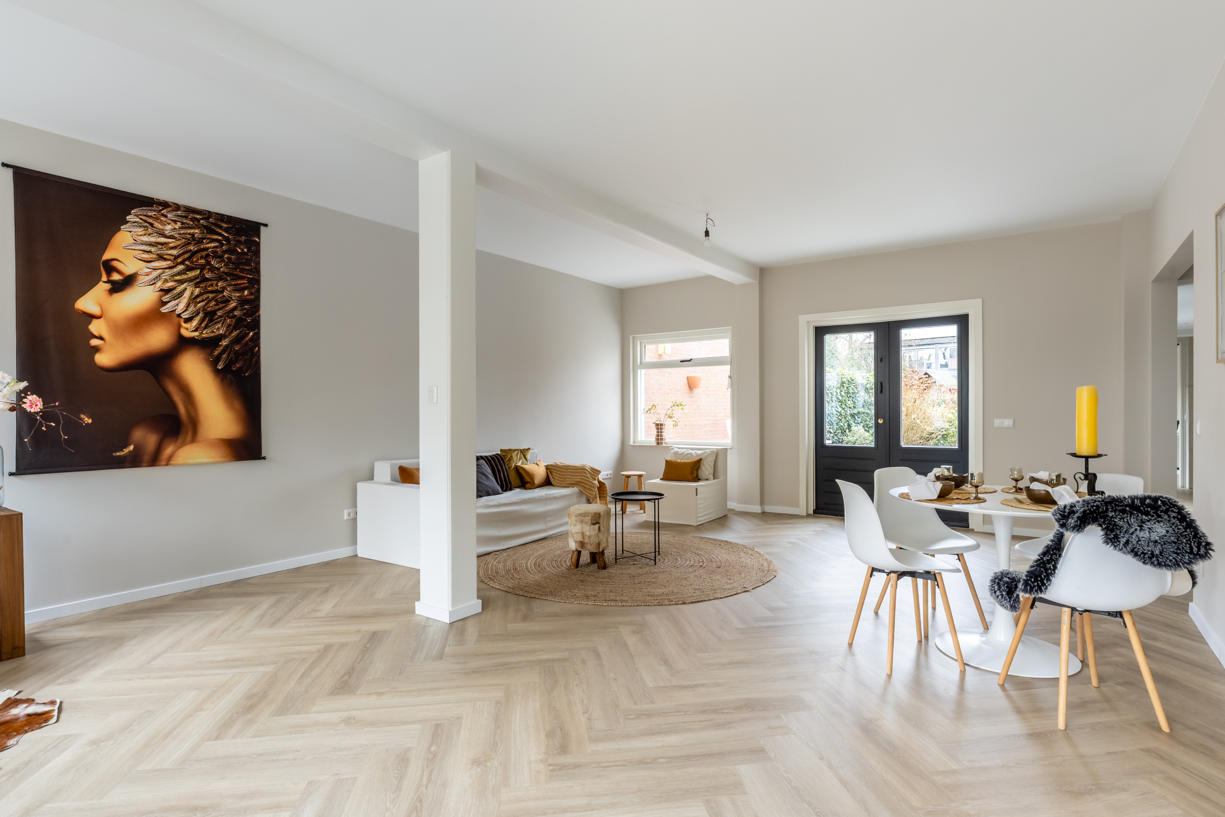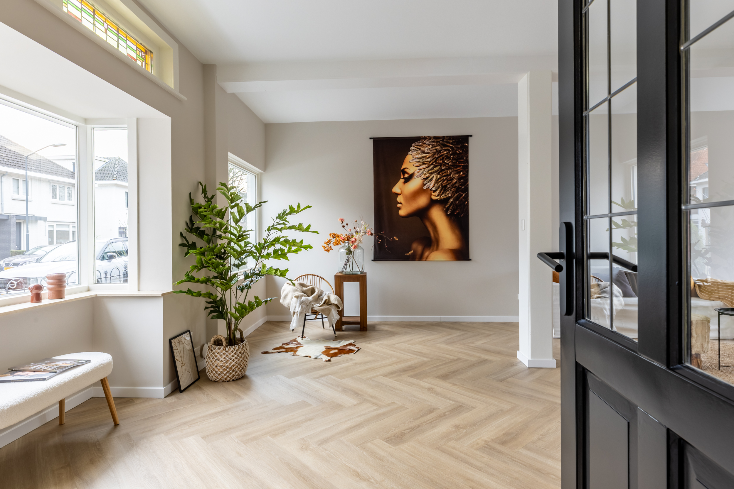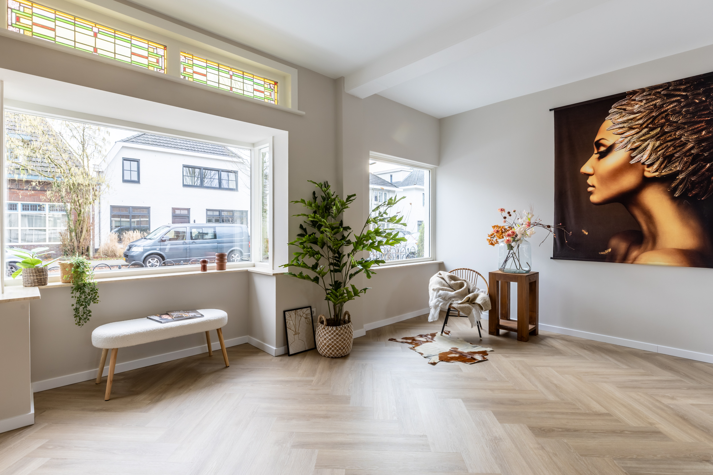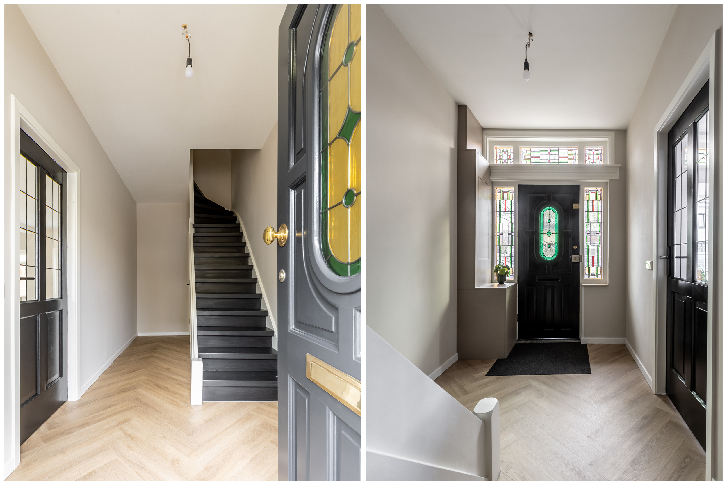 De overdekte entree met rondom authentieke glas-in-loodramen vormt een elegante binnenkomst en geeft toegang tot een royale hal. Vanuit hier zijn de recent vernieuwde meterkast, de trapopgang naar de eerste verdieping, de verdiepte trapkast en de woonkamer bereikbaar. De volledige begane grond is voorzien van een hoogwaardige PVC visgraatvloer inclusief vloerverwarming.