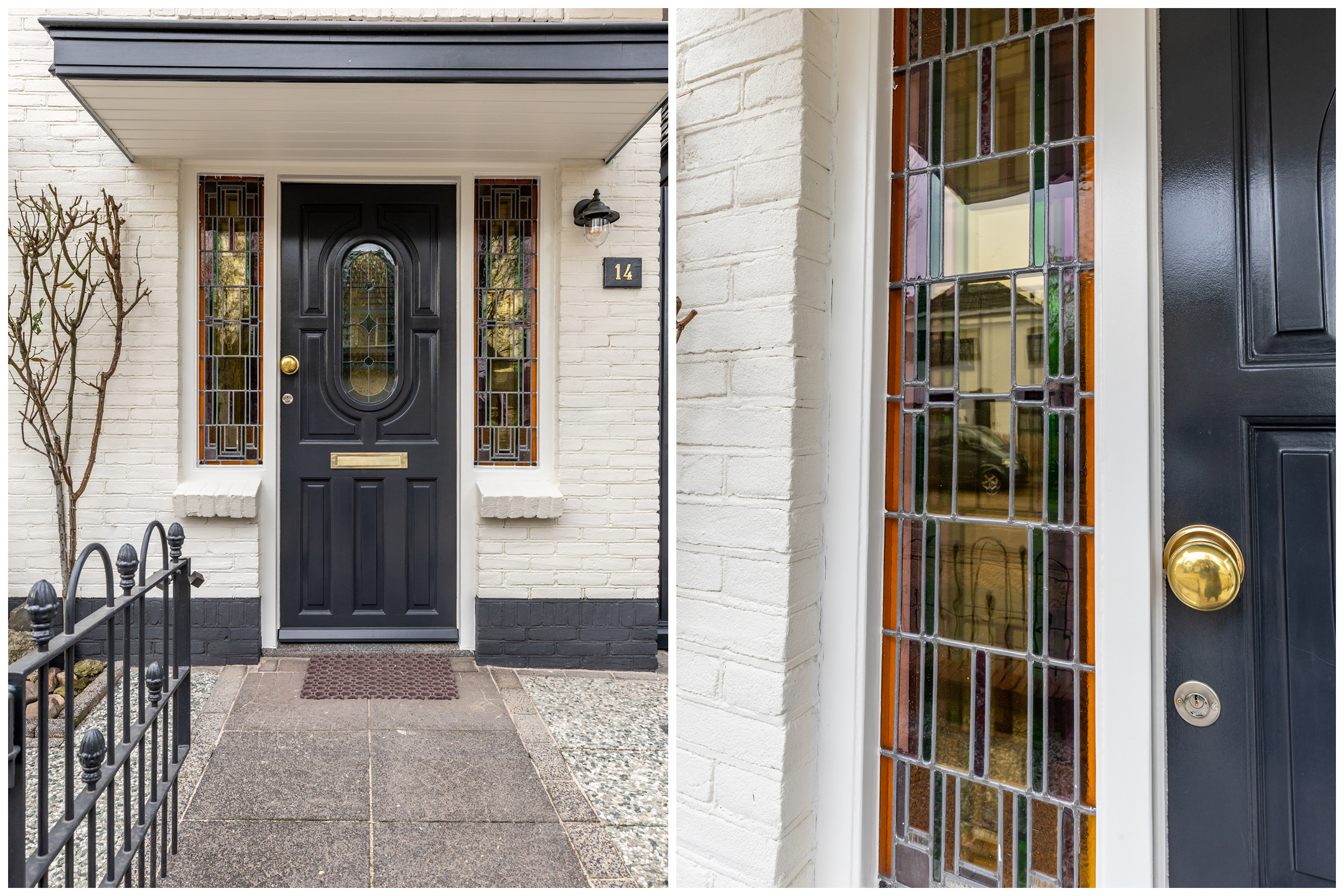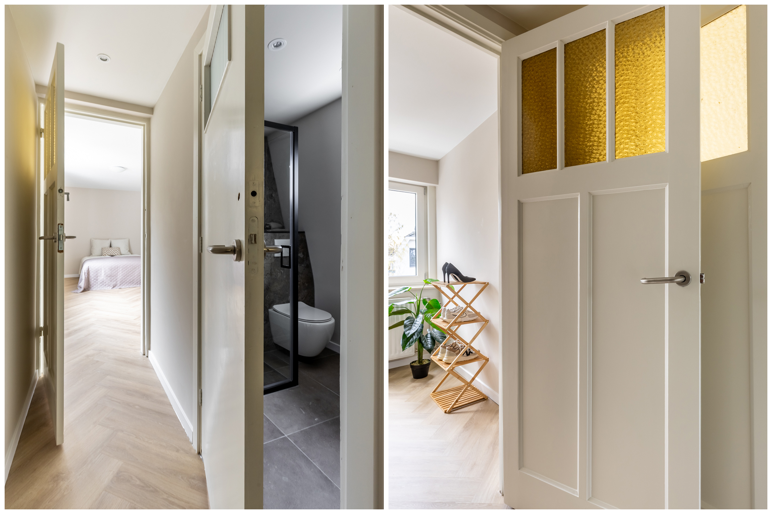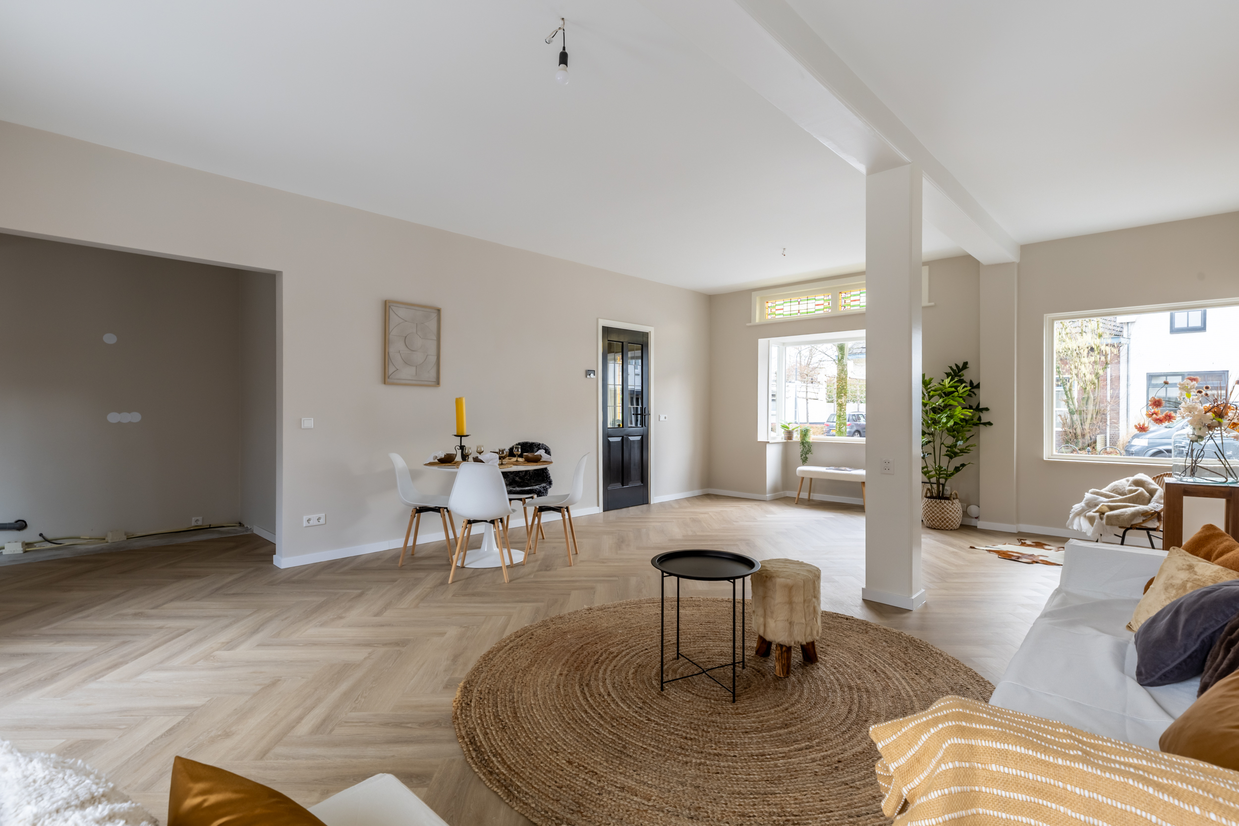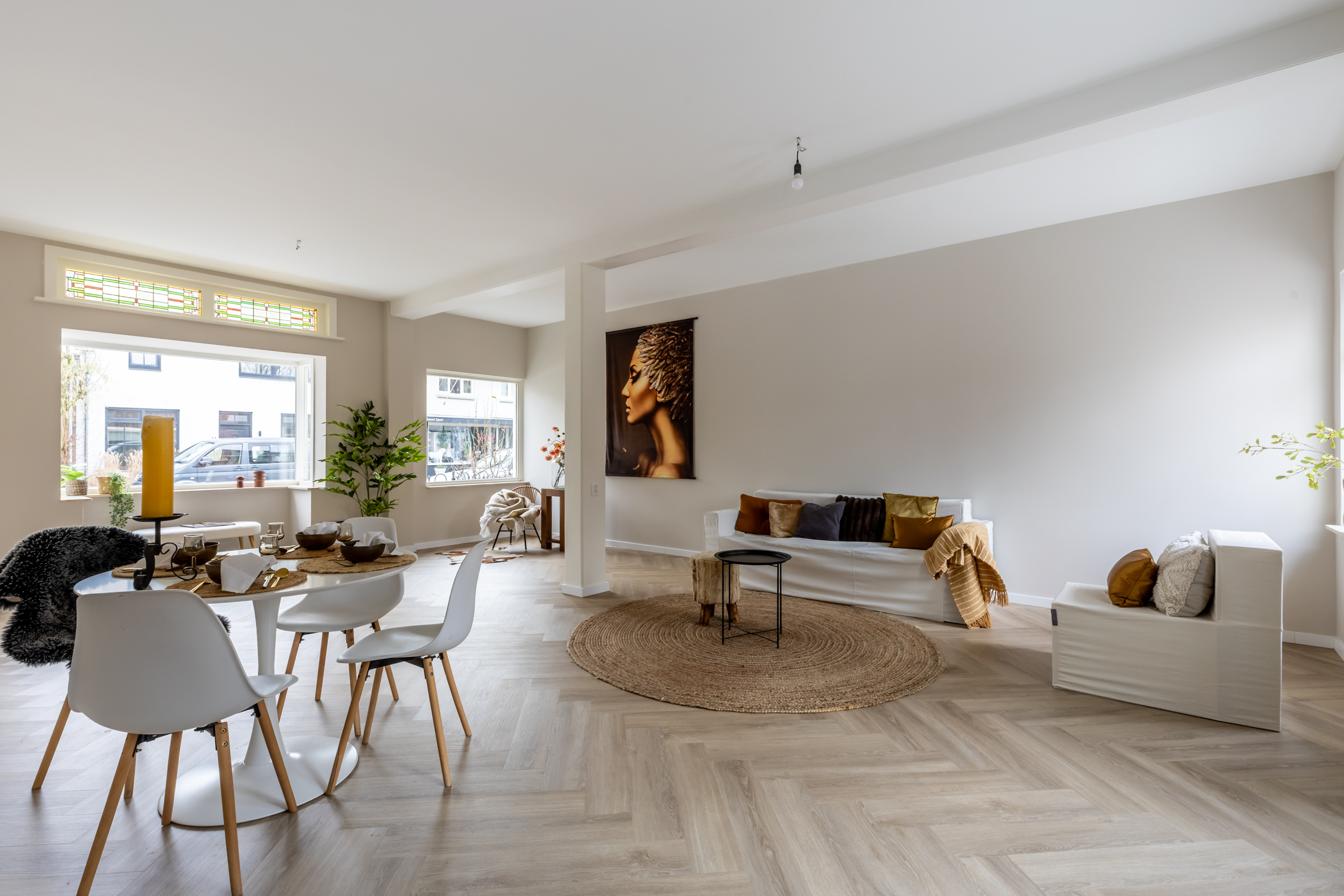 De overdekte entree met rondom authentieke glas-in-loodramen vormt een elegante binnenkomst en geeft toegang tot een royale hal. Vanuit hier zijn de recent vernieuwde meterkast, de trapopgang naar de eerste verdieping, de verdiepte trapkast en de woonkamer bereikbaar. De volledige begane grond is voorzien van een hoogwaardige PVC visgraatvloer inclusief vloerverwarming.