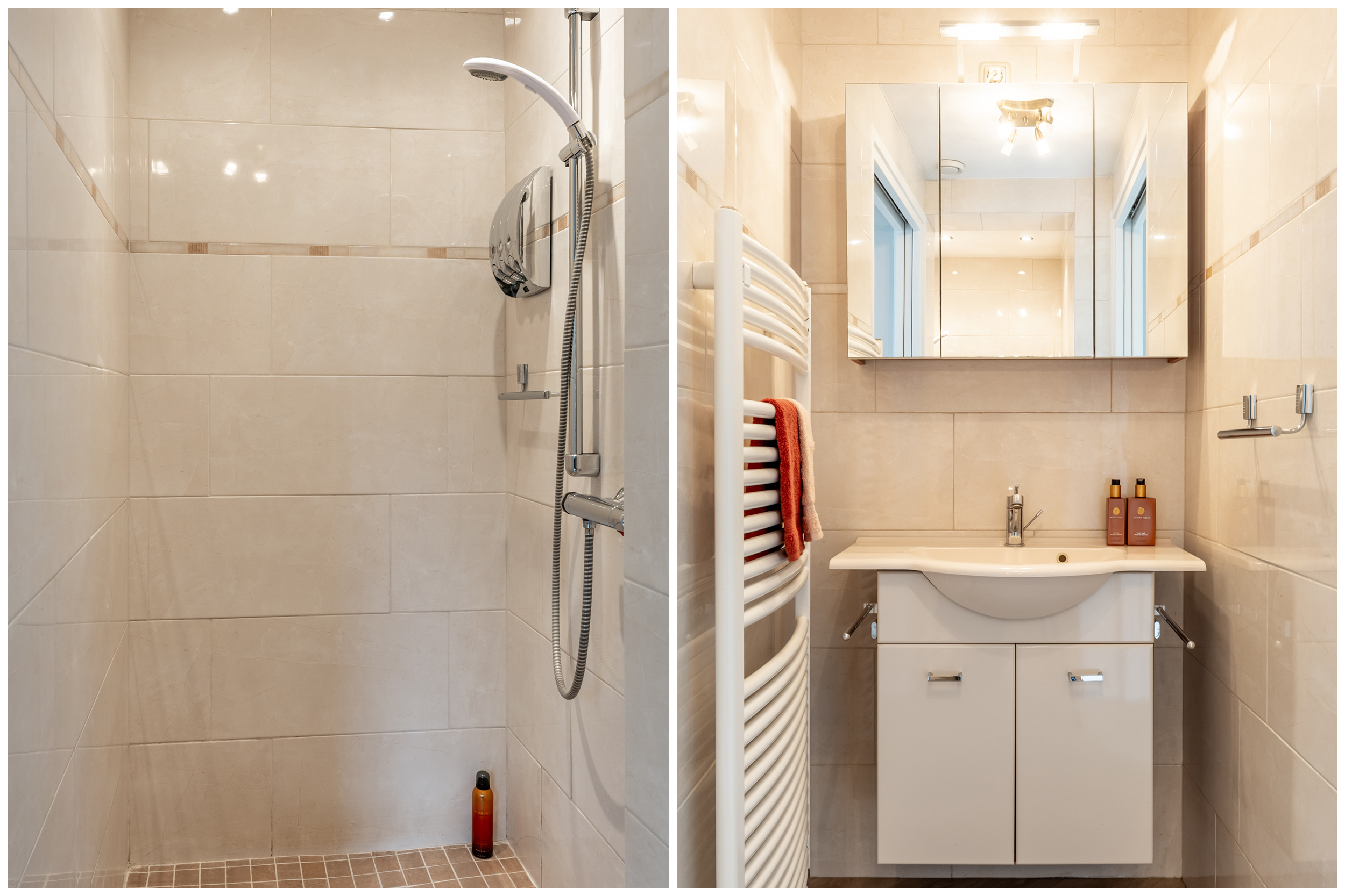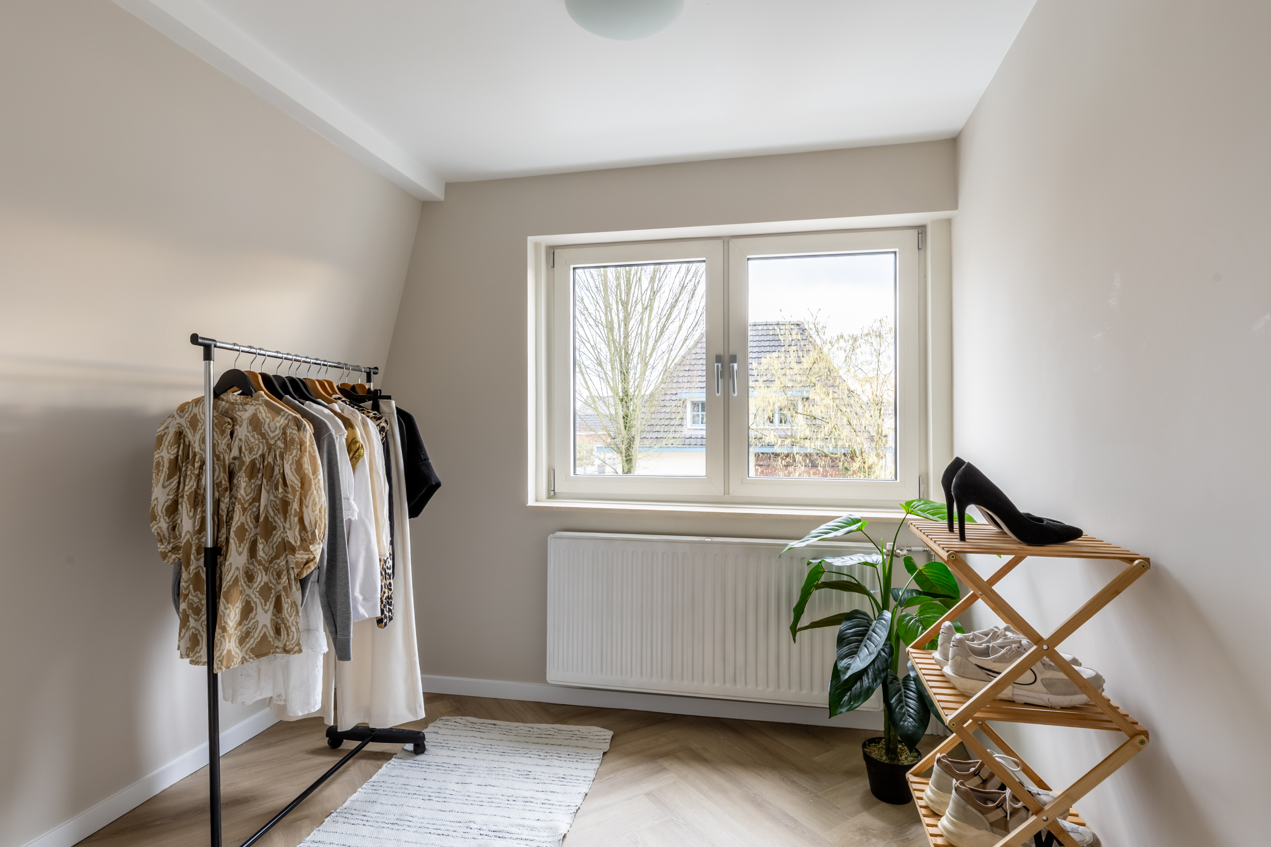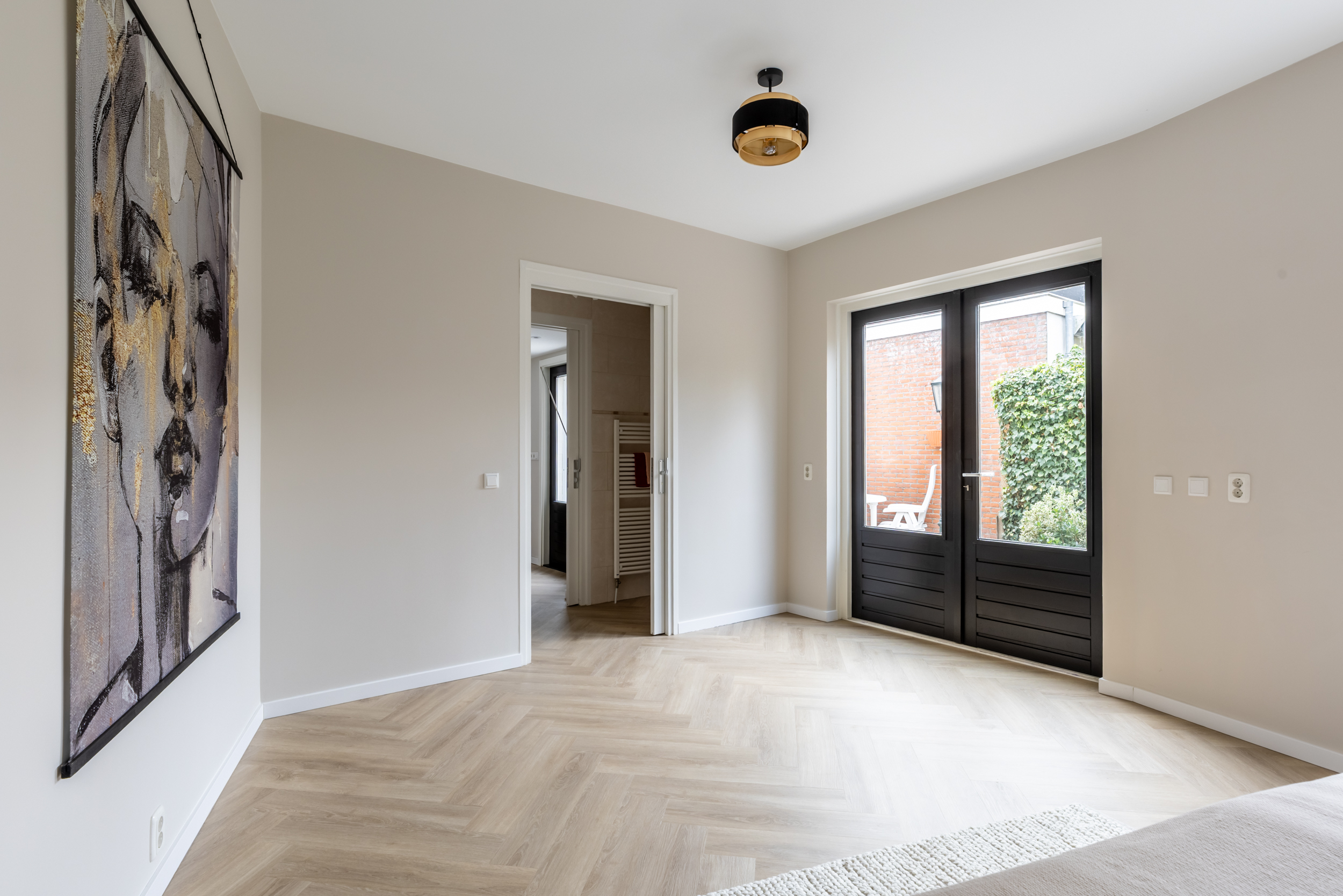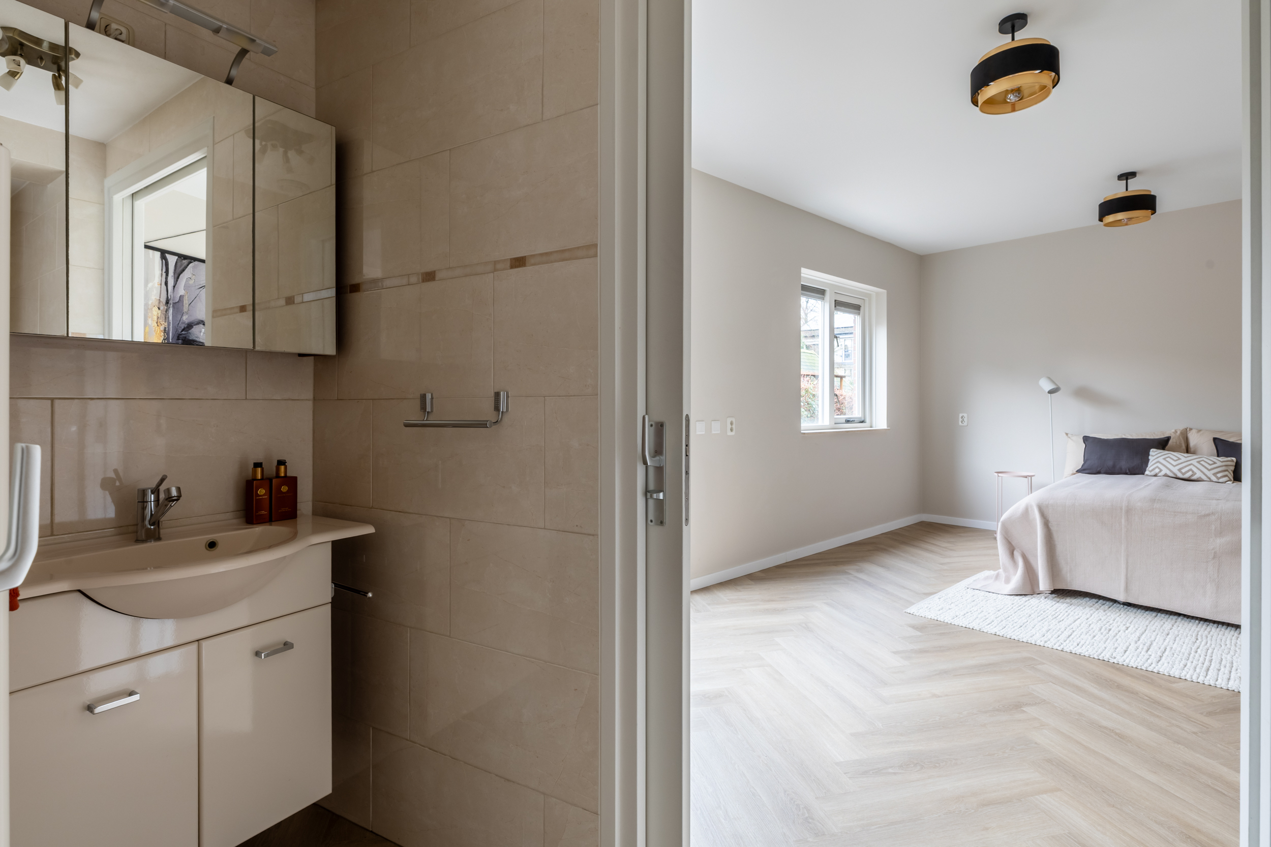 Via een nette schuifdeur is vanuit de keuken een tussenportaal bereikbaar. Hier vindt je aan de ene zijde een inloopdouche en aan de andere zijde een wastafelmeubel en een radiator. Aansluitend bevindt zich, eveneens via een schuifdeur, een ruime en lichte slaap-/werk-/speelkamer. Deze kamer beschikt over een grote raampartij en dubbele tuindeuren naar de achtertuin. Deze veelzijdige ruimte leent zich uitstekend voor gelijkvloers wonen, een luxe thuiskantoor of een speelkamer voor de kinderen.