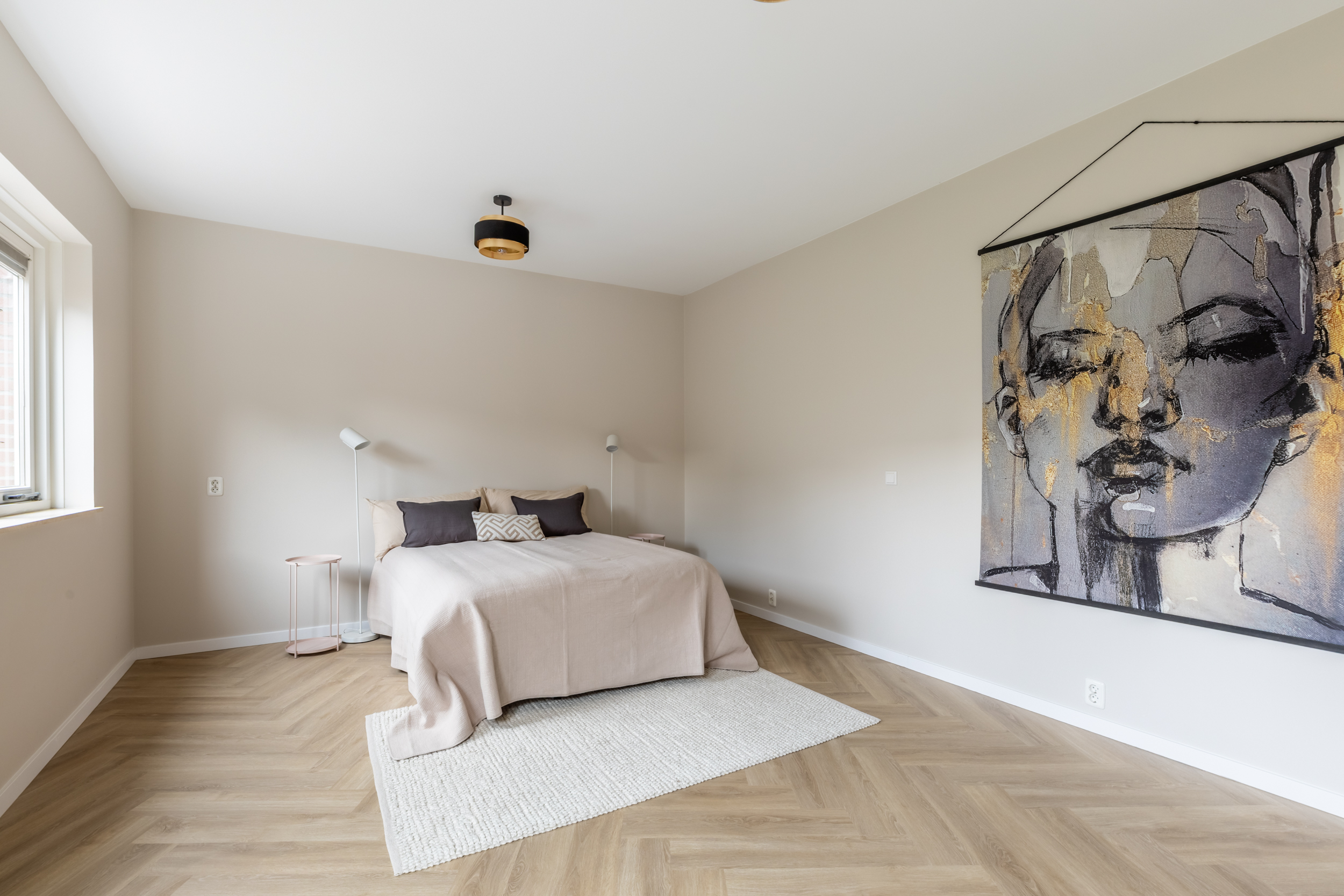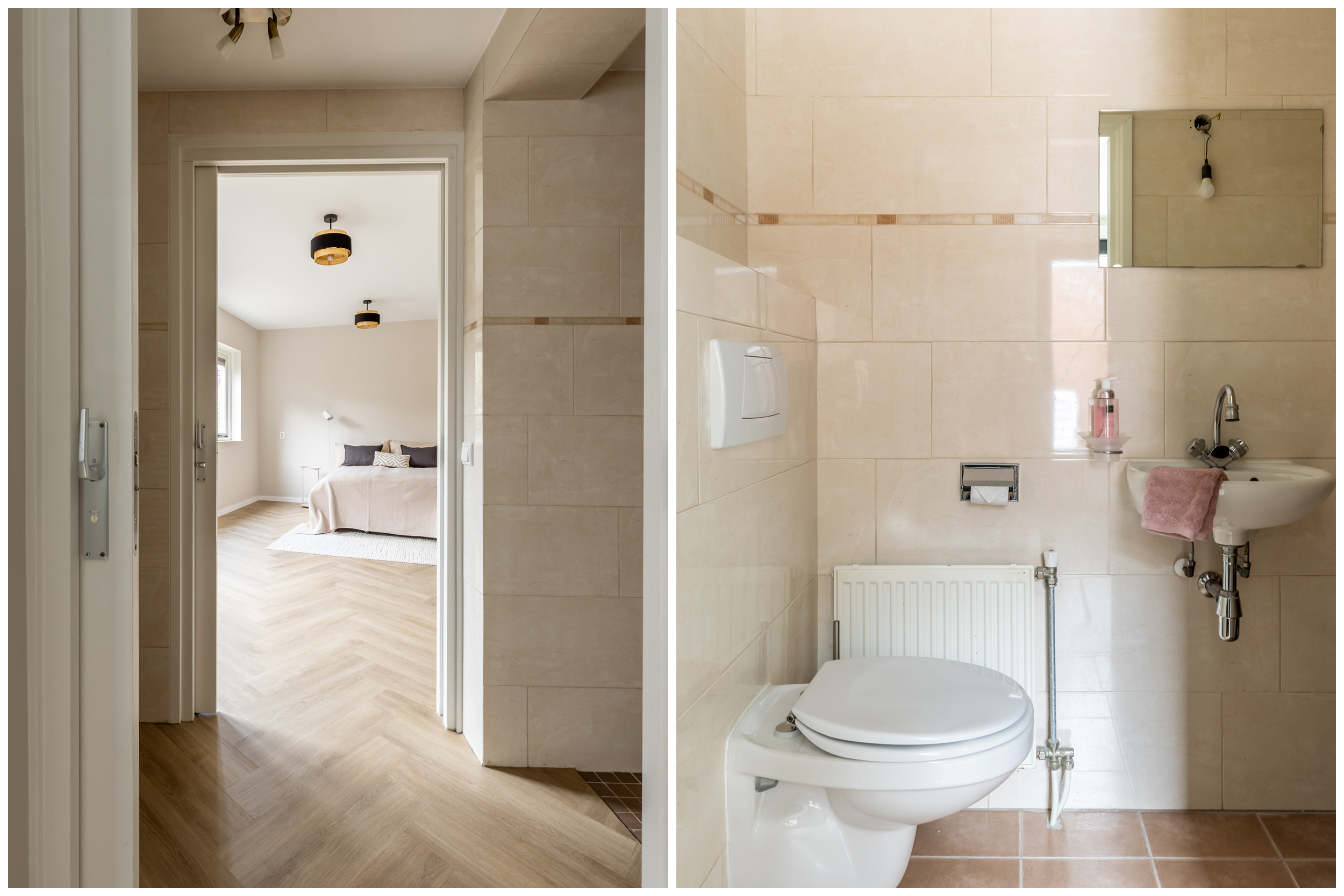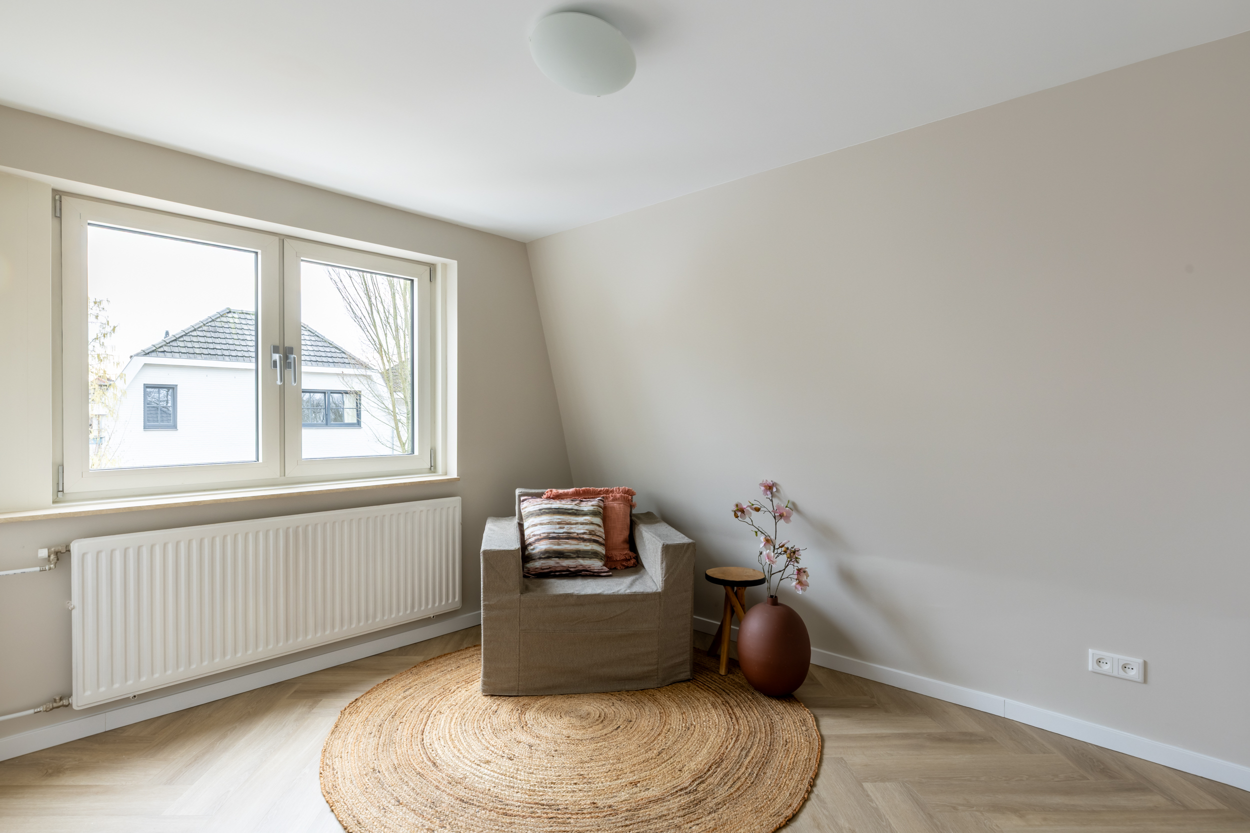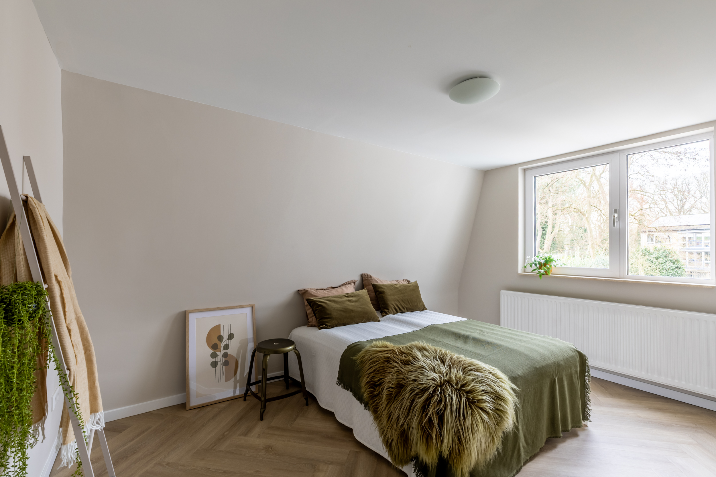 Via een nette schuifdeur is vanuit de keuken een tussenportaal bereikbaar. Hier vindt je aan de ene zijde een inloopdouche en aan de andere zijde een wastafelmeubel en een radiator. Aansluitend bevindt zich, eveneens via een schuifdeur, een ruime en lichte slaap-/werk-/speelkamer. Deze kamer beschikt over een grote raampartij en dubbele tuindeuren naar de achtertuin. Deze veelzijdige ruimte leent zich uitstekend voor gelijkvloers wonen, een luxe thuiskantoor of een speelkamer voor de kinderen.