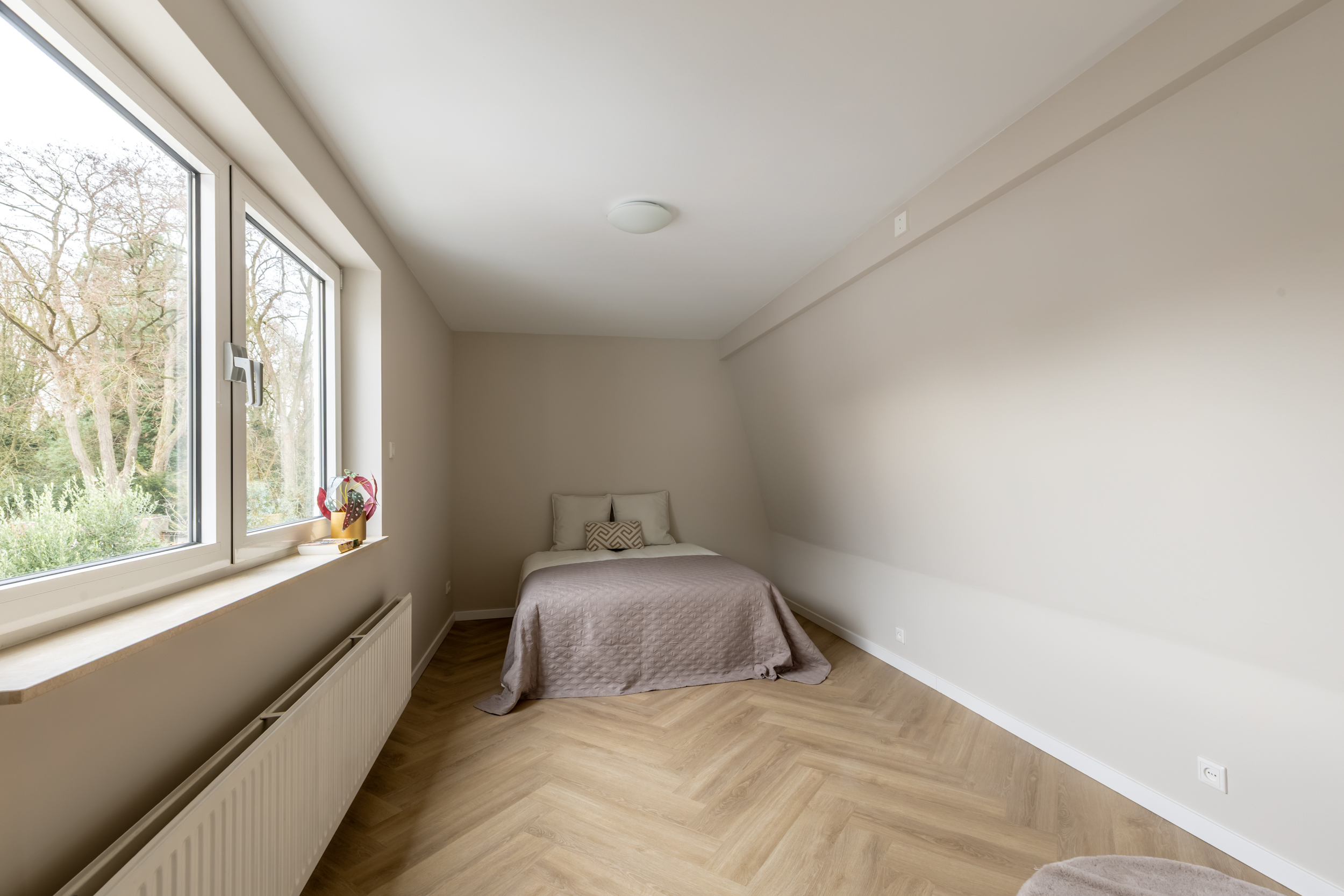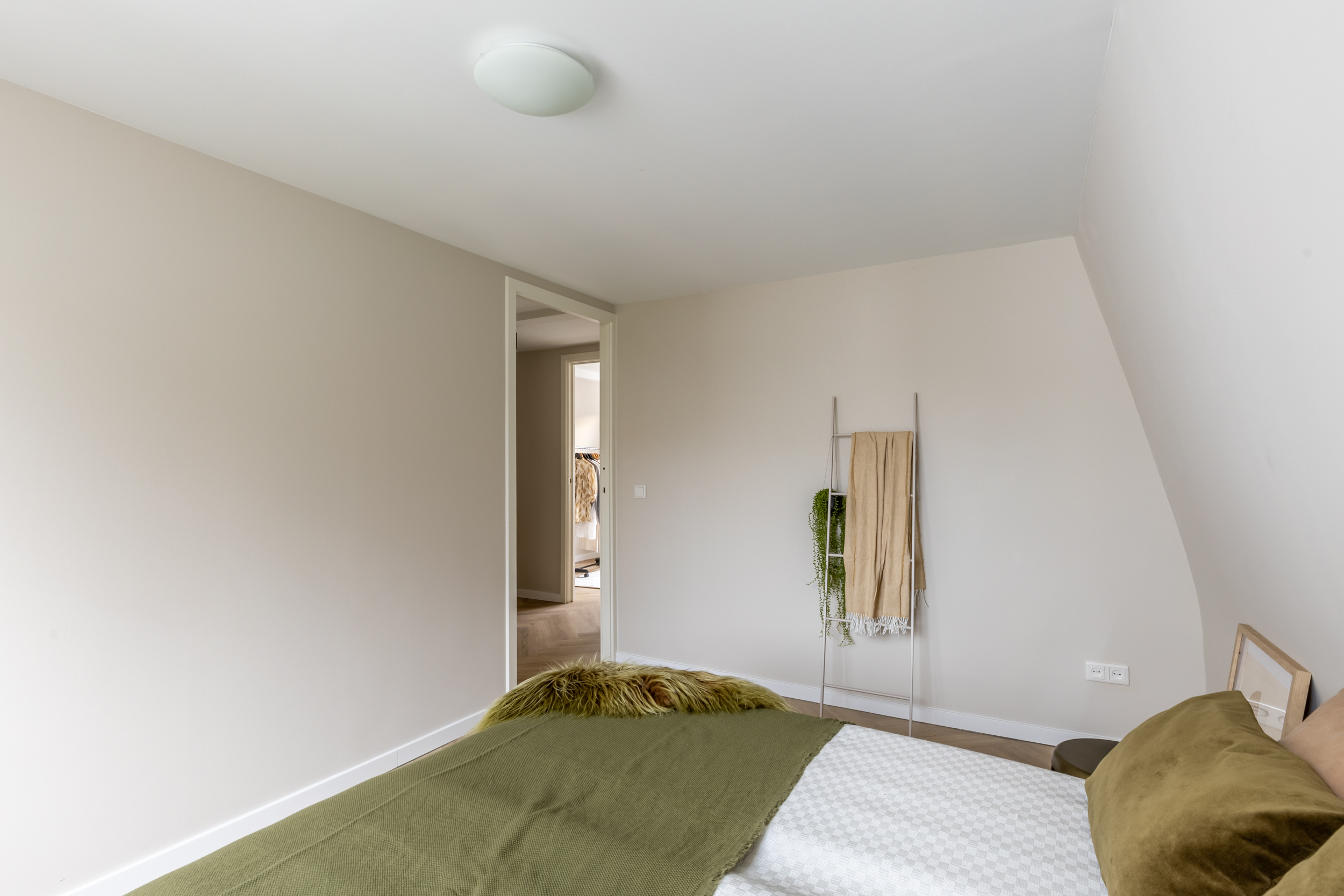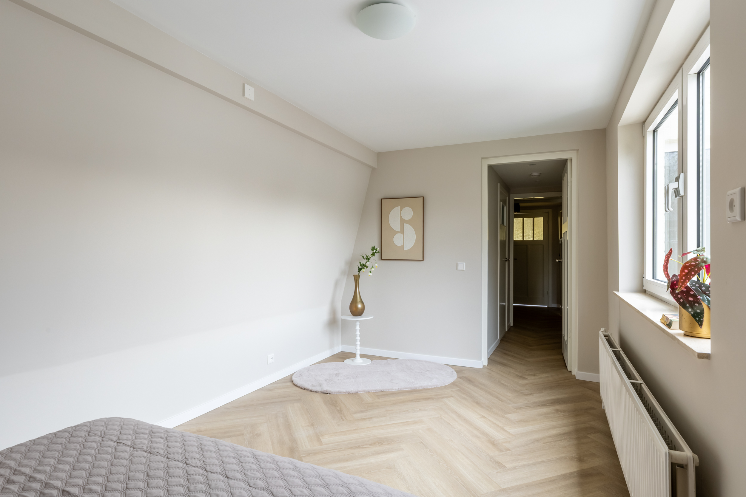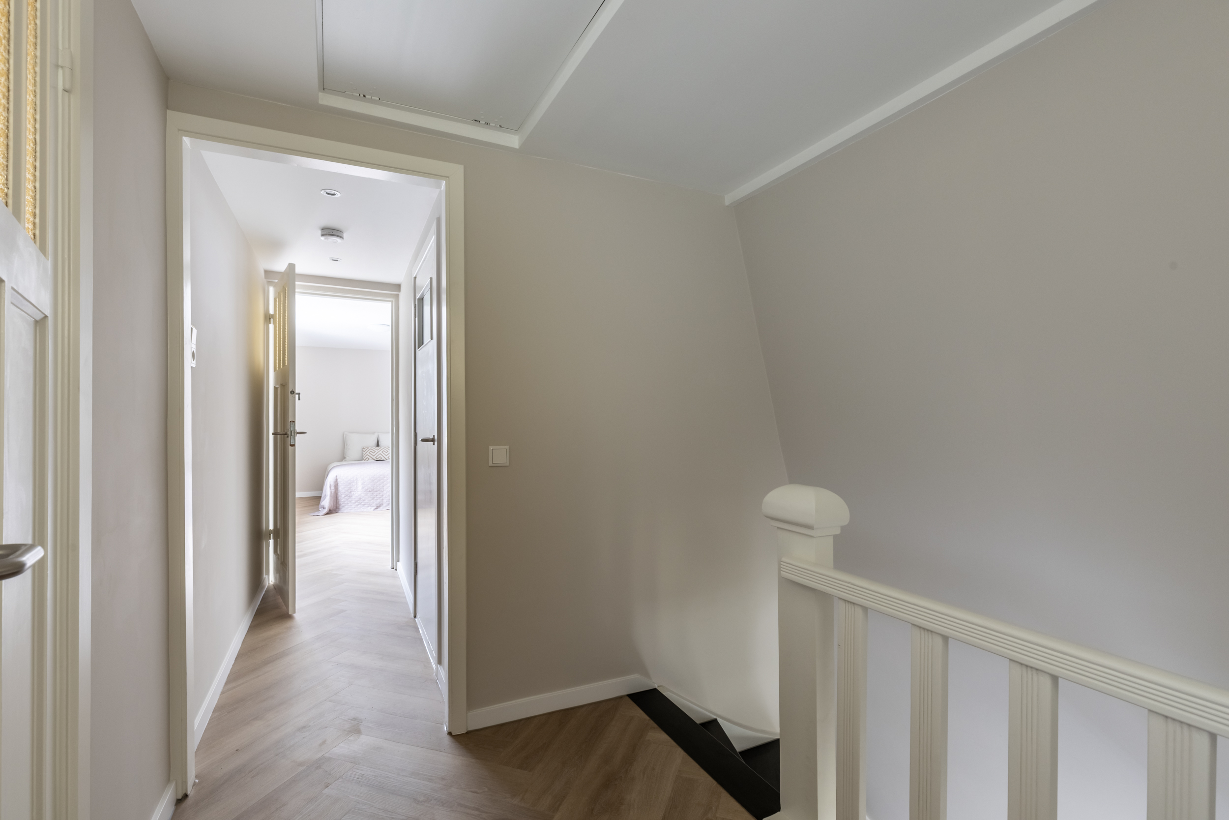 Vanuit de trapopgang is de ruime overloop van de eerste verdieping bereikbaar. Ook deze verdieping is dus volledig gerenoveerd en afgewerkt in dezelfde hoogwaardige stijl als de begane grond. De overloop en alle slaapkamers zijn voorzien van een doorlopende visgraatvloer. Vanuit de overloop is er toegang tot vier slaapkamers, de badkamer en zolder (middels vlizotrap).