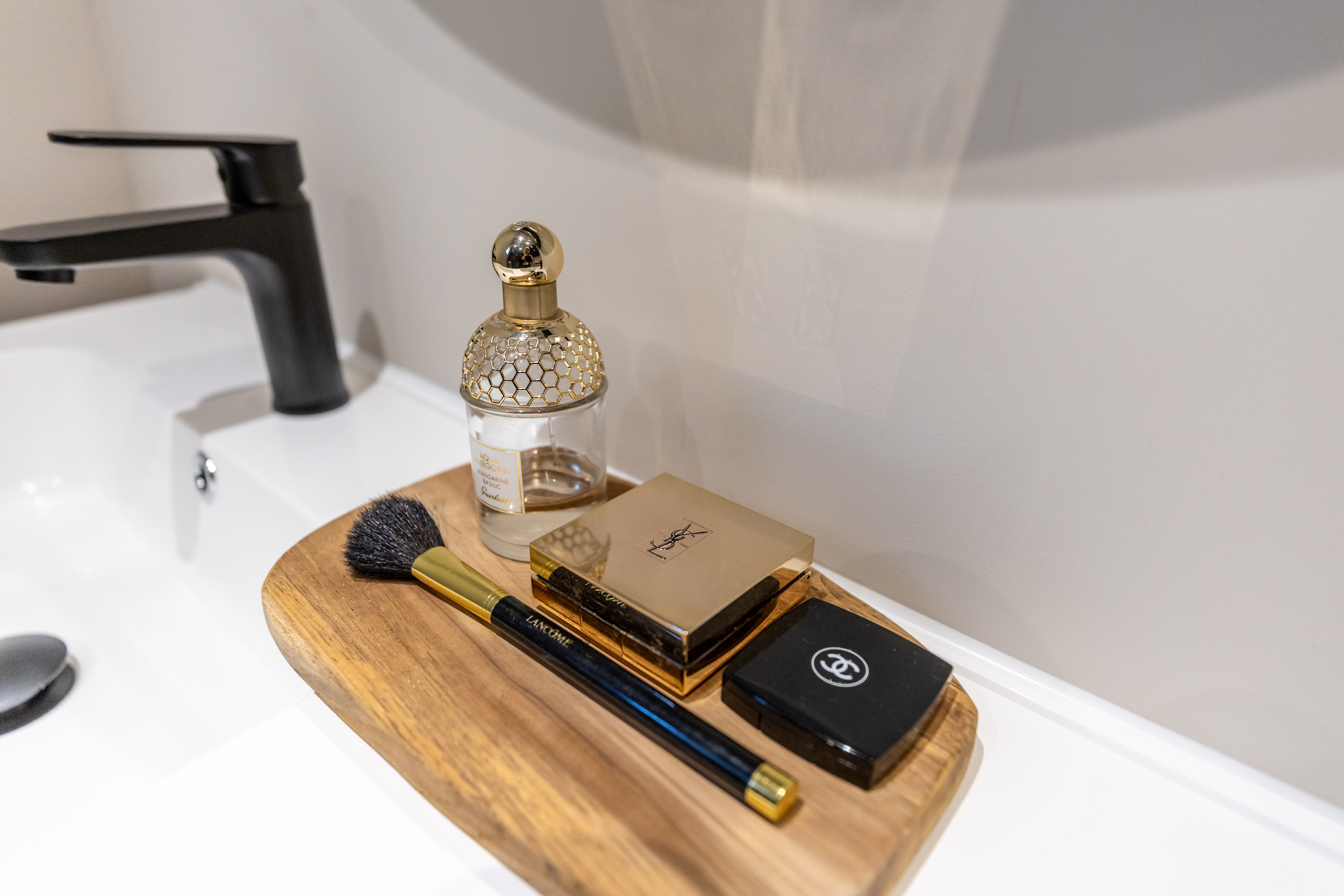 De volledig vernieuwde badkamer is modern ingericht en afgewerkt. De ruimte is voorzien van een inloopdouche met regendouchefunctie en strak zwart sanitair. Verder beschikt de badkamer over een stijlvol dubbel wastafelmeubel met geïntegreerde kranen, een grote ronde spiegel met verlichting en een hangend toilet. De gekozen materialen en afwerking geven de badkamer een hotelwaardige uitstraling en sluiten perfect aan bij het hoogwaardige woonniveau van de woning.