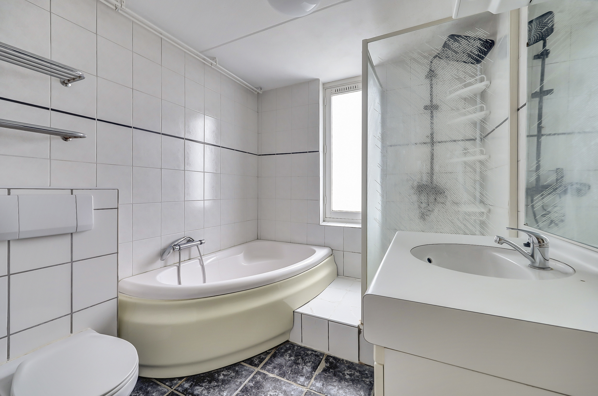 - Ligbad, toilet, douche, wastafel en wastafelmeubel