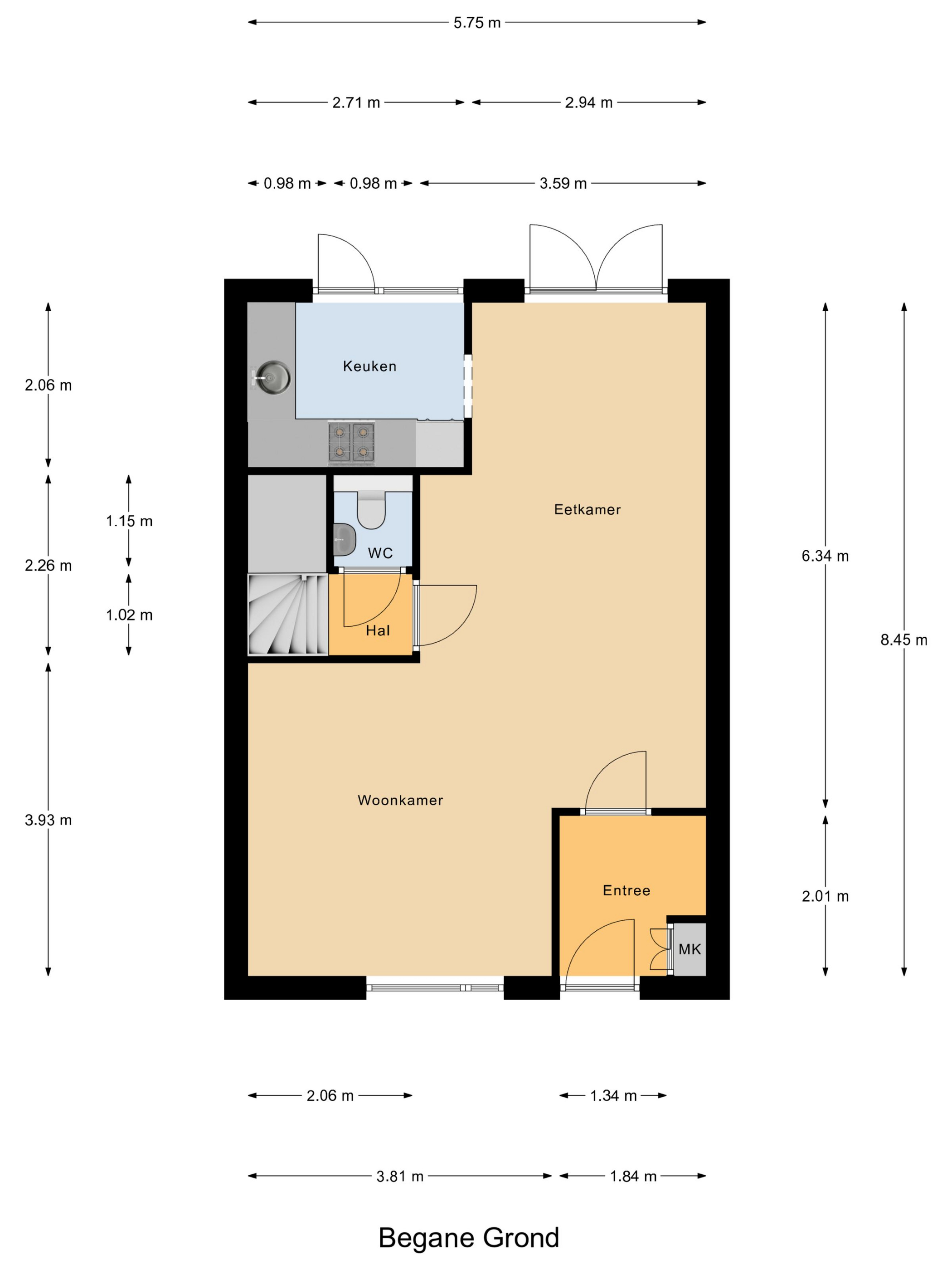 Via de voordeur betreed je de woning en kom je in de entreehal met toegang tot de meterkast en de woonkamer. De woonkamer is uitgevoerd in een prettige L-vorm, waardoor er voldoende ruimte is voor een gezellige zithoek en een grote eettafel. Dankzij de dubbele tuindeuren is er een directe verbinding met de tuin. Vanuit de woonkamer is de keuken bereikbaar. De keuken is uitgerust met een combi-oven, koelkast, vaatwasser, gaskookplaat en beschikt over een deur naar de achtertuin. Tevens is er vanuit de woonkamer toegang tot een gang met toilet en de trapopgang naar de eerste verdieping.