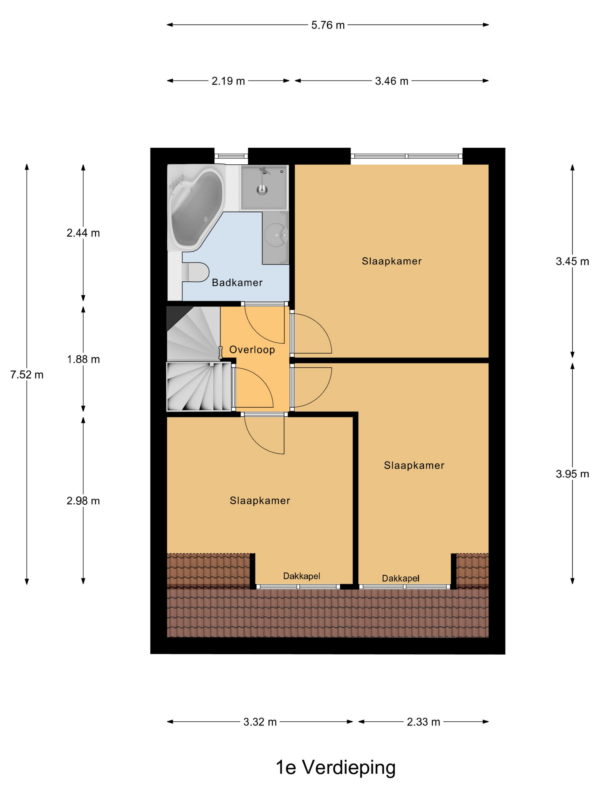 Via de trap bereik je de overloop op de eerste verdieping. Vanaf hier heb je toegang tot drie ruime slaapkamers en de badkamer. De hoofdslaapkamer biedt voldoende ruimte voor een tweepersoonsbed en een grote kledingkast. De andere twee slaapkamers zijn extra ruim dankzij het dakkapel en daardoor zeer geschikt als kinderkamer. De badkamer is compleet uitgevoerd met een wastafelmeubel, douche, toilet en ligbad.