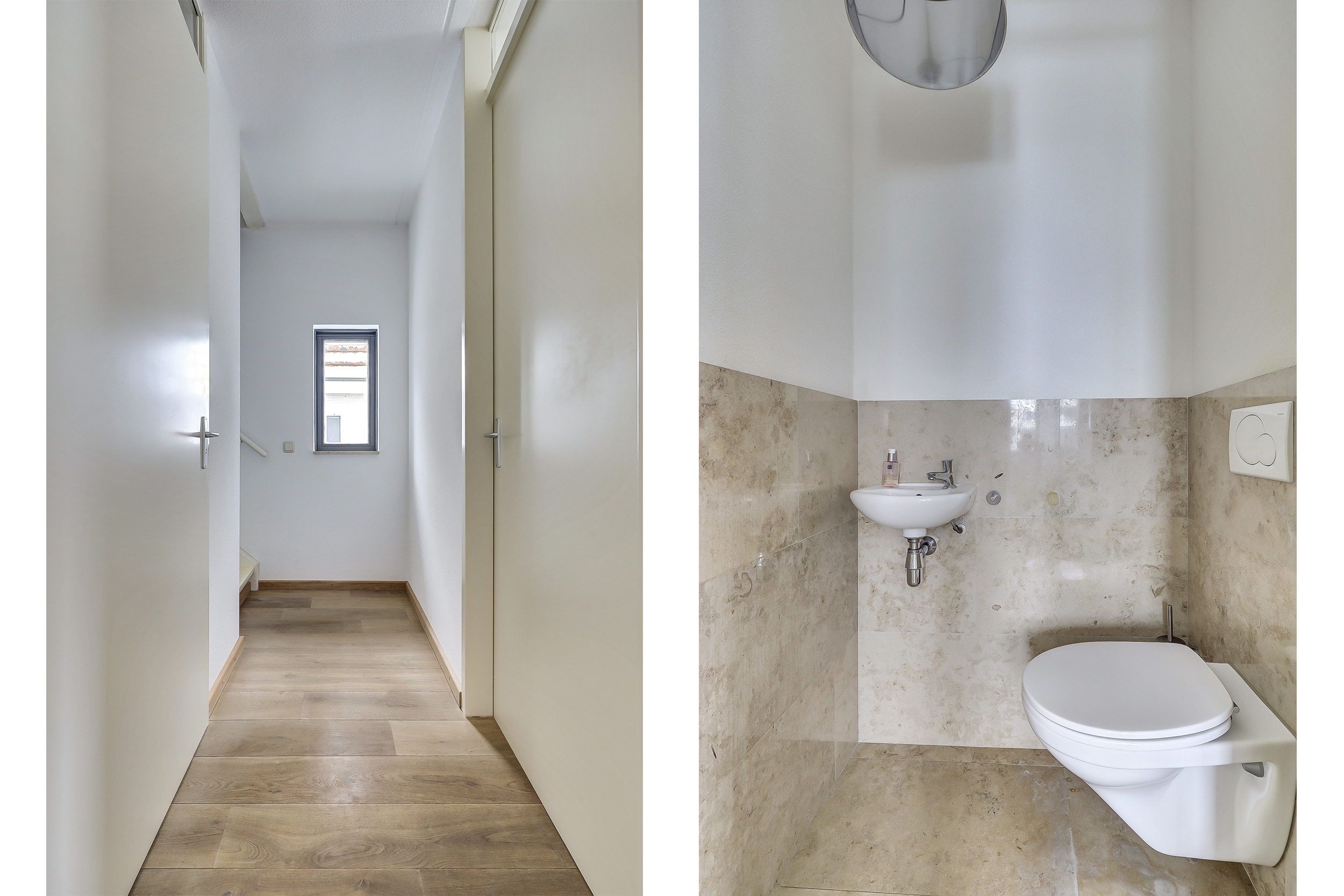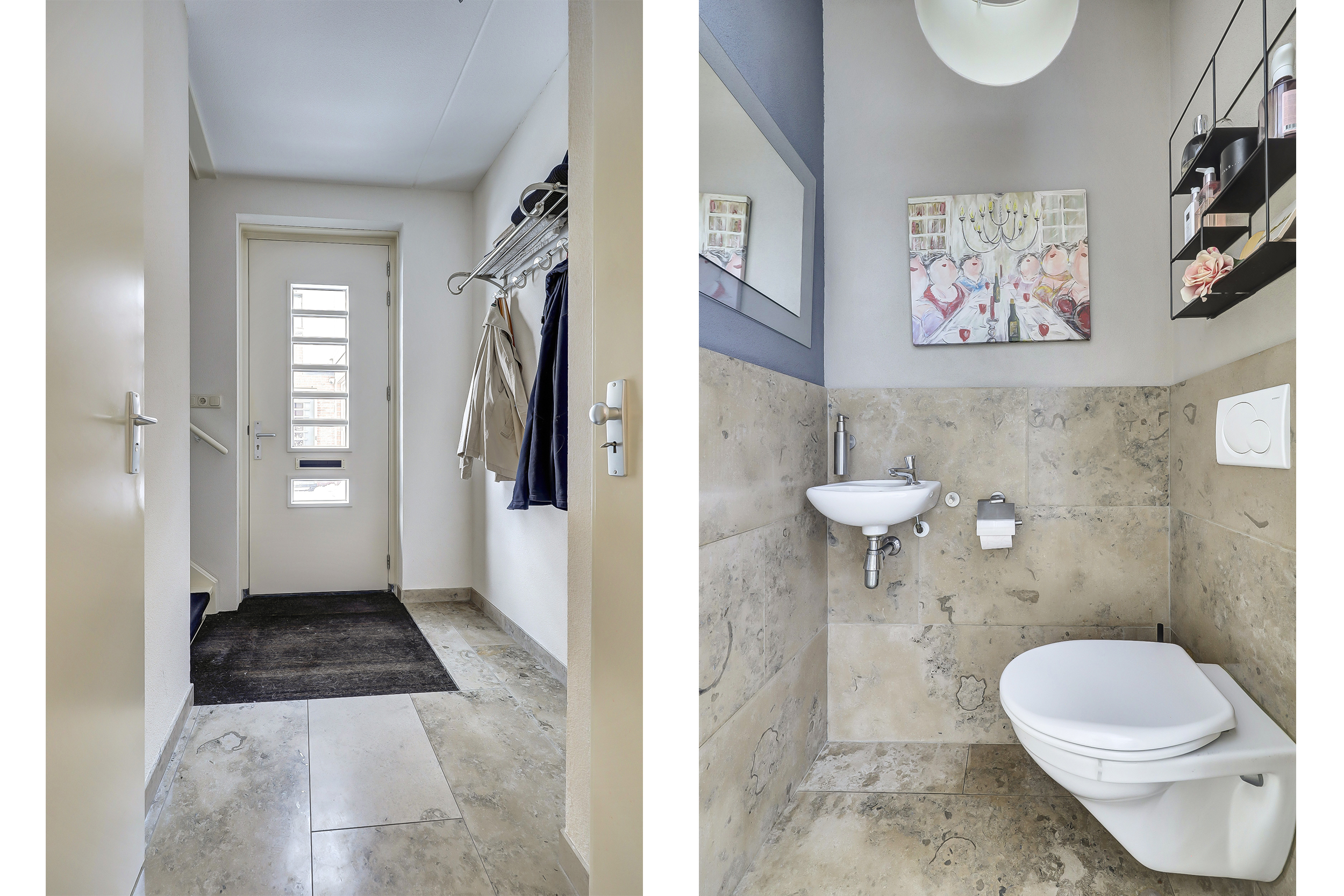 Via de entree betreedt u de ruime hal met garderobe, meterkast en moderne toiletruimte met wandcloset en fonteintje. Vanuit de hal is er toegang tot de woonkamer en de open keuken.