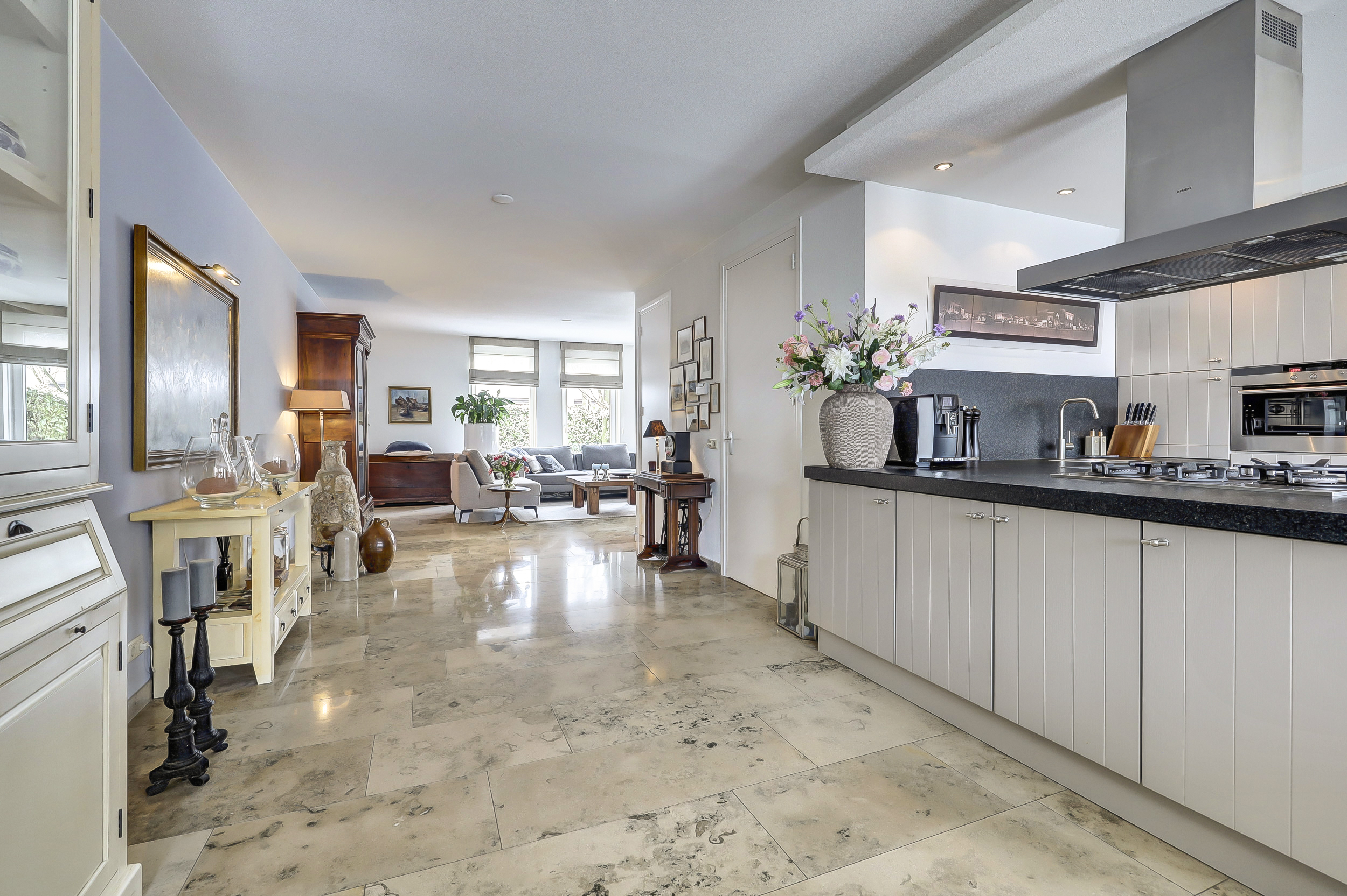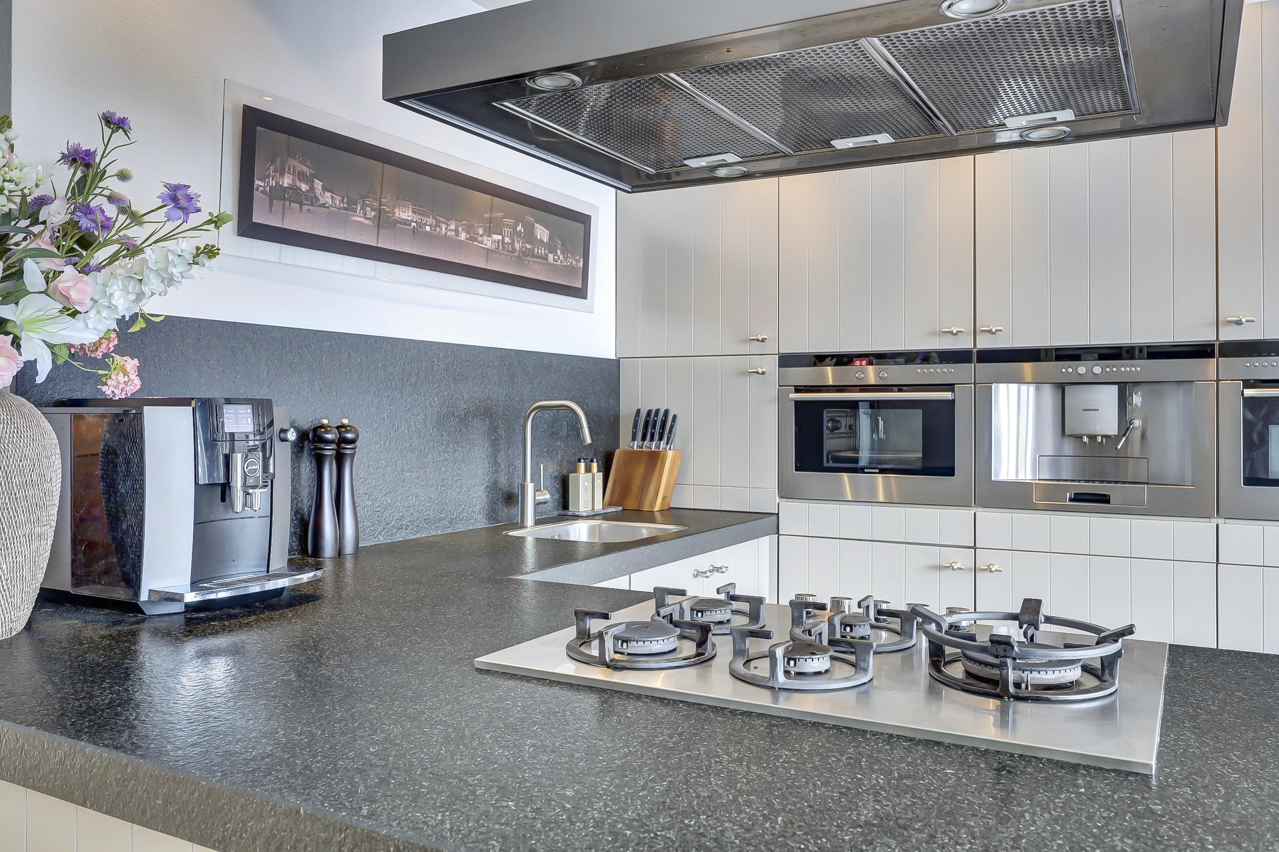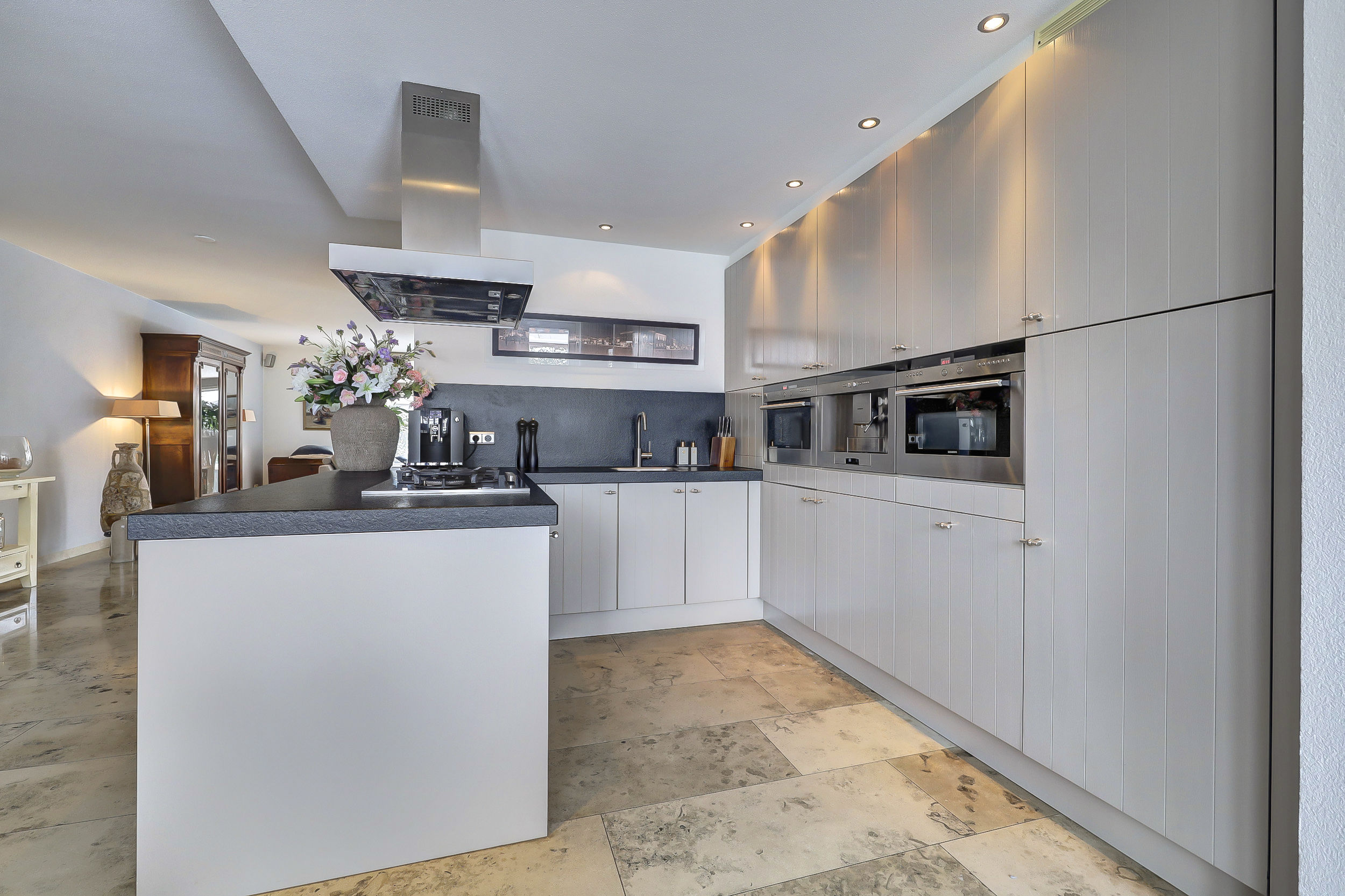 De moderne keuken is geplaatst in een u-opstelling en voorzien van diverse inbouwapparatuur, waaronder een koelkast, vaatwasser, stoomoven, oven en een gasfornuis met afzuigkap. De doordachte indeling biedt veel werk- en bergruimte. Vanuit de keuken is er een prettige verbinding met de tuin.