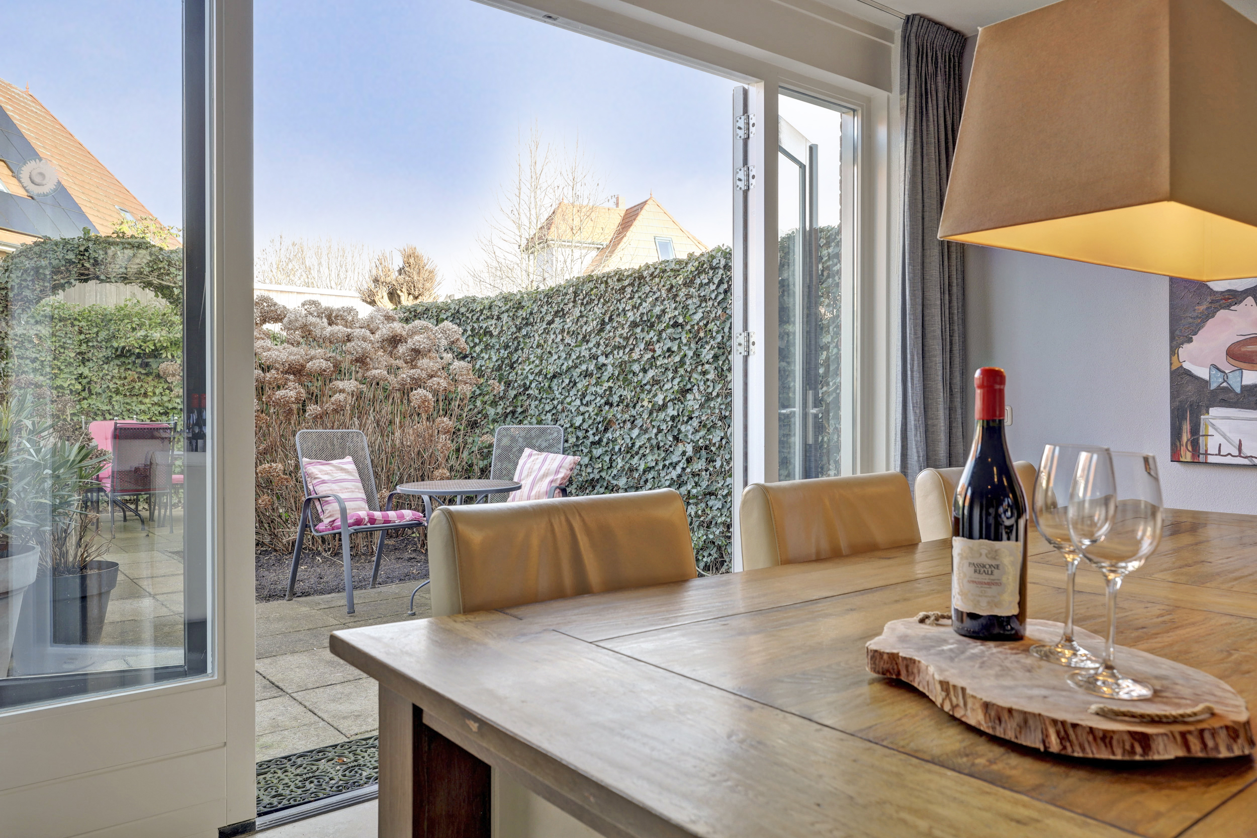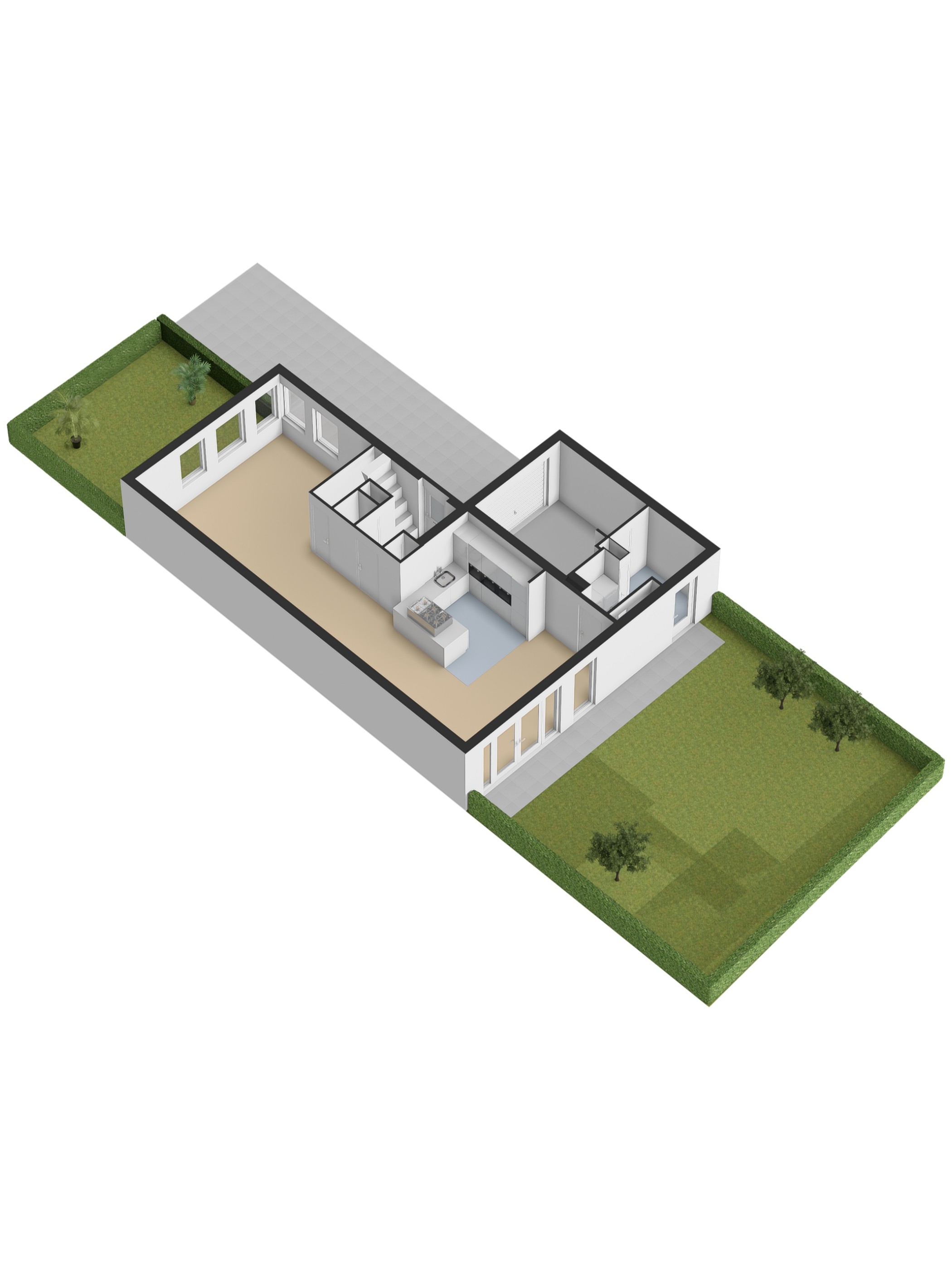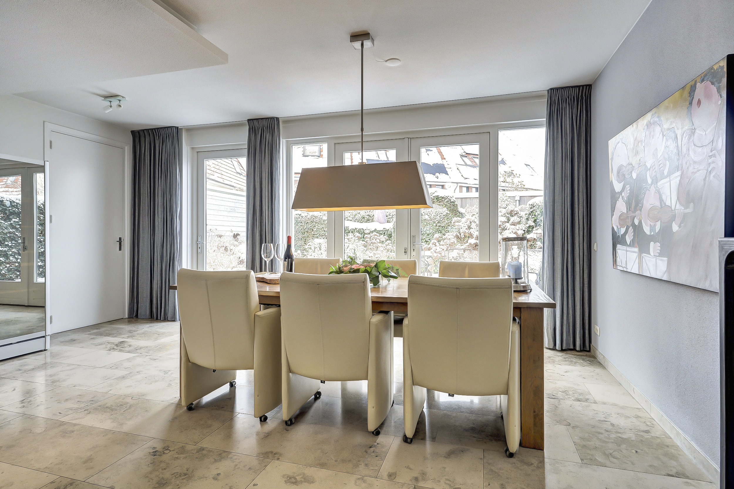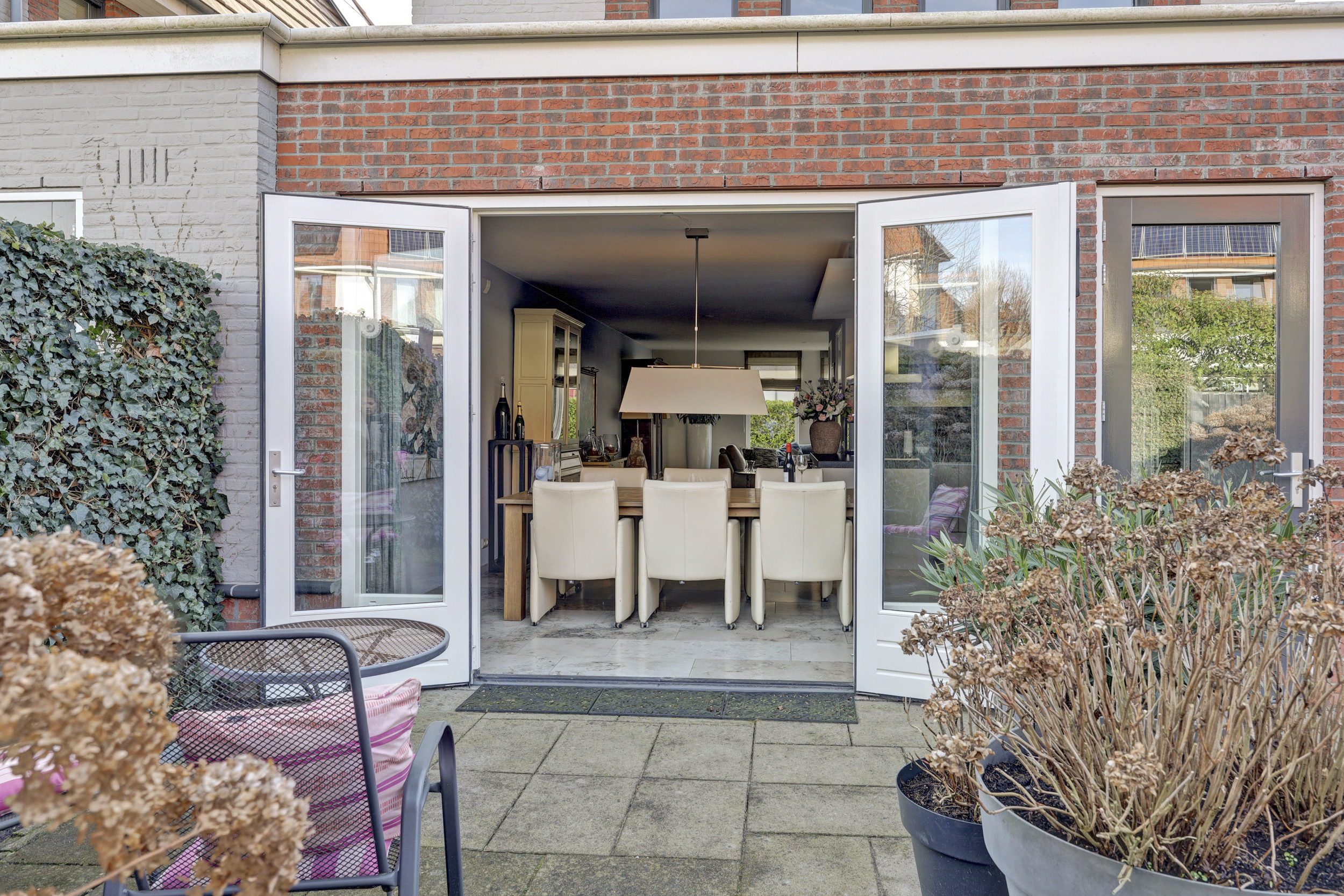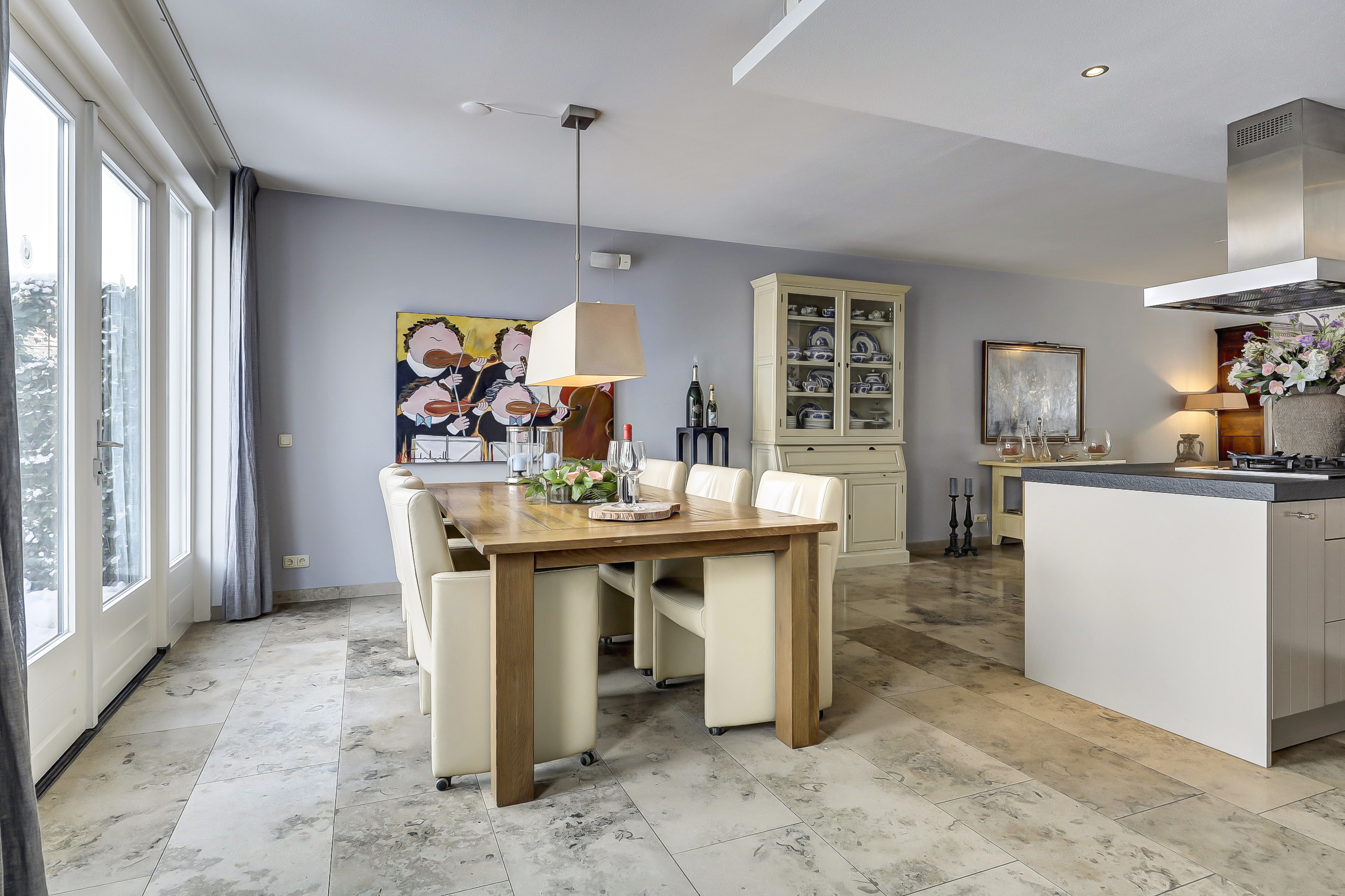 Aan de achterzijde bevindt zich de open woonkeuken met openslaande deuren naar de tuin, waar ruimte is voor een royale eettafel. De keuken vormt hiermee een echte leefruimte en het centrale punt van de woning, ideaal voor dagelijkse maaltijden en gezellige diners.