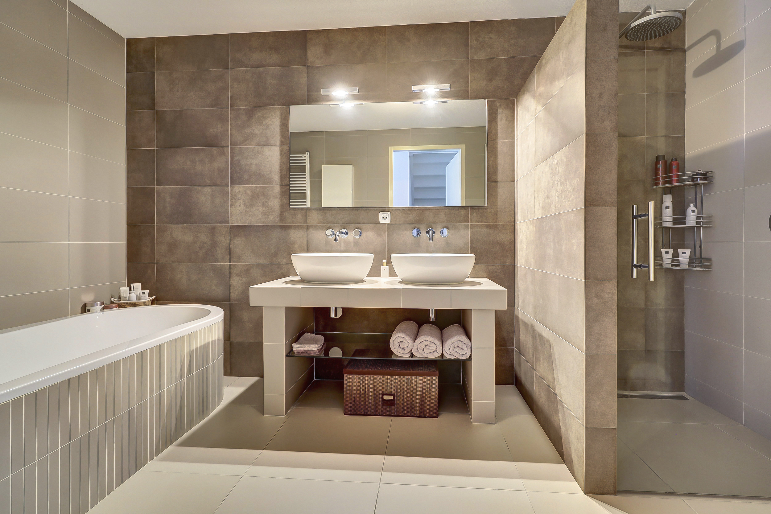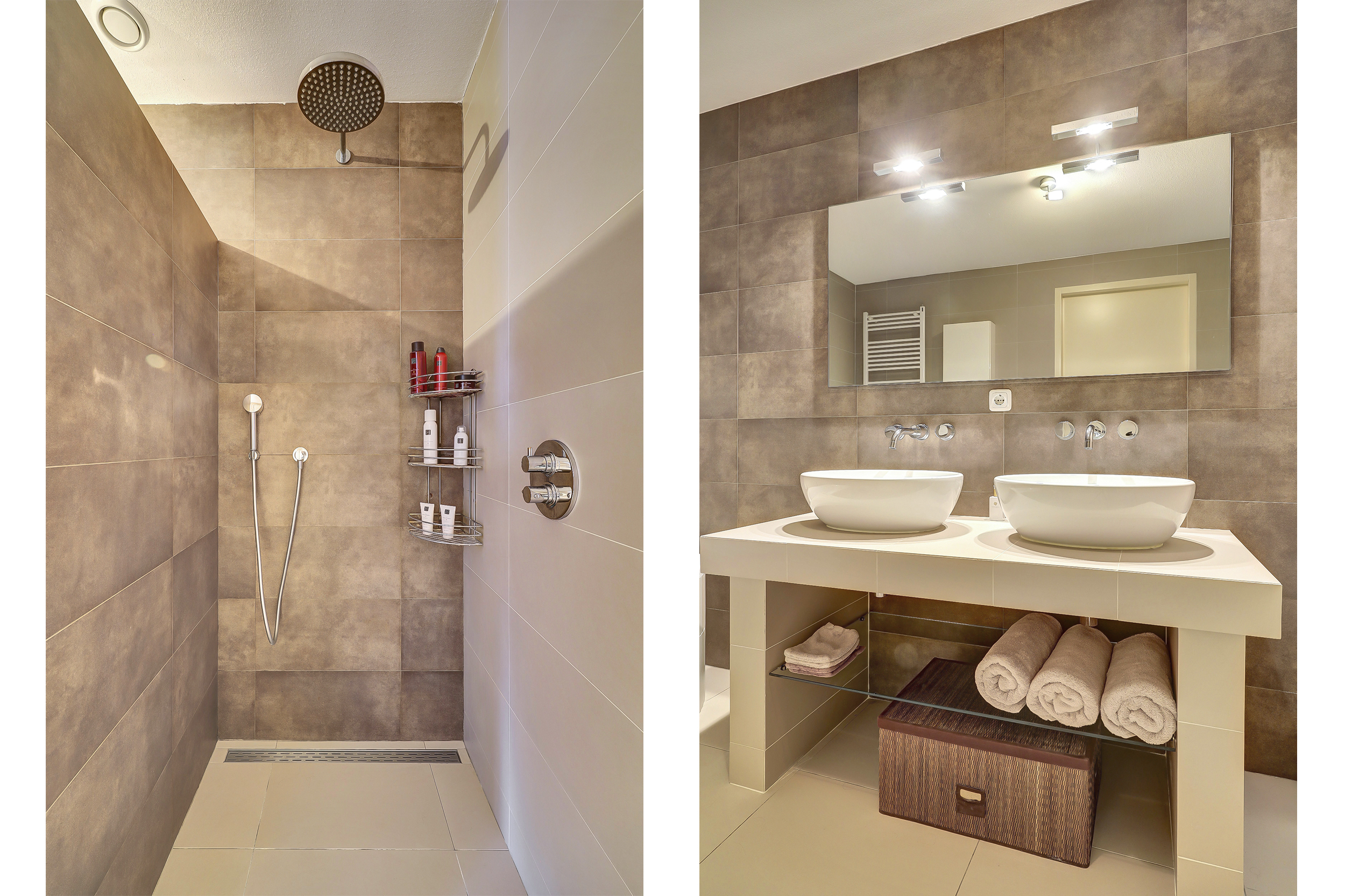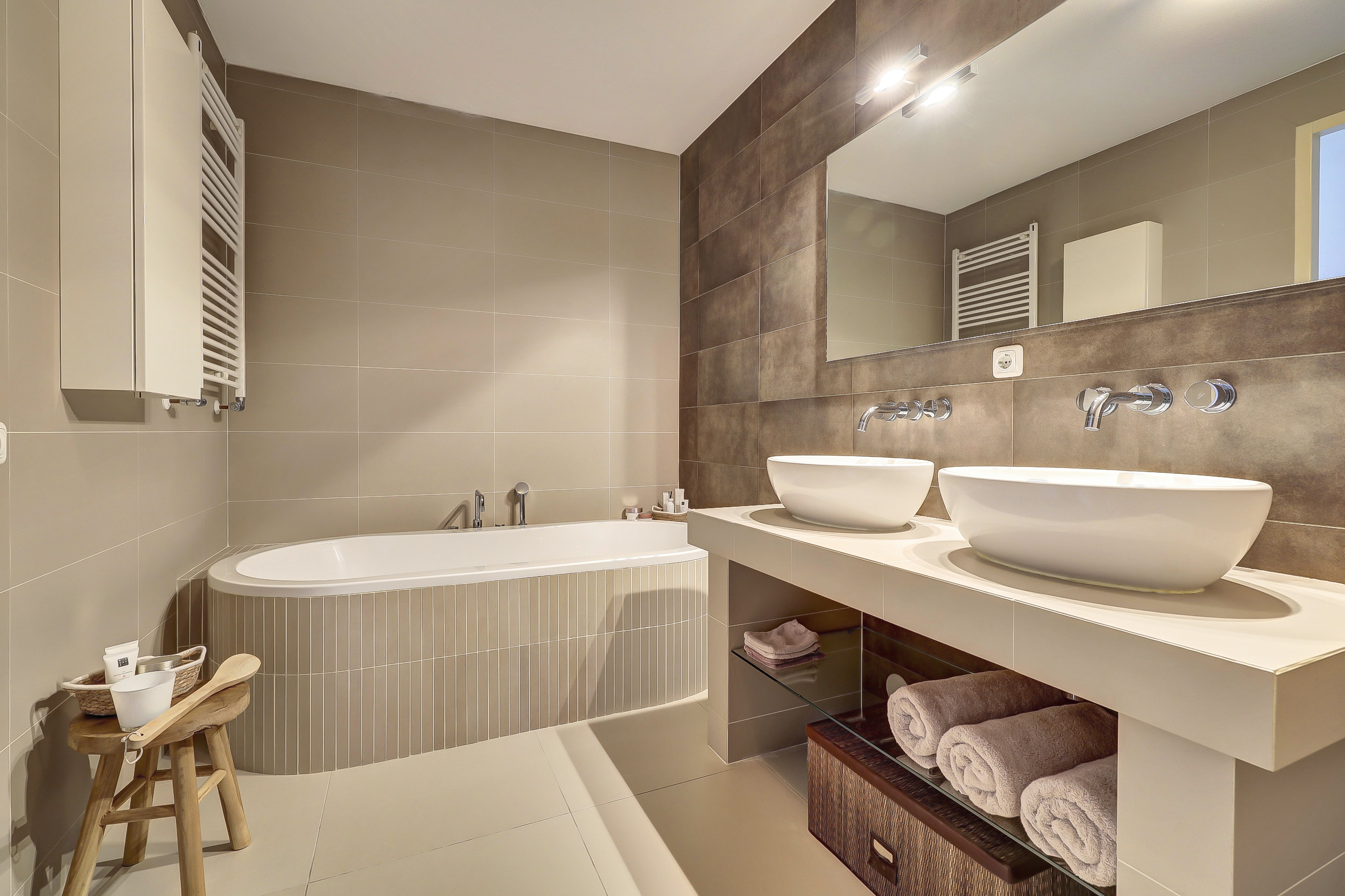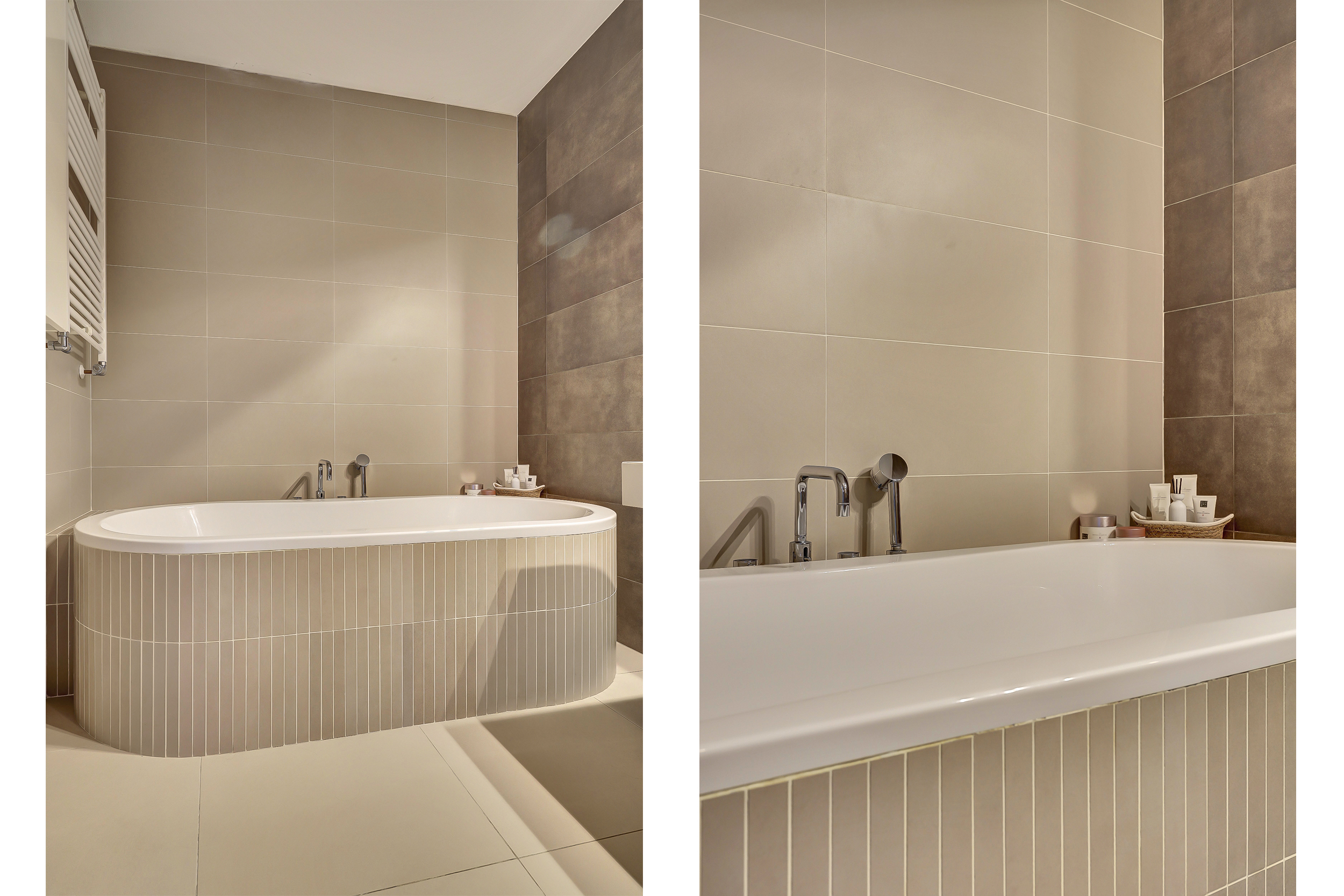 De badkamer is ruim opgezet en luxe uitgevoerd in een moderne, neutrale kleurstelling. Deze complete badkamer beschikt over een comfortabel ligbad, een ruime inloopdouche met regendouche, een dubbel wastafelmeubel en een grote spiegel met verlichting. Een heerlijke ruimte om de dag ontspannen te beginnen of af te sluiten.
