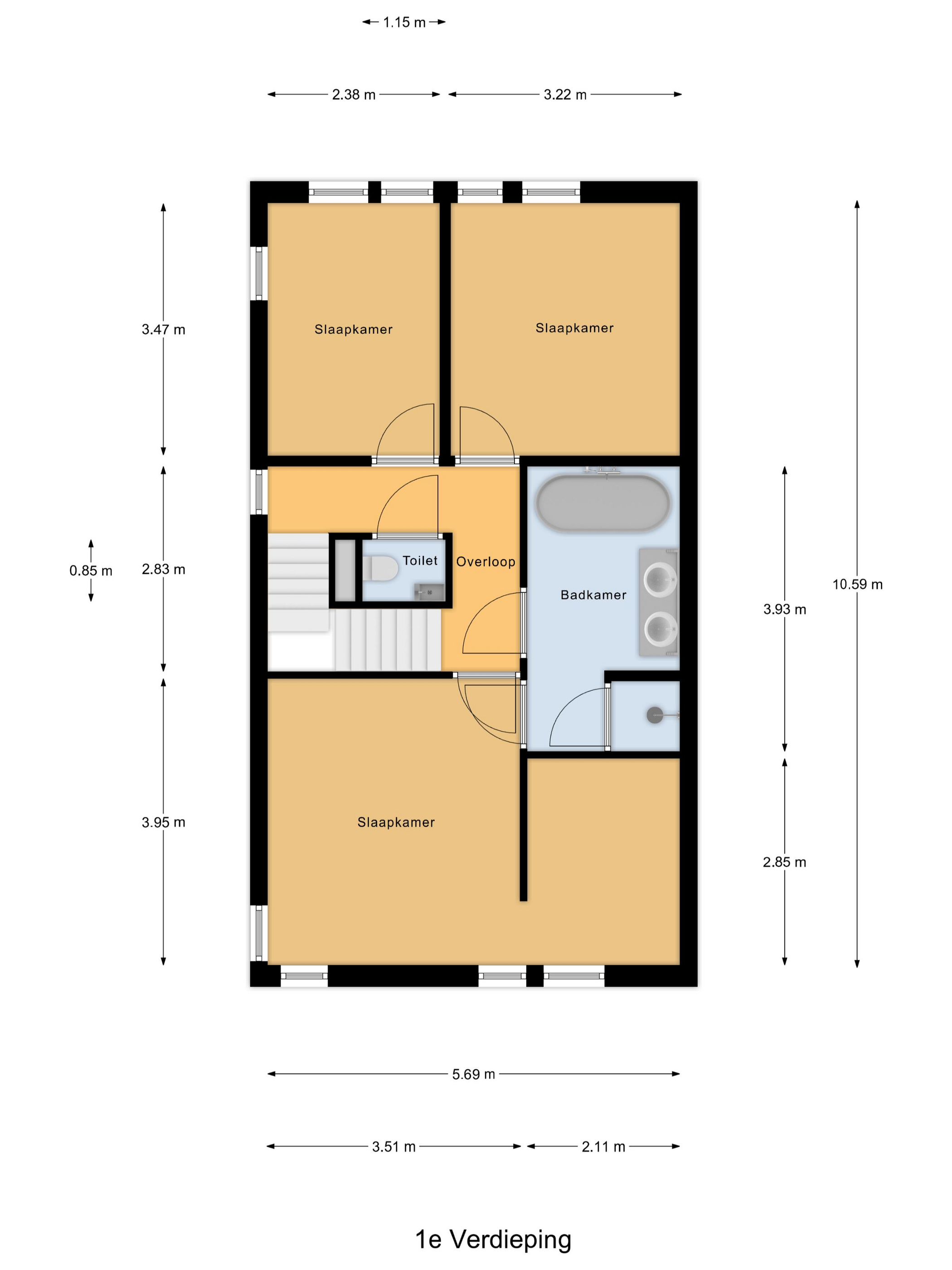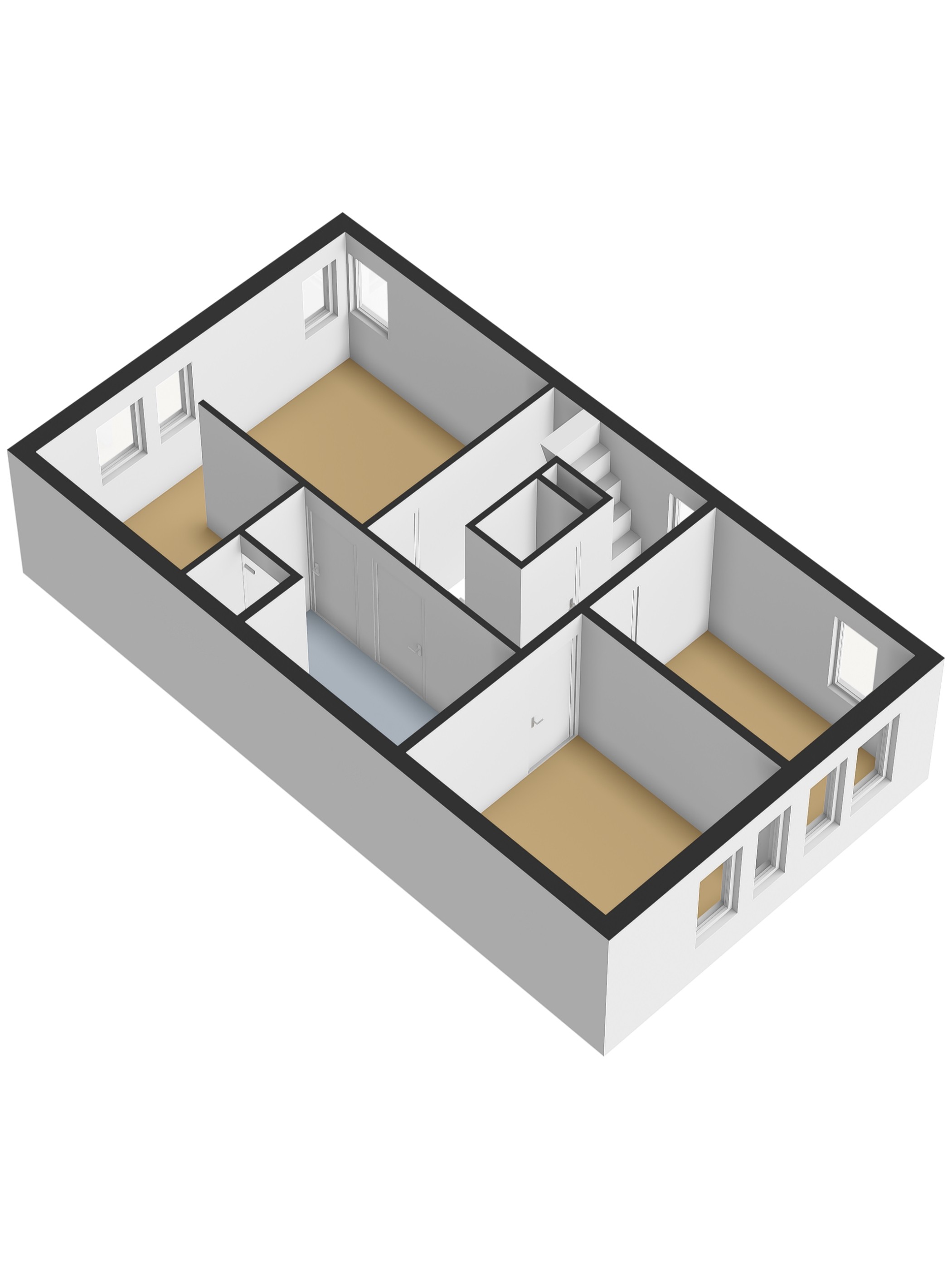 De ruime overloop geeft toegang tot drie volwaardige slaapkamers, de luxe badkamer, een separaat toilet en de vaste trapopgang naar de tweede verdieping. De verdieping is keurig afgewerkt met een houten laminaatvloer.