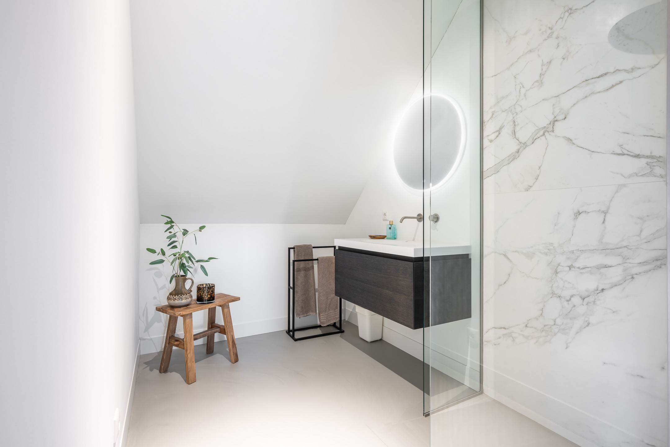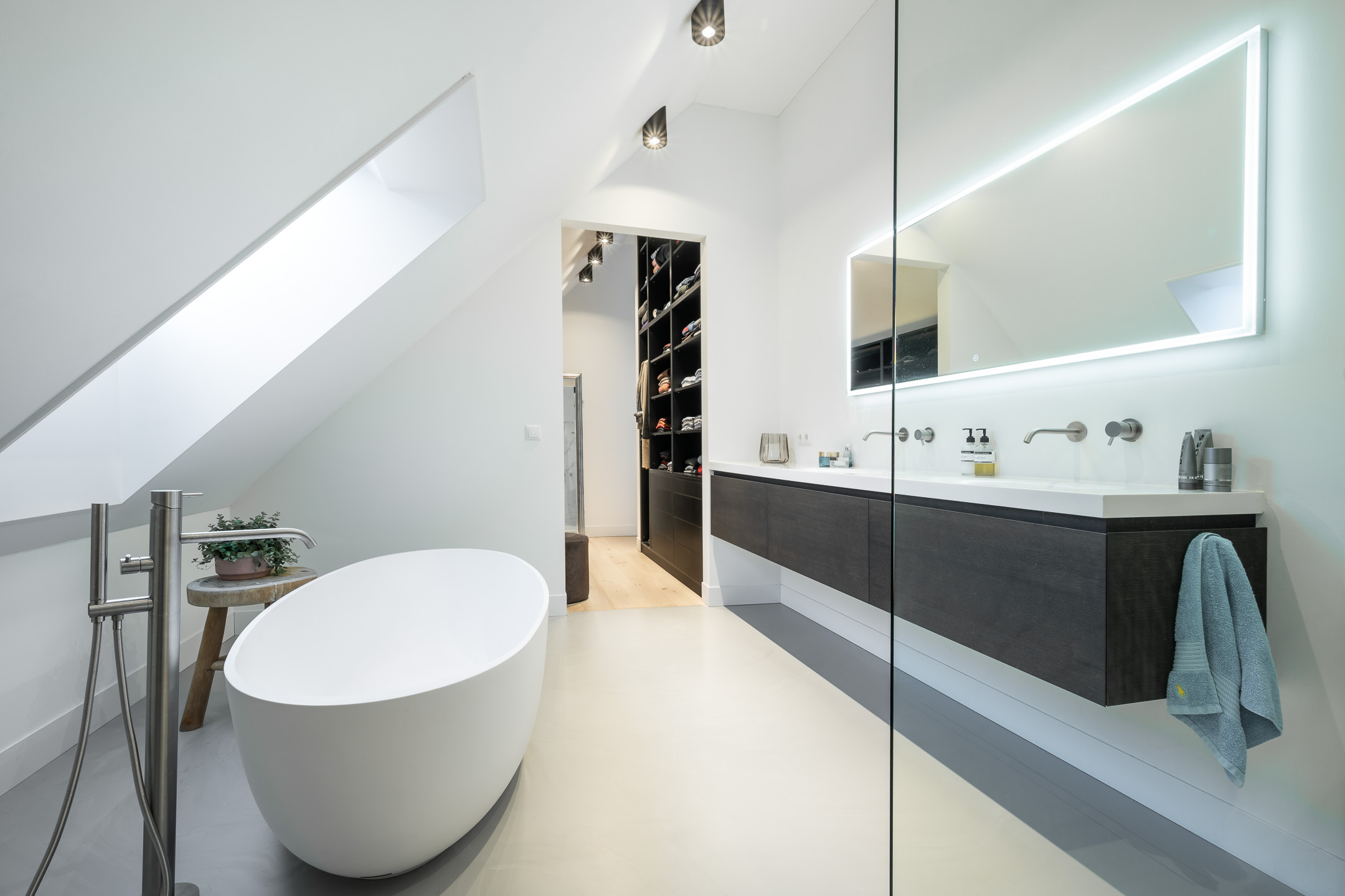 - Ligbad, dubbele wastafel, wastafelmeubel, inloopdouche, wastafel en vloerverwarming