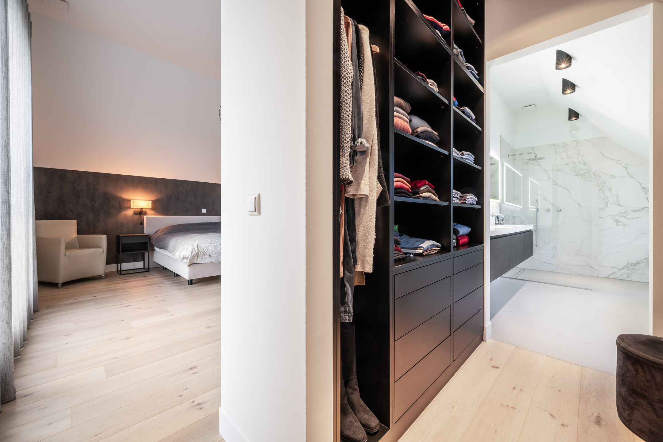 De overloop geeft toegang tot drie ruime slaapkamers en twee moderne badkamers en een separaat toilet. De trap naar deze verdieping is voorzien van subtiele ingebouwde LED-verlichting, wat zorgt voor een luxe uitstraling en extra comfort in de avonduren.De gehele verdieping is voorzien van een nette, doorlopende houten vloer en grote raampartijen die voor veel licht zorgen. De master bedroom ligt aan de voorzijde en is van royaal formaat. Deze kamer beschikt over een op maat gemaakte inbouwkledingkast en biedt volop ruimte voor een tweepersoonsbed en een zithoek. Aansluitend bevindt zich de luxe en-suite badkamer, uitgevoerd in een strakke witte stijl met hoogwaardige materialen. De ruimte is uitgerust met een dubbele wastafel met meubel, een ruime inloopdouche met stijlvolle tegels met marmeren motief en glazen douchewand, en een vrijstaand ligbad onder het dakraam.