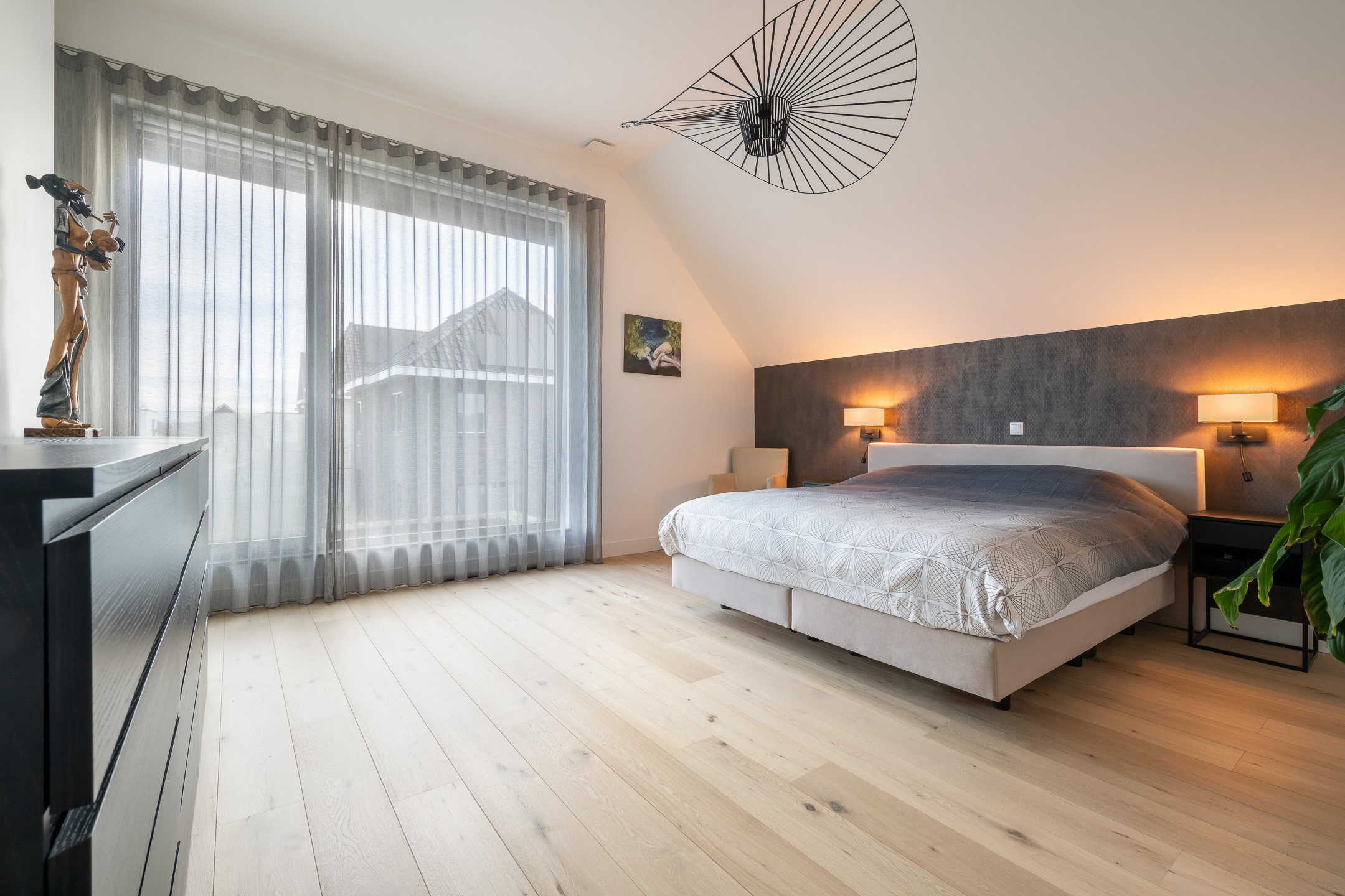 Aan de achterzijde bevindt zich een bijzonder mooie tweede slaapkamer over de volledige breedte van de woning. Dankzij de enorme glaspartij geniet deze kamer van een indrukwekkend vrij uitzicht over de achtergelegen velden. Dit is een kamer die door zijn ruimte en licht ook uitstekend dienst kan doen als werk- of hobbyruimte. De derde slaapkamer is eveneens volwaardig, licht en praktisch in te delen. De tweede badkamer is centraal op de verdieping gesitueerd en stijlvol afgewerkt met een wastafel met meubel en een glazen inloopdouche met tegelwand. Deze badkamer is ideaal voor logees of kinderen en sluit perfect aan bij het afwerkingsniveau van de rest van de woning.