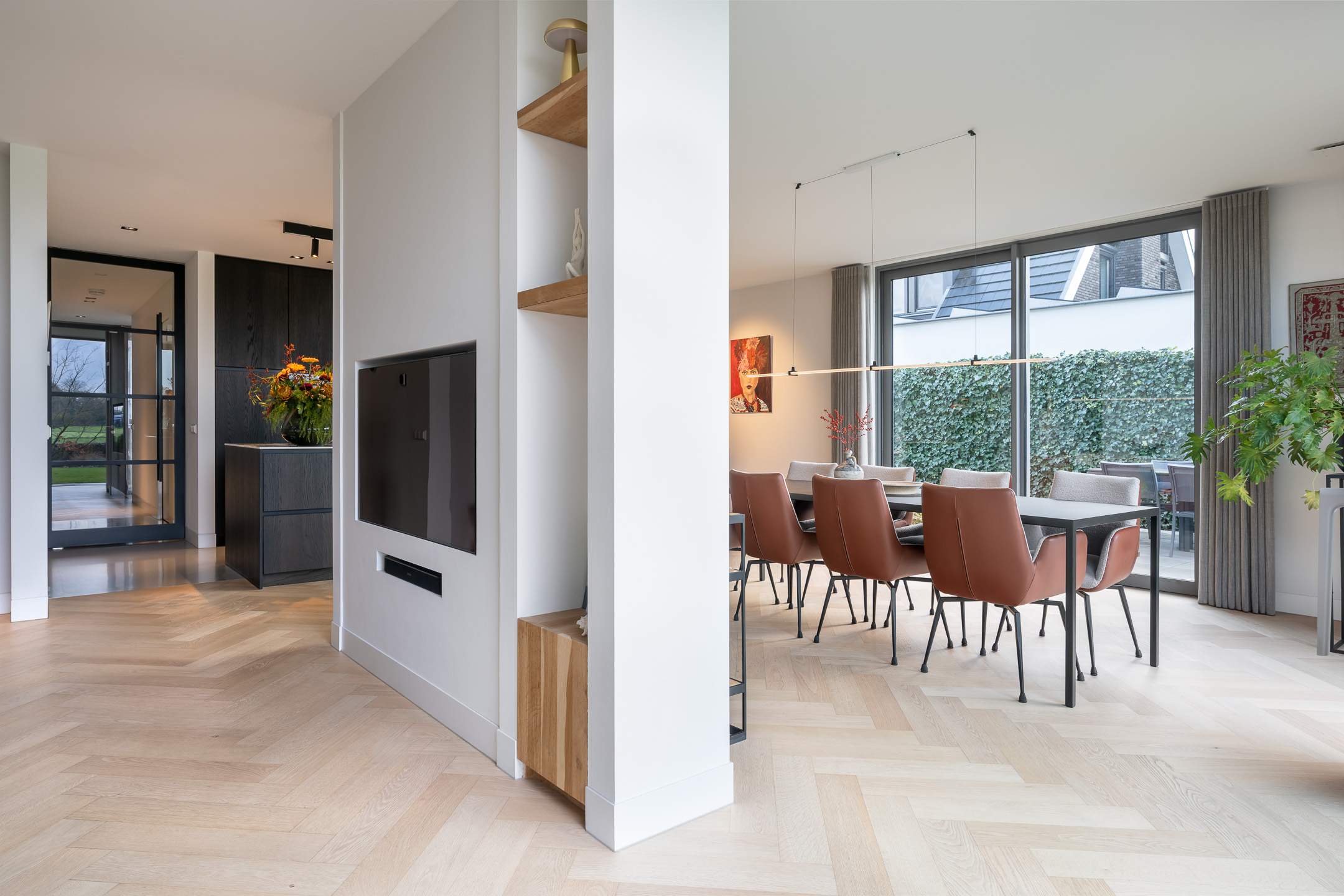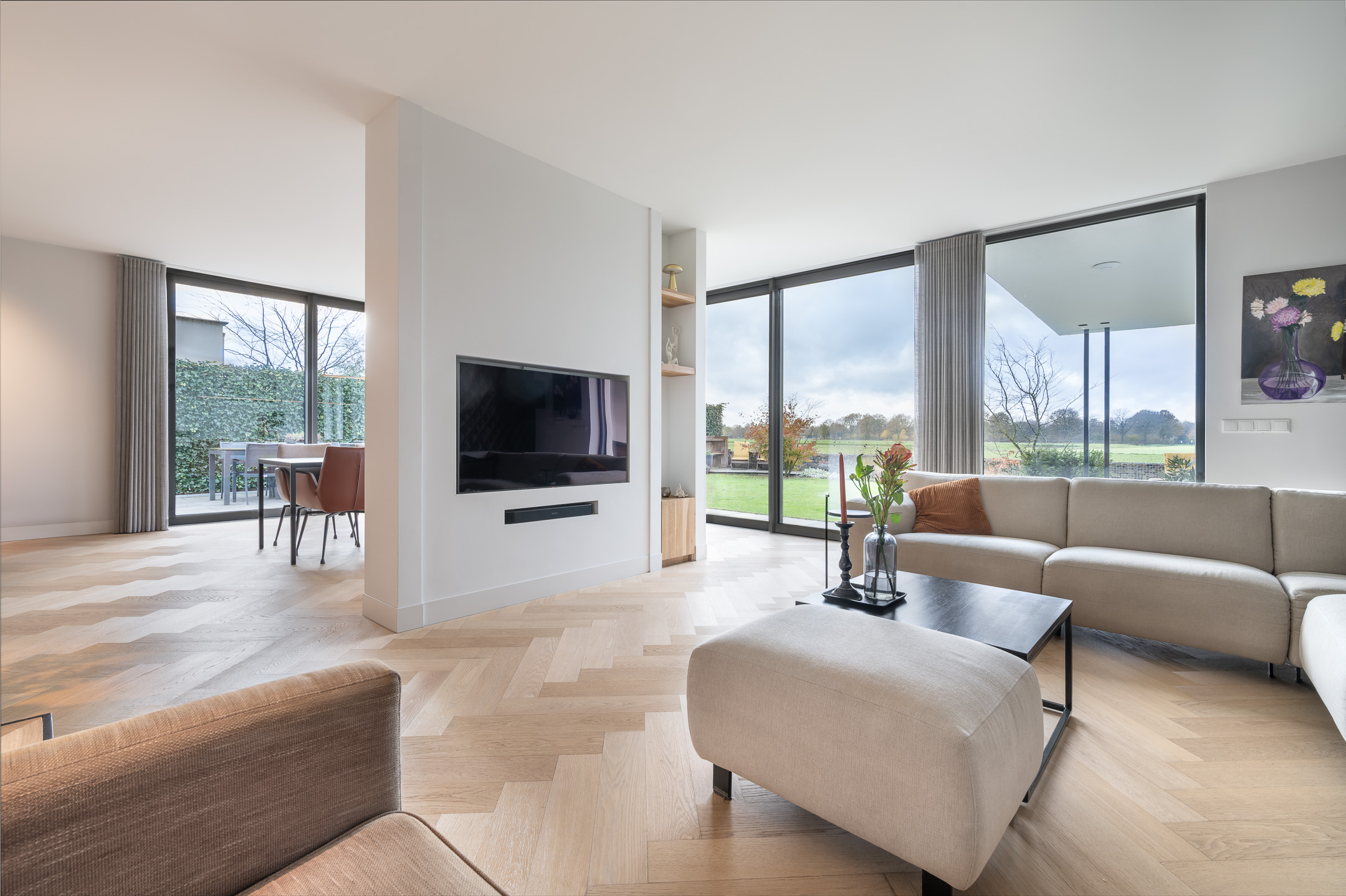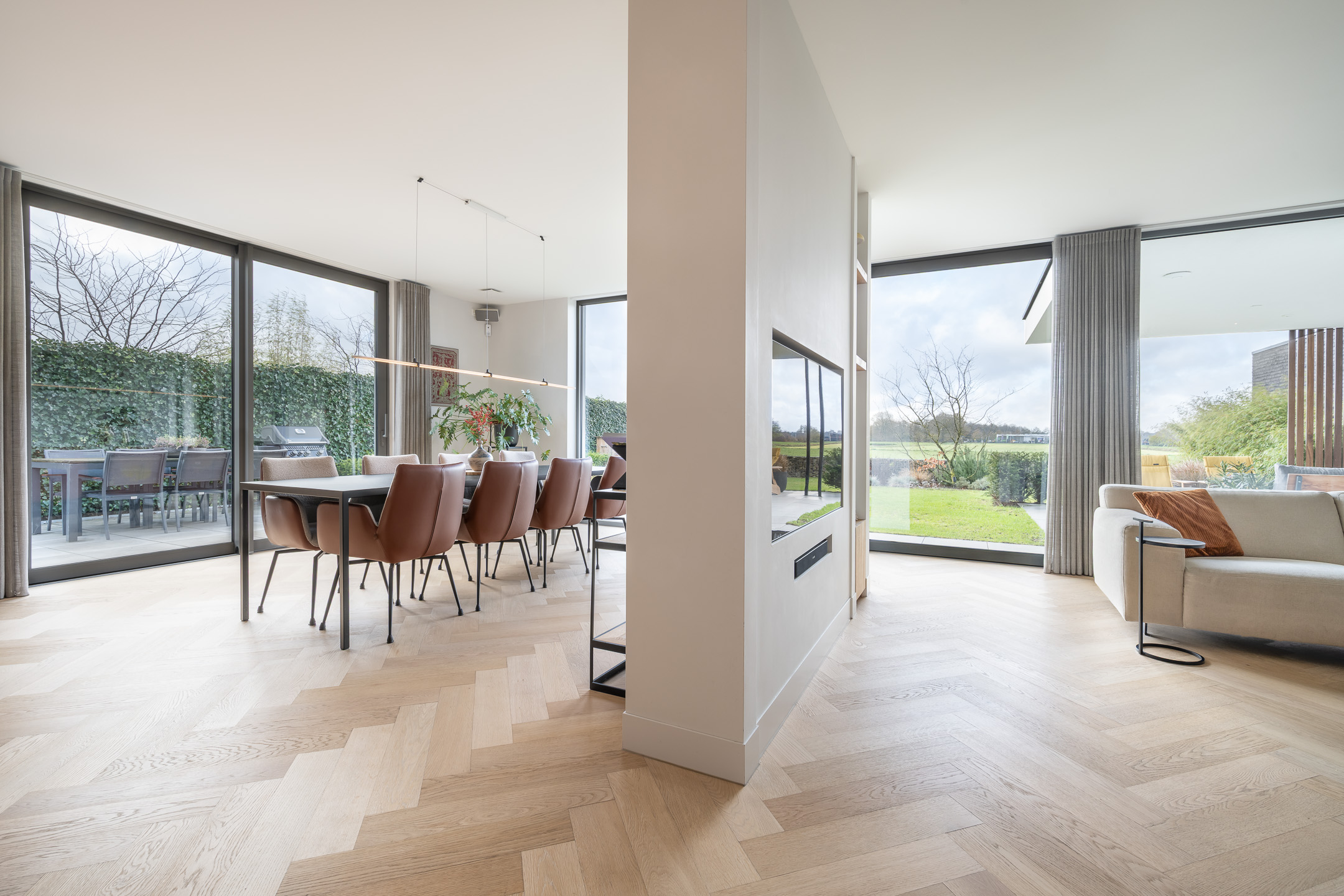 - Royale woonkamer met grote glazen puien, visgraatvloer en een maatwerk roomdividerwand;