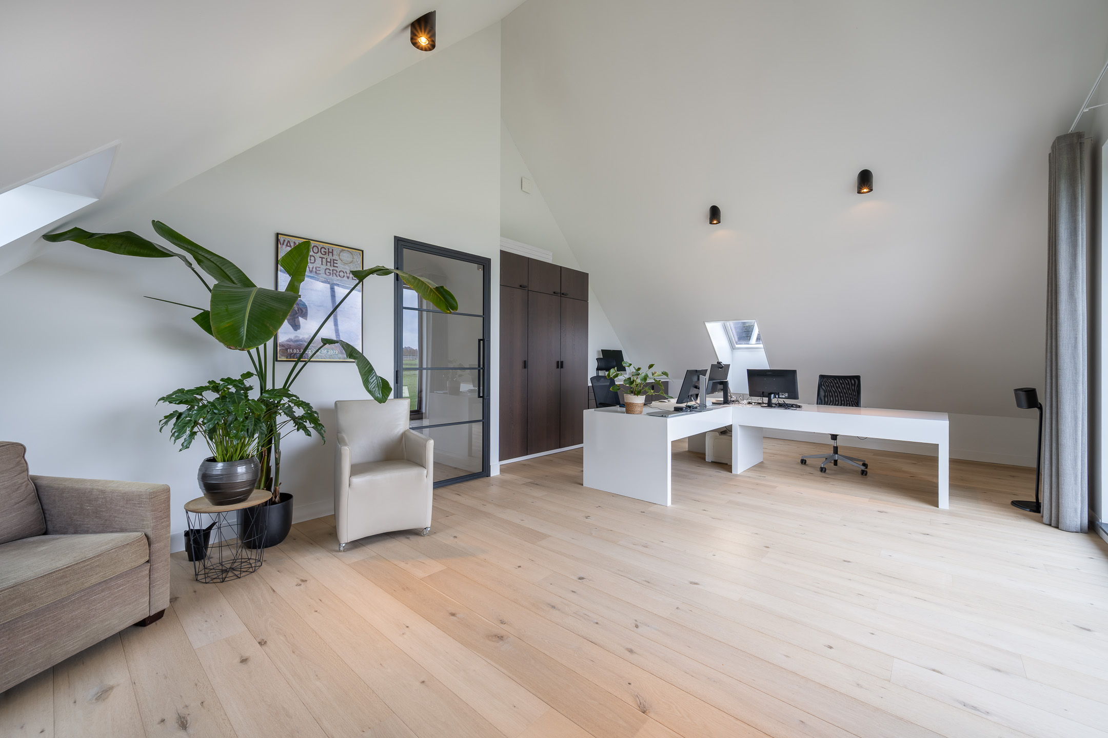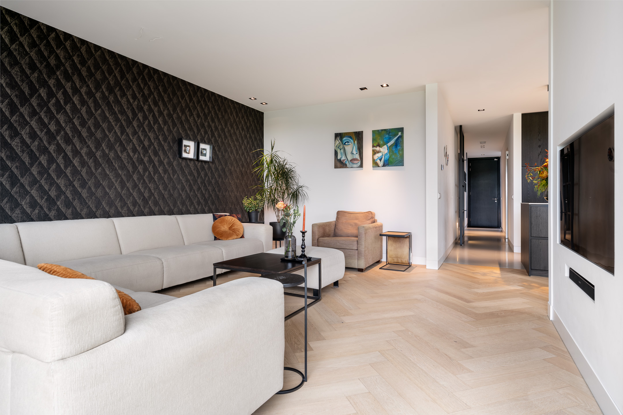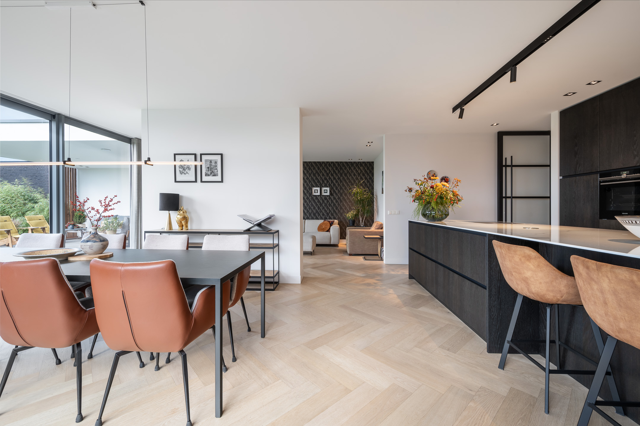 - Royale woonkamer met grote glazen puien, visgraatvloer en een maatwerk roomdividerwand;