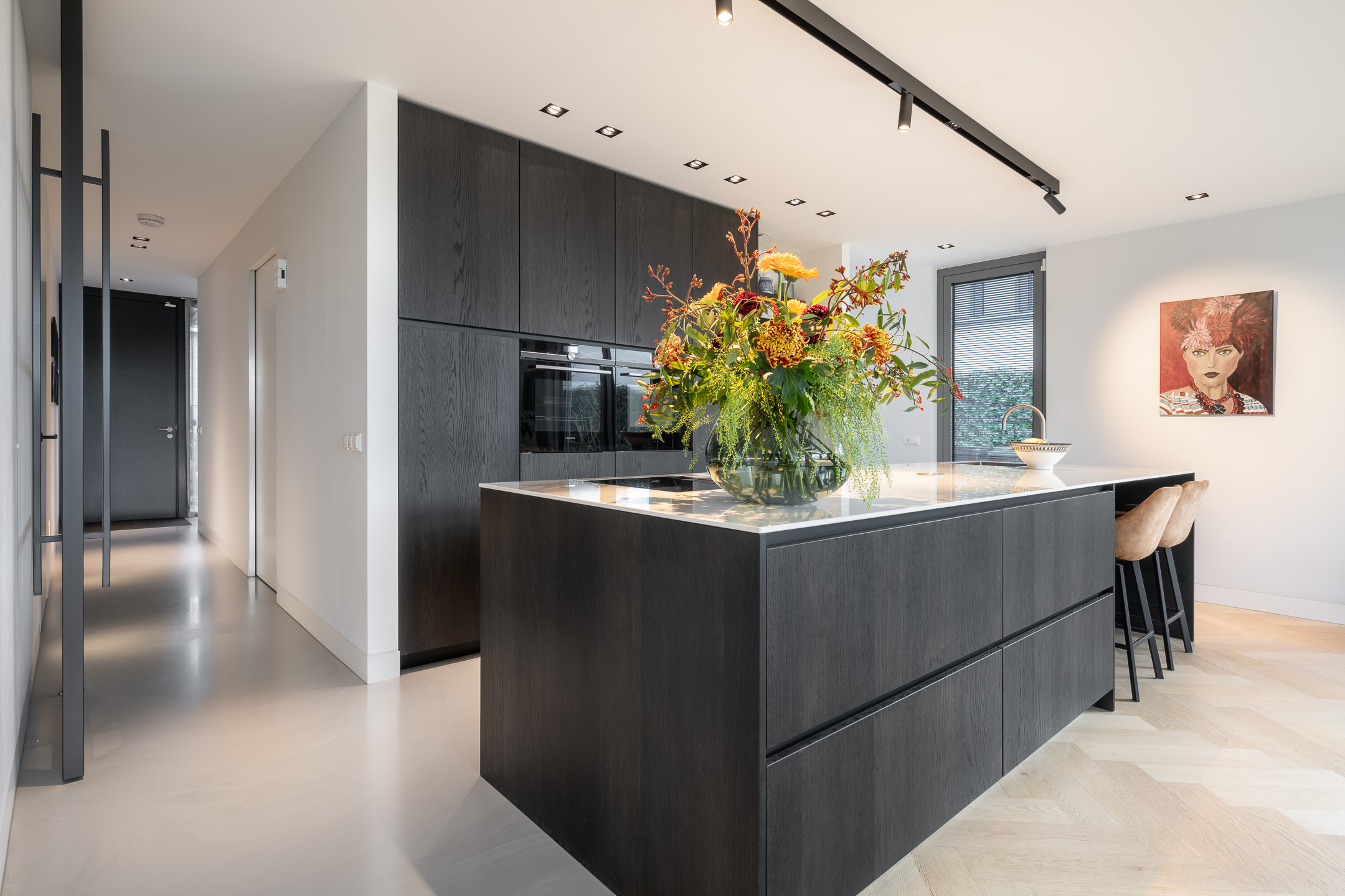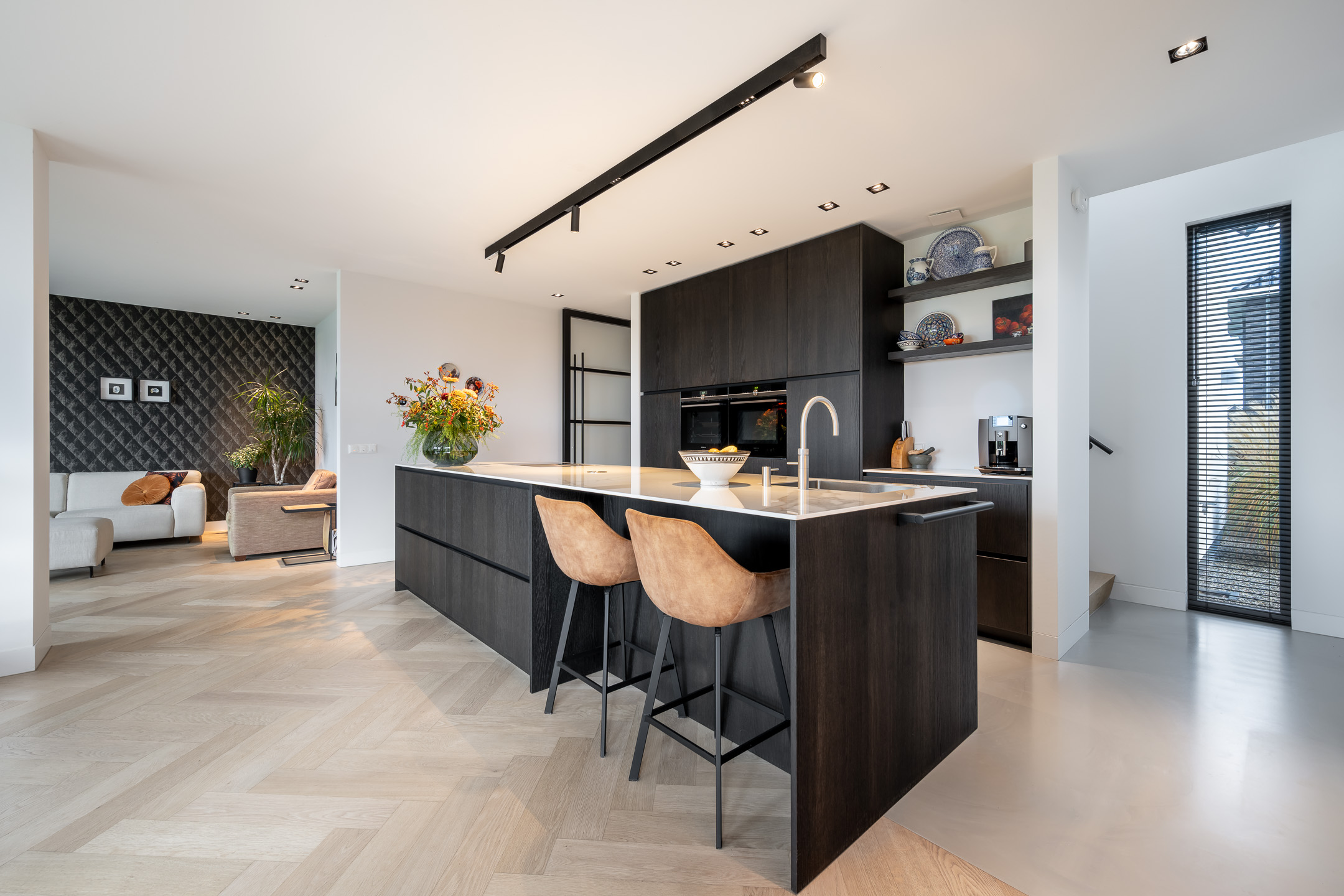 De leefkeuken is een echte eyecatcher: een royaal kook- en spoeleiland met baropstelling, Quooker, veel laderuimte en een stijlvolle donkere afwerking. De keuken beschikt daarnaast over een wijnklimaatkast, koffiehoek, oven, magnetron en vaatwasser. Het aangrenzende eetgedeelte biedt volop ruimte voor een grote tafel en heeft een prachtig contact met de tuin dankzij de glazen schuifpuien. Achter de keuken bevindt zich de trap naar de verdieping, met daaronder een praktische bergkast die vanuit de bijkeuken toegankelijk is. De bijkeuken is voorzien van een spoelbak en biedt extra opslag- en werkruimte, ideaal voor huishoudelijke apparatuur, provisie of als extra voorbereidingsruimte naast de keuken.