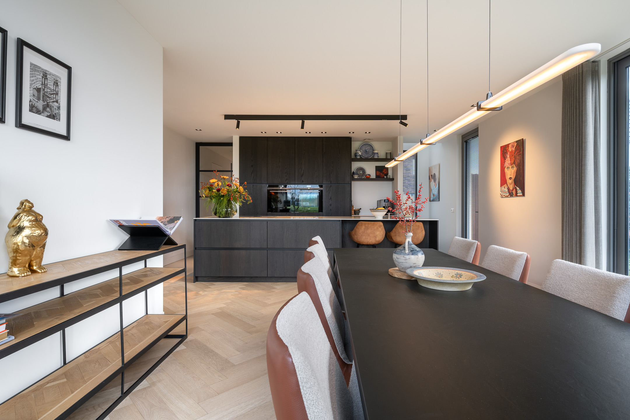 Via de overdekte entree kom je binnen in de ruime hal met modern toilet, meterkast en toegang tot de bijkeuken en de grote garage. De zwarte stalen deur naar de leefruimte vormt een stijlvol accent en leidt naar een indrukwekkend open geheel met licht, ruimte en zichtlijnen. De woonkamer en keuken lopen mooi in elkaar over, maar worden op stijlvolle wijze van elkaar gescheiden door een strak vormgegeven roomdividerwand met geïntegreerde televisie. Deze vaste wand zorgt voor een duidelijke indeling van de leefruimte, terwijl het open karakter en de zichtlijnen behouden blijven. De woonkamer is ruim opgezet en voorzien van grote raampartijen die zorgen voor een aangename lichtinval en een prachtig uitzicht op de achtertuin en de groene velden. De brede opstelling biedt alle ruimte voor een royale zithoek en maakt dit tot een comfortabele en sfeervolle leefruimte.