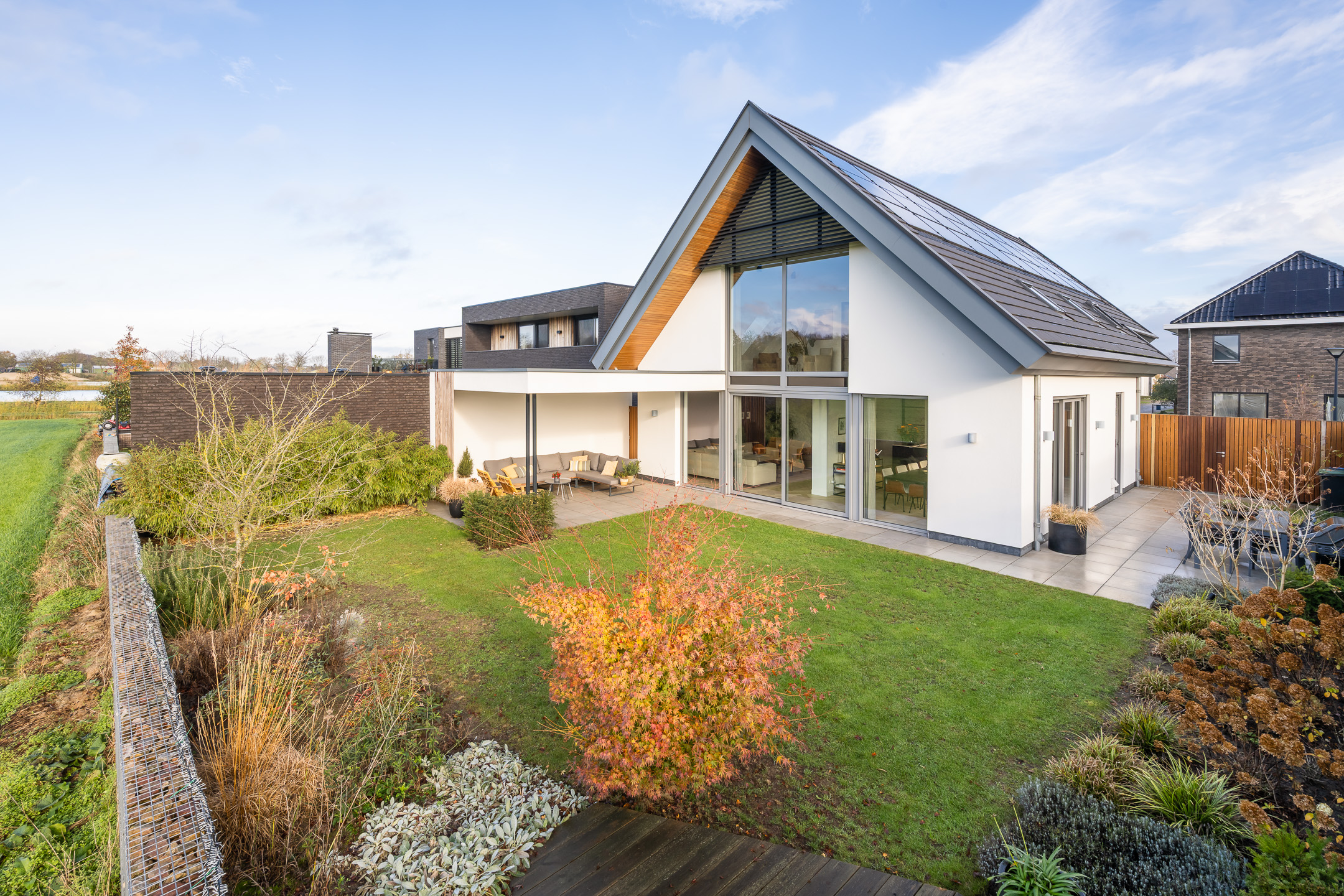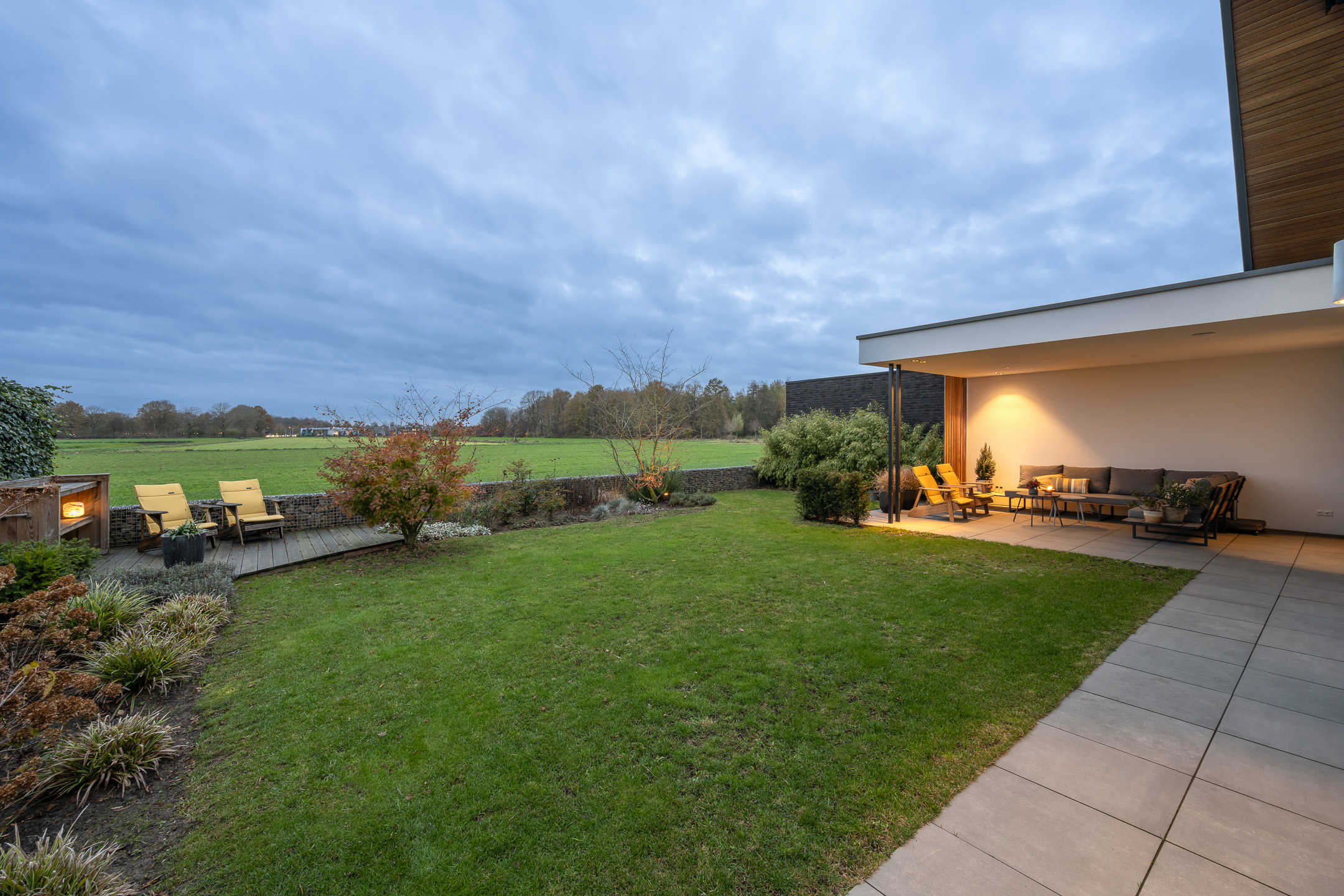 De tuin rondom de woning is met zorg aangelegd en sluit perfect aan op de architectuur van het huis. Aan de achterzijde geniet je van een weids, vrij uitzicht over de groene velden, een kwaliteit die in de wijk zeldzaam is. De grote raampartijen en schuifpuien verbinden binnen en buiten op een natuurlijke manier, waardoor het uitzicht in elk seizoen onderdeel wordt van de leefruimte.